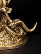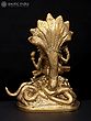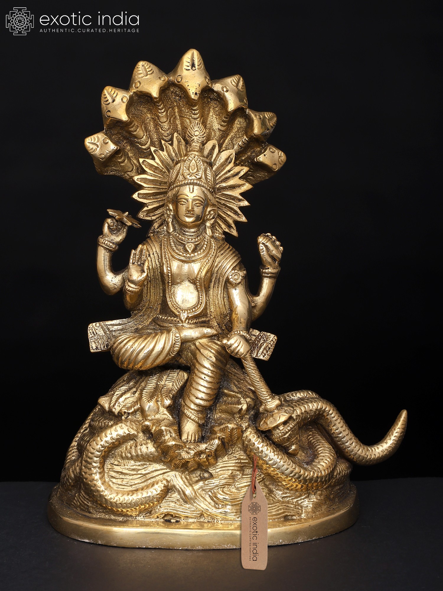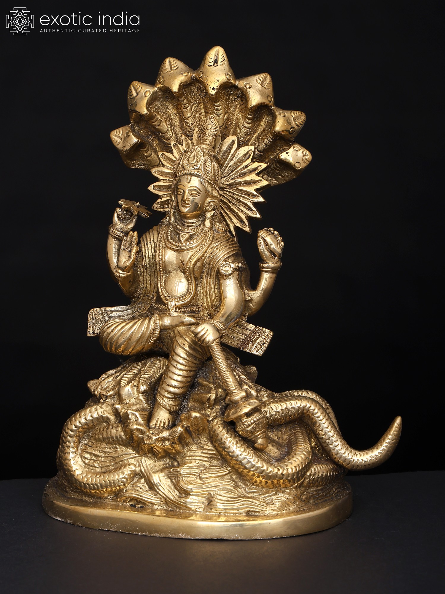 Majestically seated on the coils of the Adi-Shesha, which are dynamically presented as if floating in the waves of Kshirasagar, Lord Vishnu in this brass statue appears as the supreme preserver Lord of the Universe, as the one in whom all life takes refuge. The canopy of Shesha’s hoods provides Sri Vishnu with an imposing Chattra, which is adorned with delicate garments and ornaments. Using measured etched lines in the metal, the entire composition achieves a sense of intricacy. Composed and emanating a heavenly bliss, Vishnu animates the image, in this icon perfect to be established in your Puja ghar.