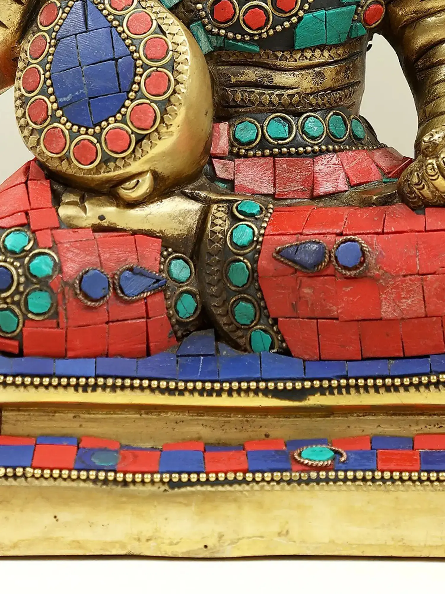 The artistry of this statue is further enhanced by its intricate inlay work. Vibrant red, blue, and turquoise stones are meticulously set into the brass, creating a rich tapestry of color that accentuates the divine form. The turban, the ornate clothing, and the musical instrument (likely a tambura or similar stringed instrument associated with devotional singing) are all adorned with these captivating gemstones. This inlay technique, often seen in traditional Indian artifacts, not only adds visual appeal but also signifies the preciousness and reverence associated with the subject. The choice of colors – red for passion and energy, blue for divinity and peace, and turquoise for healing and protection – creates a harmonious and auspicious aesthetic.