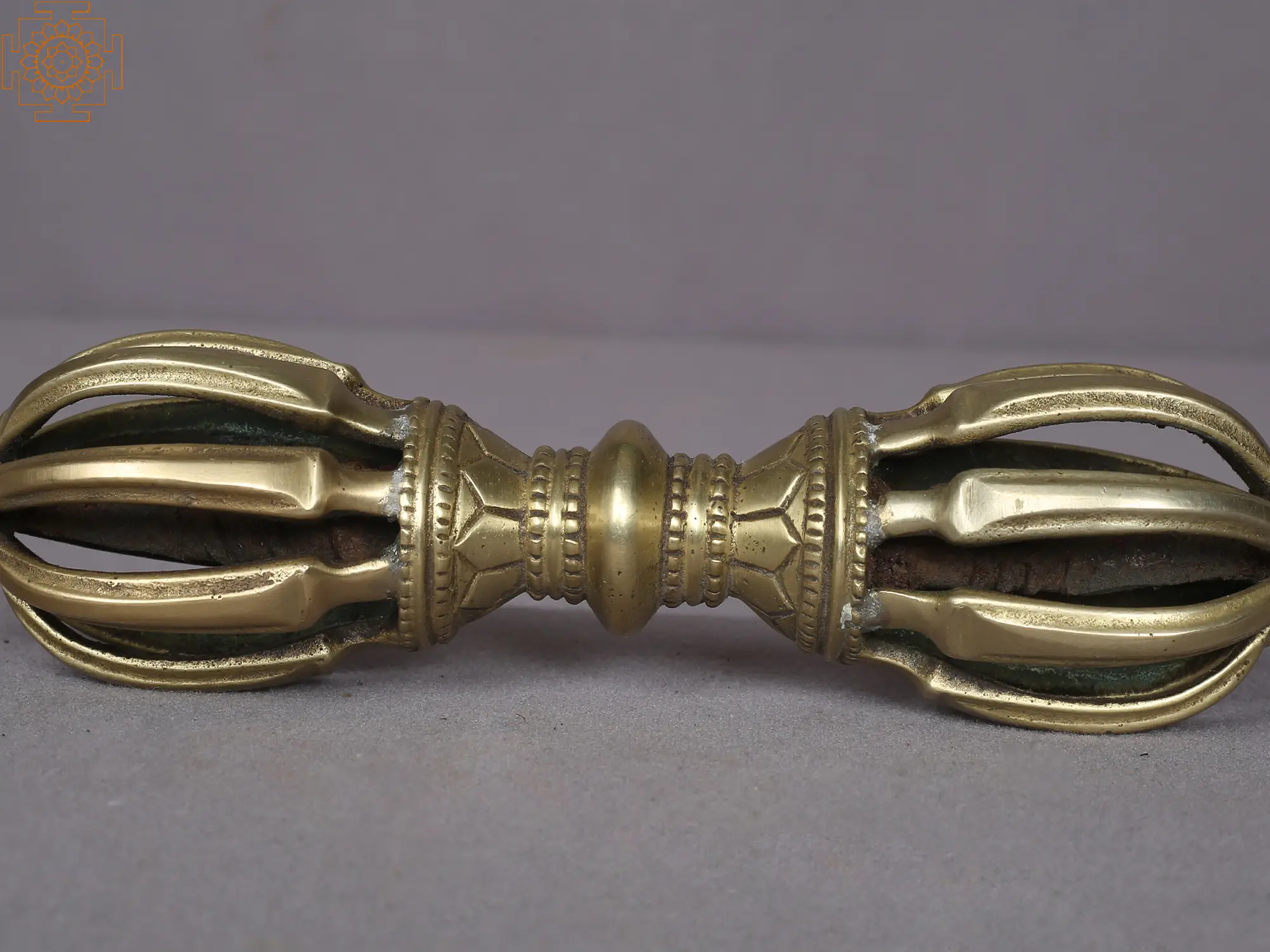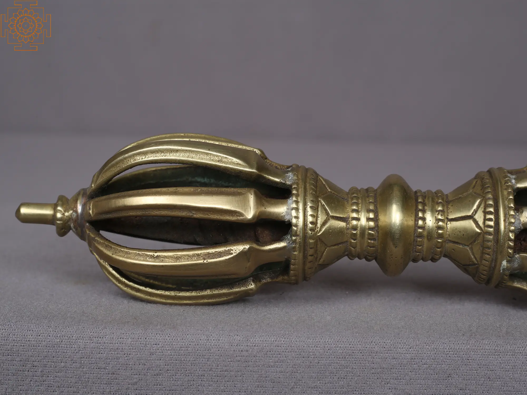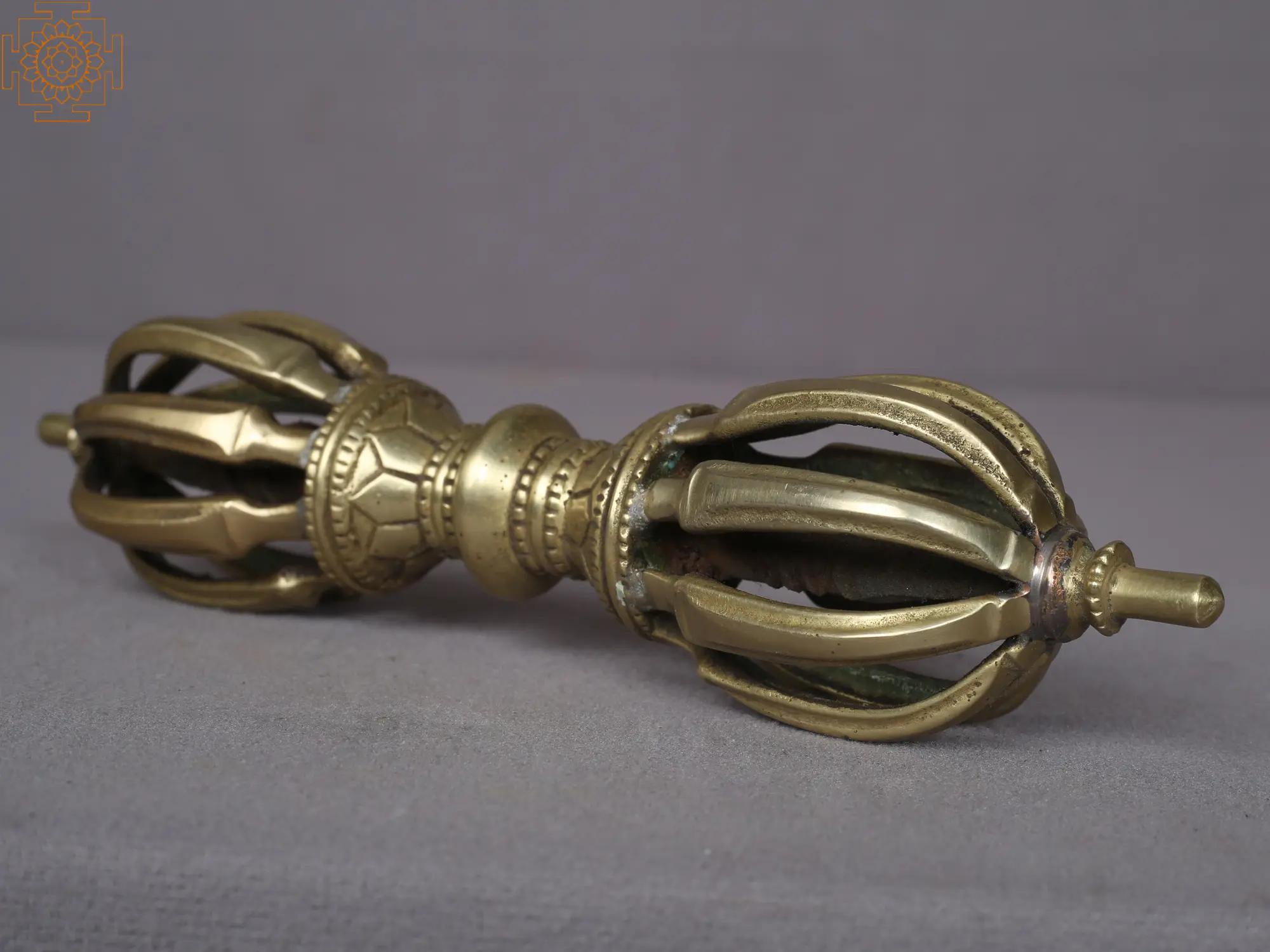 The Nine-Pronged Vajra, often referred to as the Nine-Pronged Ritual Object or Dorje Nubchu is a ceremonial implement in Tibetan Buddhism. It consists of a central shaft with nine prongs, each radiating inward like lotus petals. The symbolism of the nine prongs corresponds to various aspects of Buddhist philosophy and cosmology.