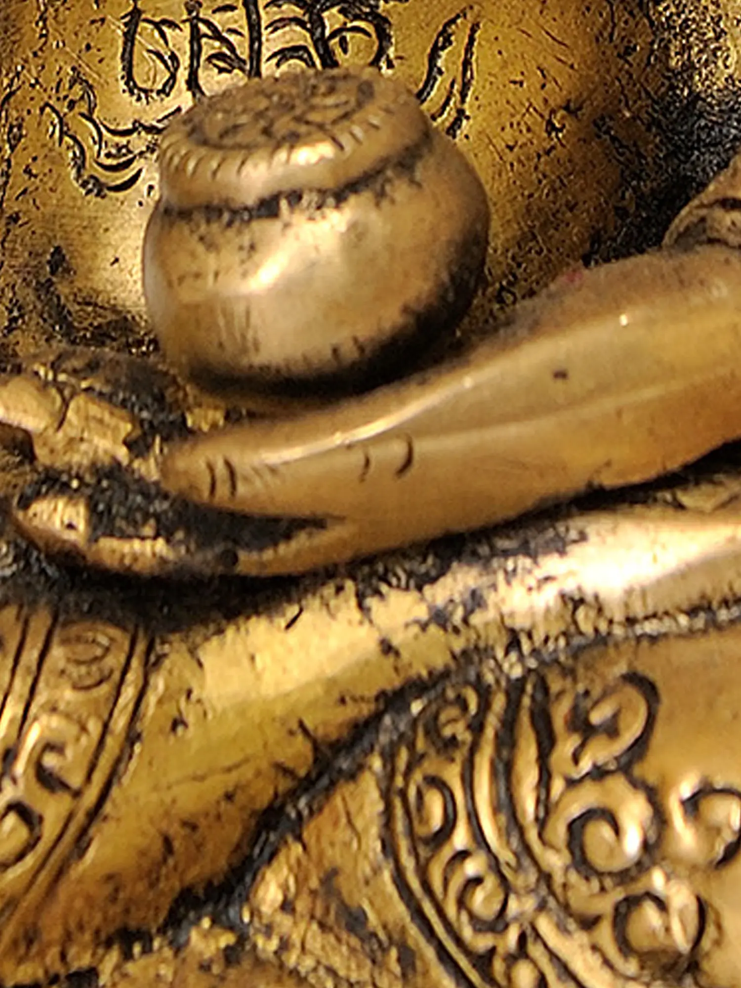 This exquisite brass statue depicts the serene countenance of the Buddha in the Bhumisparsha Mudra, a gesture of profound significance. The term "Bhumisparsha" translates to "earth-touching," and this mudra is deeply rooted in the narrative of the Buddha's enlightenment under the Bodhi tree. According to Buddhist lore, as Siddhartha Gautama was on the cusp of achieving enlightenment, he was challenged by Mara, the demon of illusion and desire, who sought to prevent him from realizing his final awakening. Mara sent his seductive daughters and a formidable army to tempt and intimidate Siddhartha. However, Siddhartha remained steadfast. In this critical moment, he is depicted extending his right hand downwards, with the fingertips lightly touching the earth. This gesture served as a powerful invocation, calling upon the Earth Goddess, Bhumi, as his witness to his unwavering resolve and past good deeds, which had led him to this point of liberation. The earth itself is said to have vibrated, acknowledging his truth and virtue, and repelling Mara's forces. This act symbolizes the triumph of wisdom and compassion over temptation and delusion, and the ultimate realization of Nirvana.