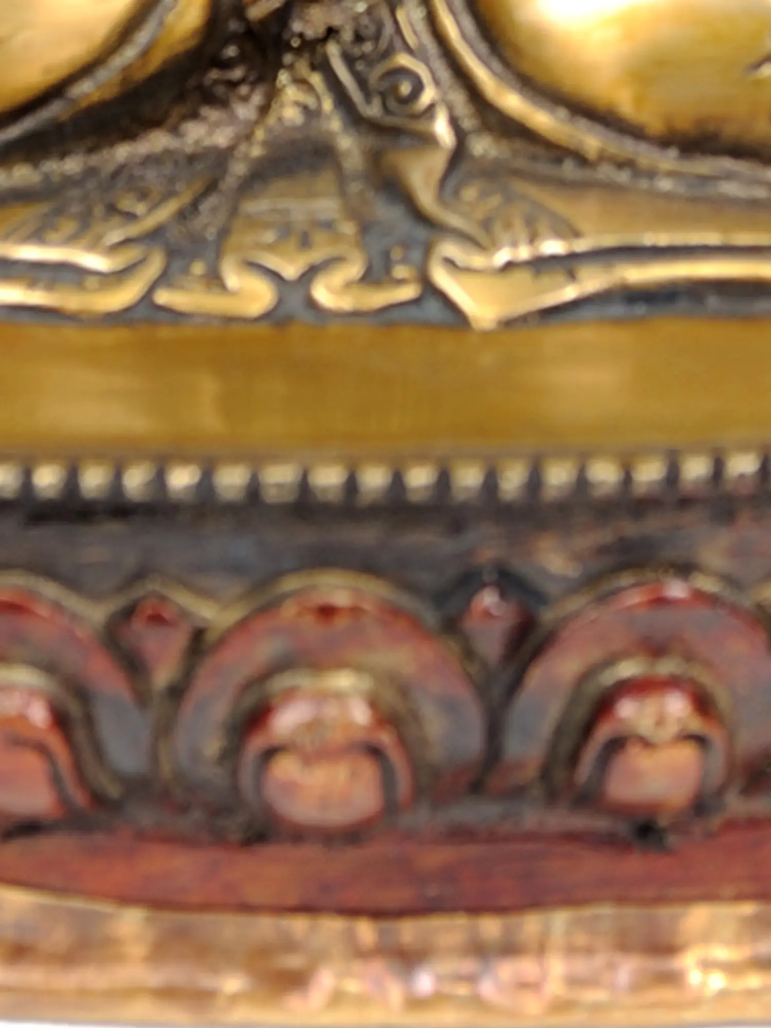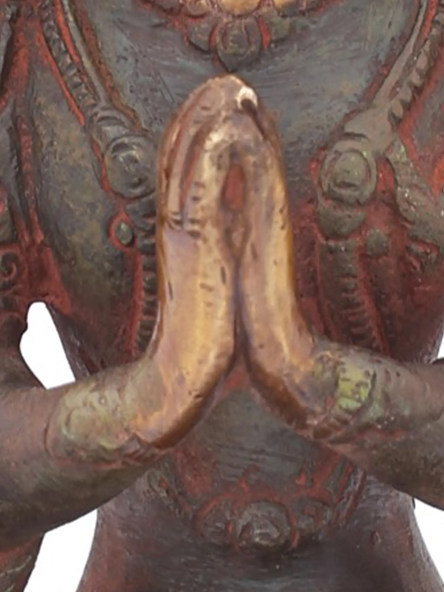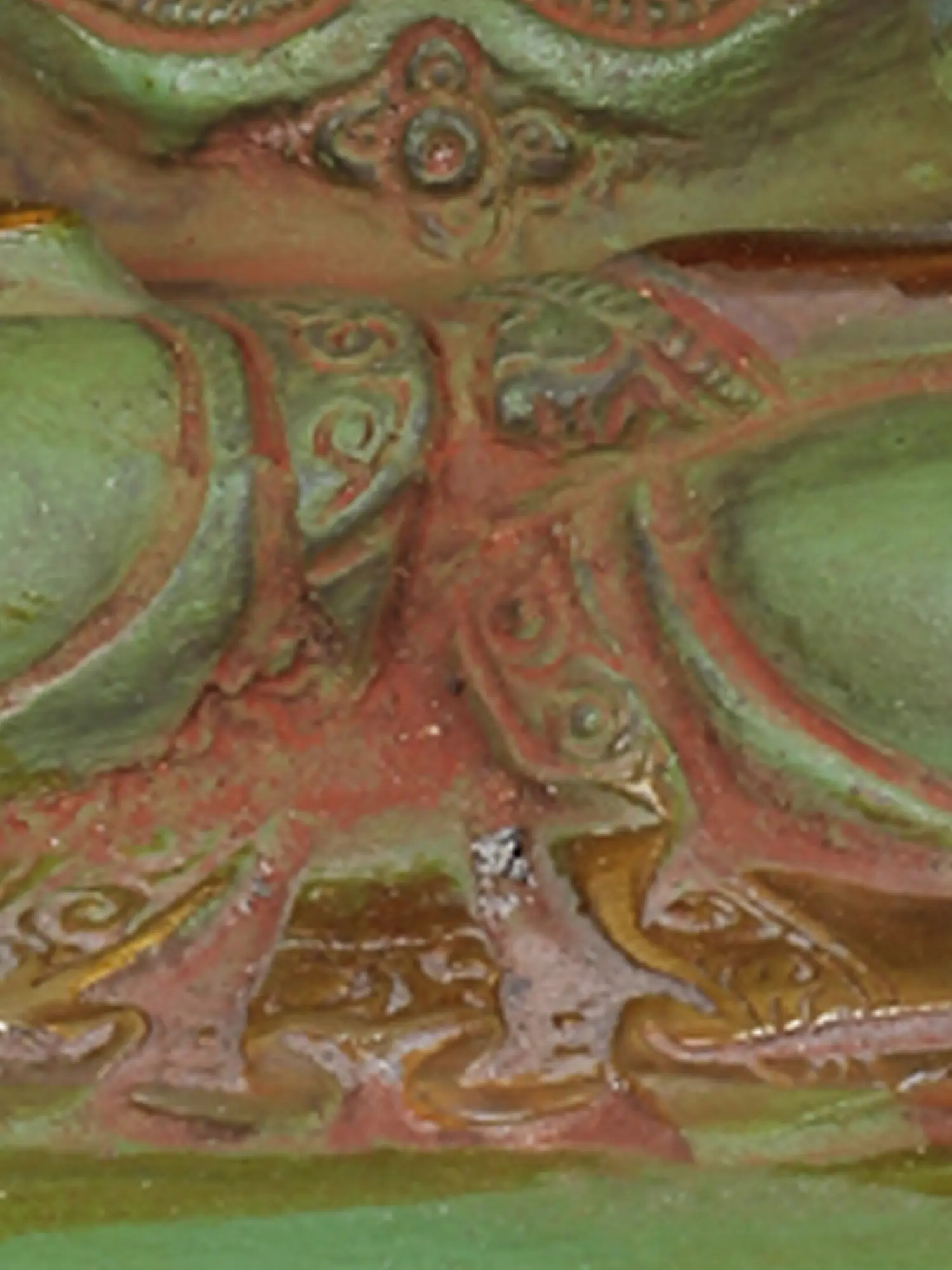 According to legend, Chenrezig wept tears of compassion upon witnessing the suffering of sentient beings. From these tears, a beautiful lotus bloomed, from which he arose. He vowed to remain in existence until all beings are free from suffering, making him an eternal source of comfort and guidance. The four arms of this representation symbolize his omnipresence and his ability to offer aid in all directions. His primary hands are clasped in the anjali mudra, a gesture of prayer and reverence, signifying his dedication to the welfare of all. In his upper right hand, he often holds a crystal rosary, symbolizing the continuous chanting of mantras for the liberation of beings, and in his upper left, a lotus flower, representing purity and enlightenment. The intricate detailing on his crown and adornments further accentuates his divine status and noble bearing.