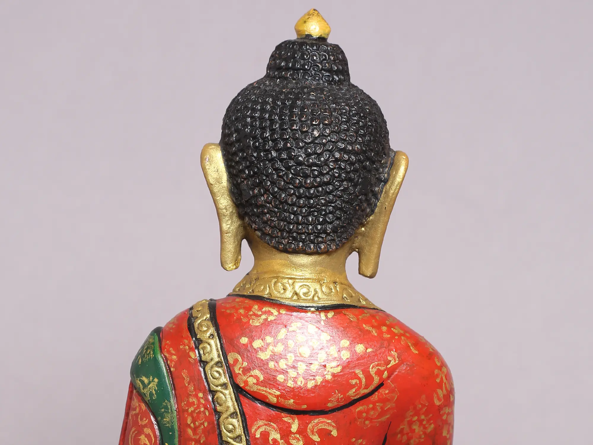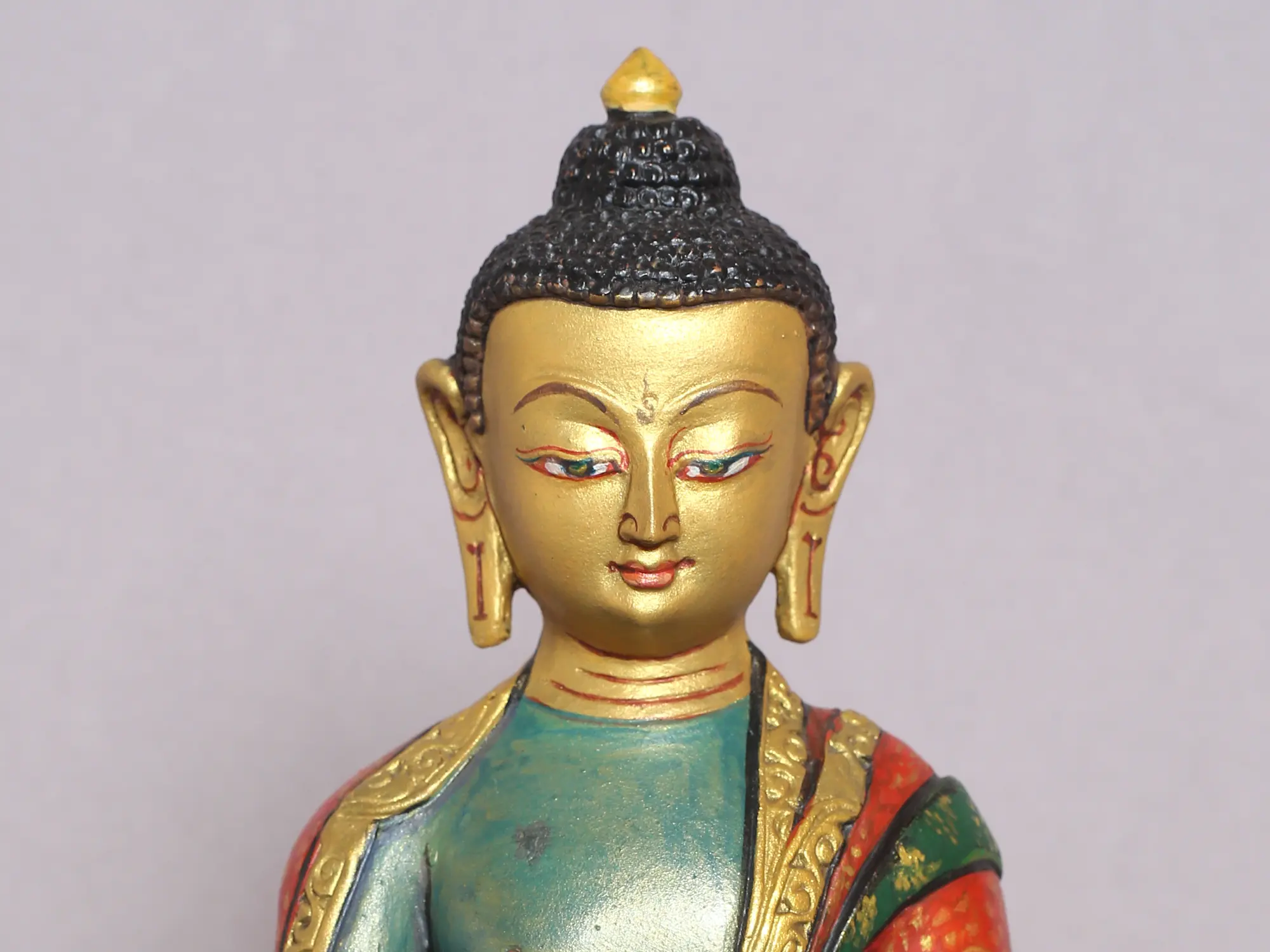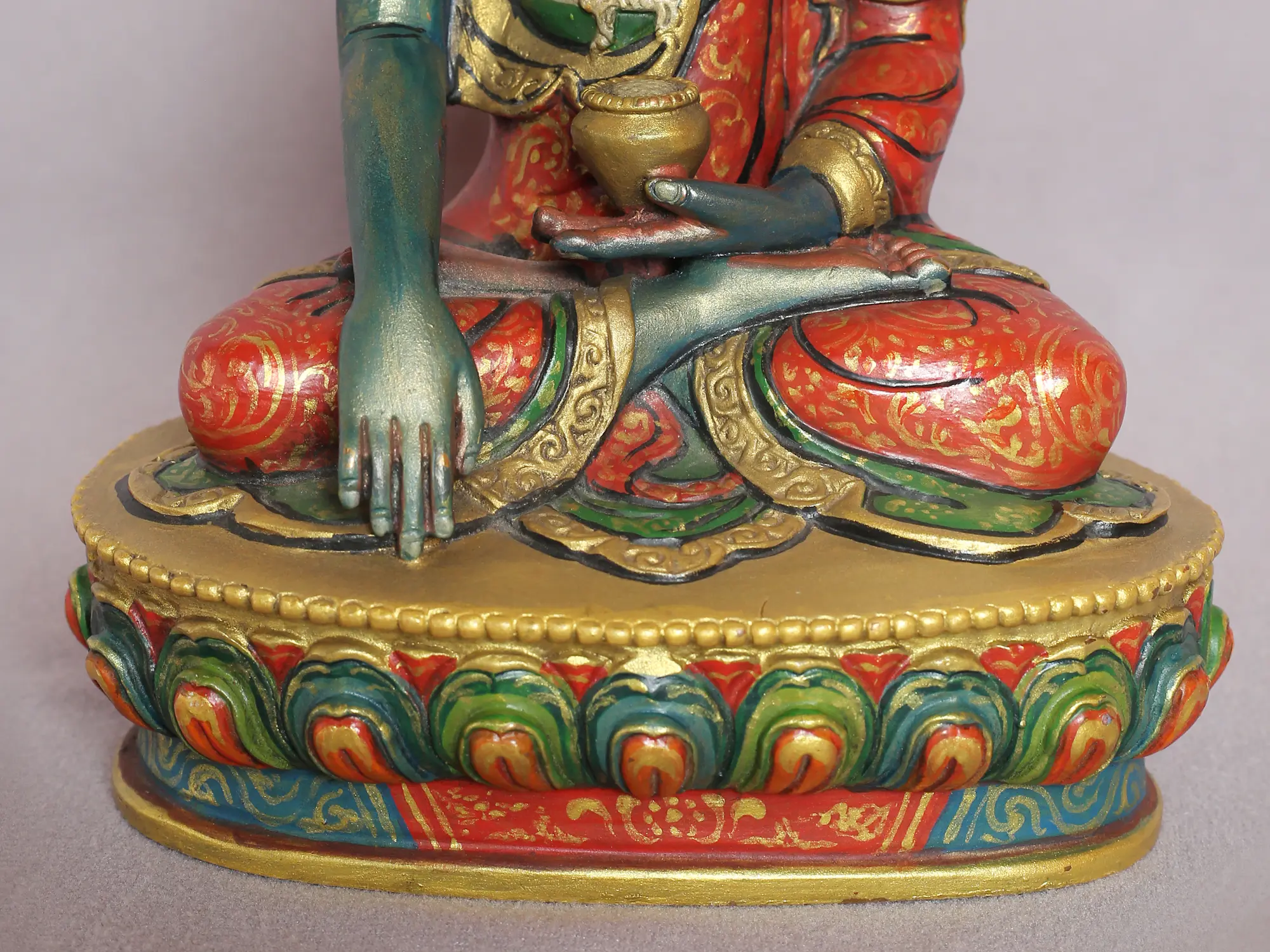 One of the Five Dhyani Buddhas (Buddhas of Wisdom), Akshobhya Buddha in Buddhism is the representation of pure wisdom which is immovable and deep. In this richly adorned copper statue from Nepal, Akshobhya appears in his popularly revered form, with a blue-hued body, which signifies his association with water and its depth and profound virtues. The features of Akshobhya match that of Bhumisparsha Buddha- monk’s garments, coiled hair, meditative face, elongated earlobes, right hand dangling to the Earth, and left carrying the alms bowl. He sits on a lotus seat which is decorated in the classic colors of Tibetan Buddhism.