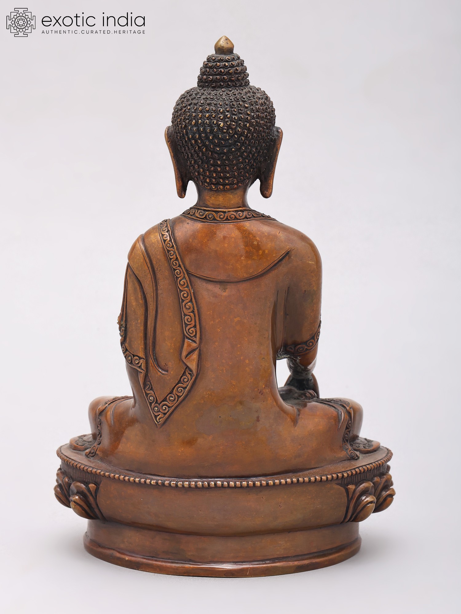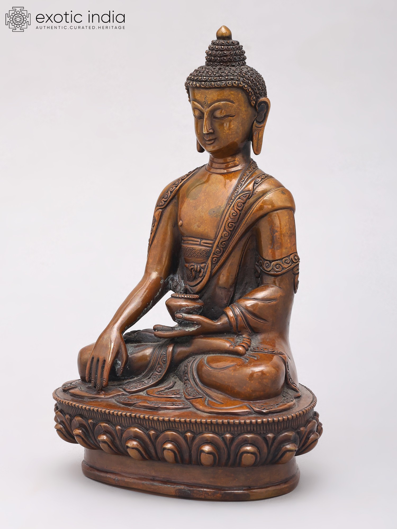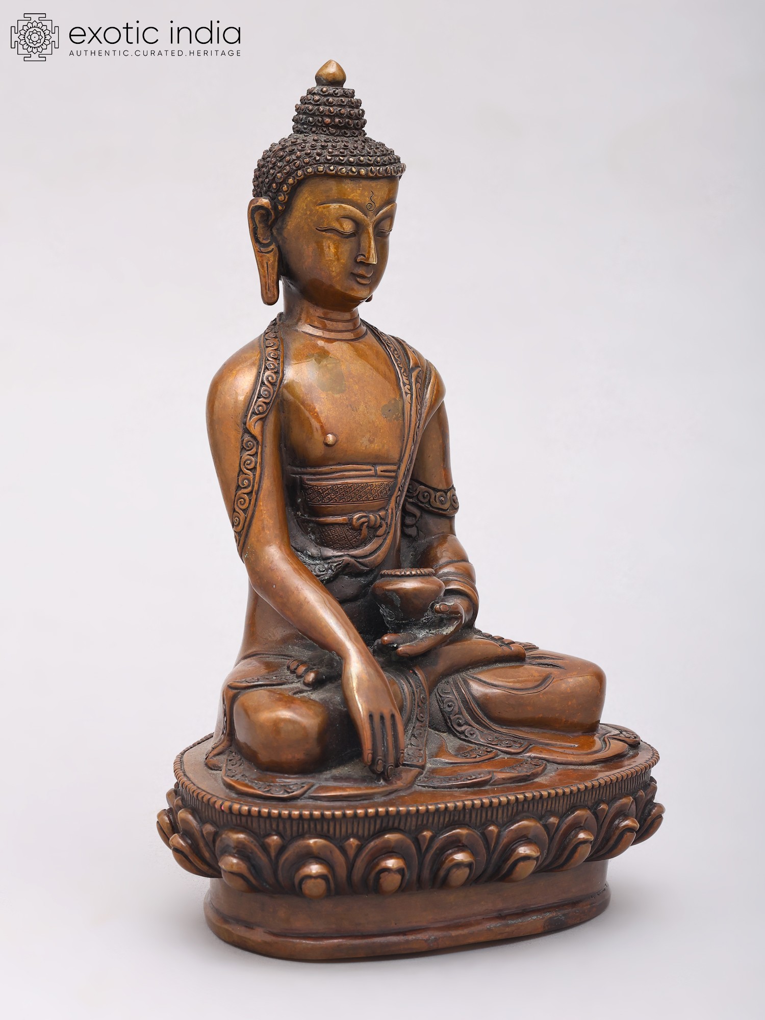 Meticulously crafted from high-quality copper, this statue embodies the artistry and spiritual devotion characteristic of Nepalese metalwork. The rich patina of the copper lends a timeless quality to the sculpture, hinting at its journey through the ages. The serene expression on the Buddha's face, the intricate detailing of his monastic robes adorned with delicate patterns, and the serene posture all contribute to an aura of peace and tranquility. The base, designed as a lotus flower, further enhances the spiritual symbolism, as the lotus represents purity, enlightenment, and rebirth, emerging unstained from the mud. This sculpture is more than just a decorative piece; it is an object of contemplation, designed to inspire inner peace and mindfulness.