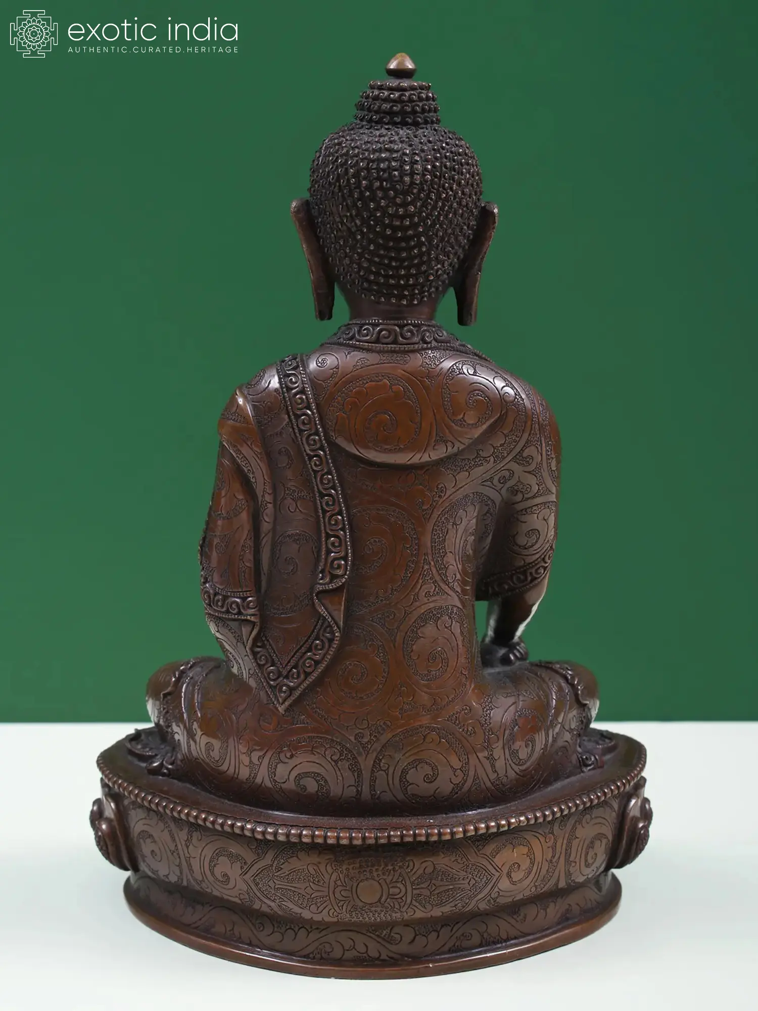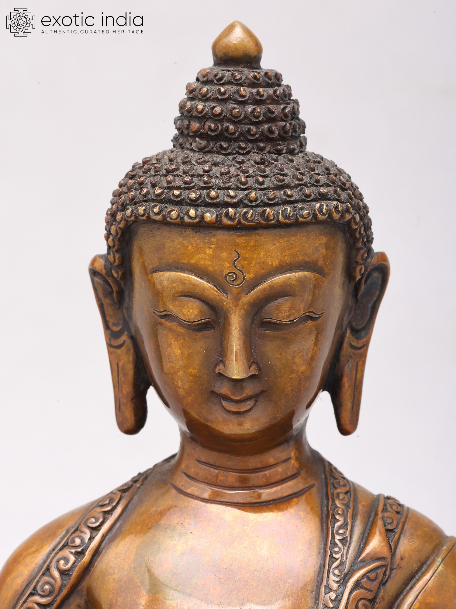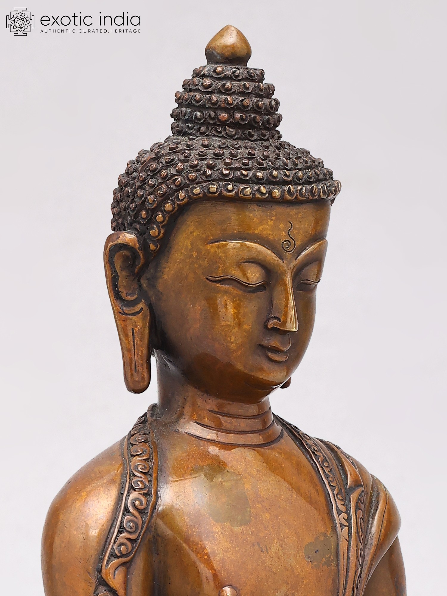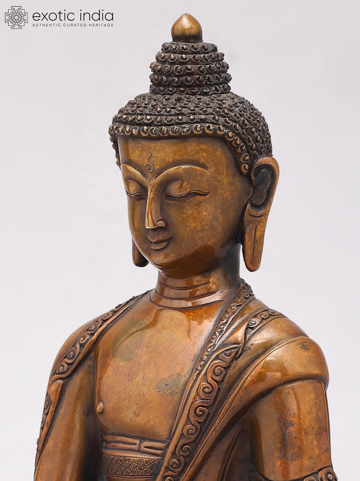 Meticulously crafted from high-quality copper, this statue embodies the artistry and spiritual devotion characteristic of Nepalese metalwork. The rich patina of the copper lends a timeless quality to the sculpture, hinting at its journey through the ages. The serene expression on the Buddha's face, the intricate detailing of his monastic robes adorned with delicate patterns, and the serene posture all contribute to an aura of peace and tranquility. The base, designed as a lotus flower, further enhances the spiritual symbolism, as the lotus represents purity, enlightenment, and rebirth, emerging unstained from the mud. This sculpture is more than just a decorative piece; it is an object of contemplation, designed to inspire inner peace and mindfulness.