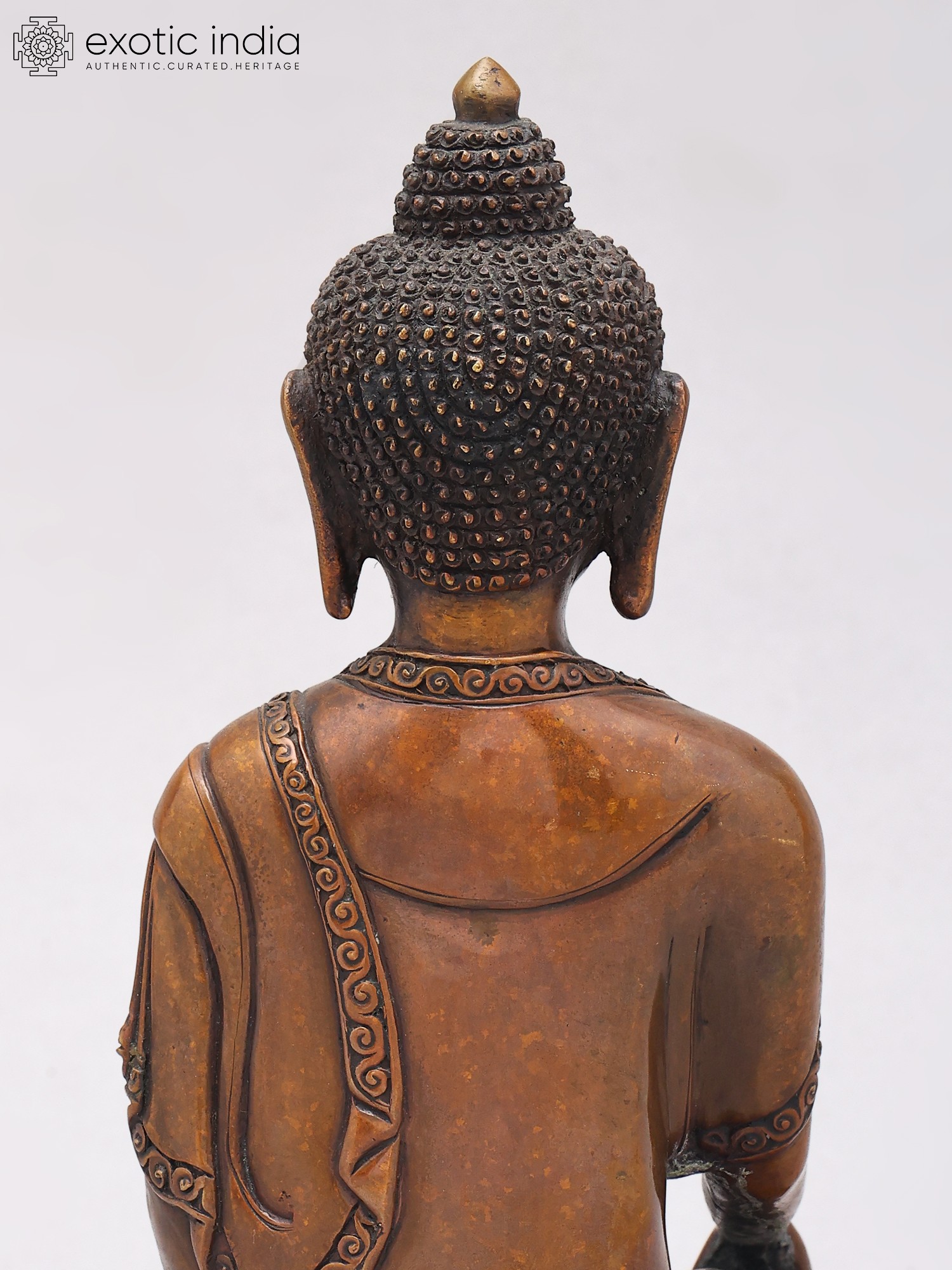 This exquisite copper sculpture captures the profound moment of Gautam Buddha's enlightenment, as depicted in the Bhumisparsha mudra, or the earth-touching gesture. In this sacred posture, the Buddha's right hand rests on his right knee, fingertips gently touching the earth. This gesture symbolizes his triumph over the temptations of Mara, the demon king, who tried to dissuade him from attaining enlightenment. With his hand as a witness, the Buddha called upon the Earth itself to bear testament to his worthiness and the purity of his intentions. This act signifies his deep connection to the earthly realm and his understanding of its interconnectedness.