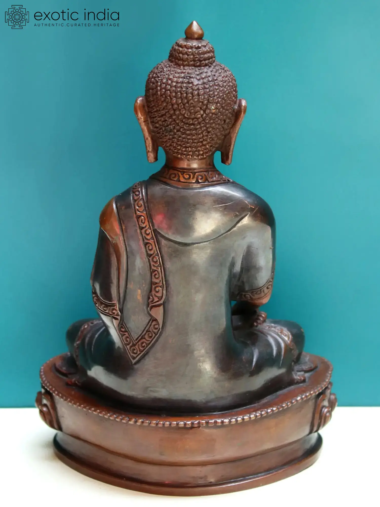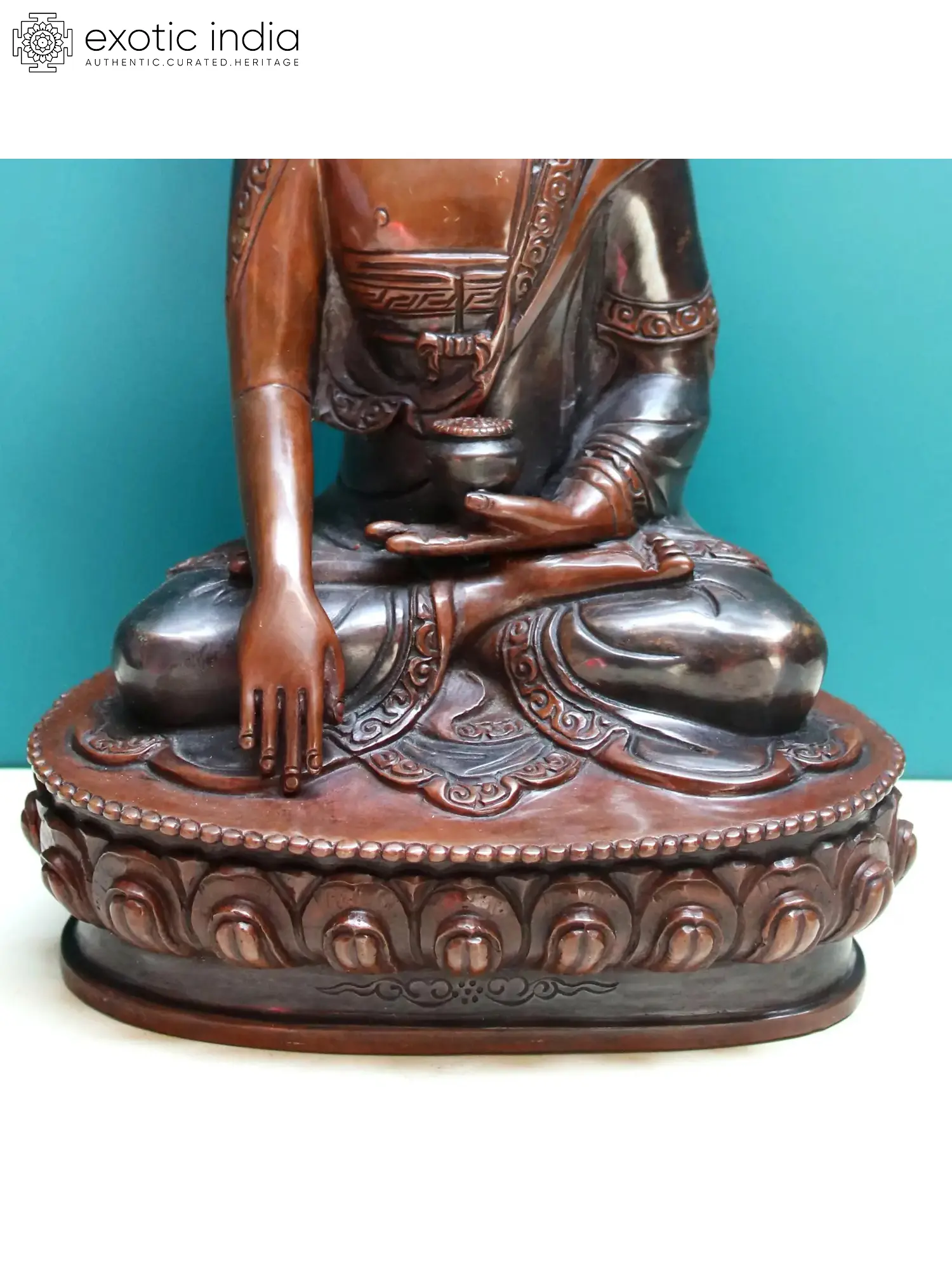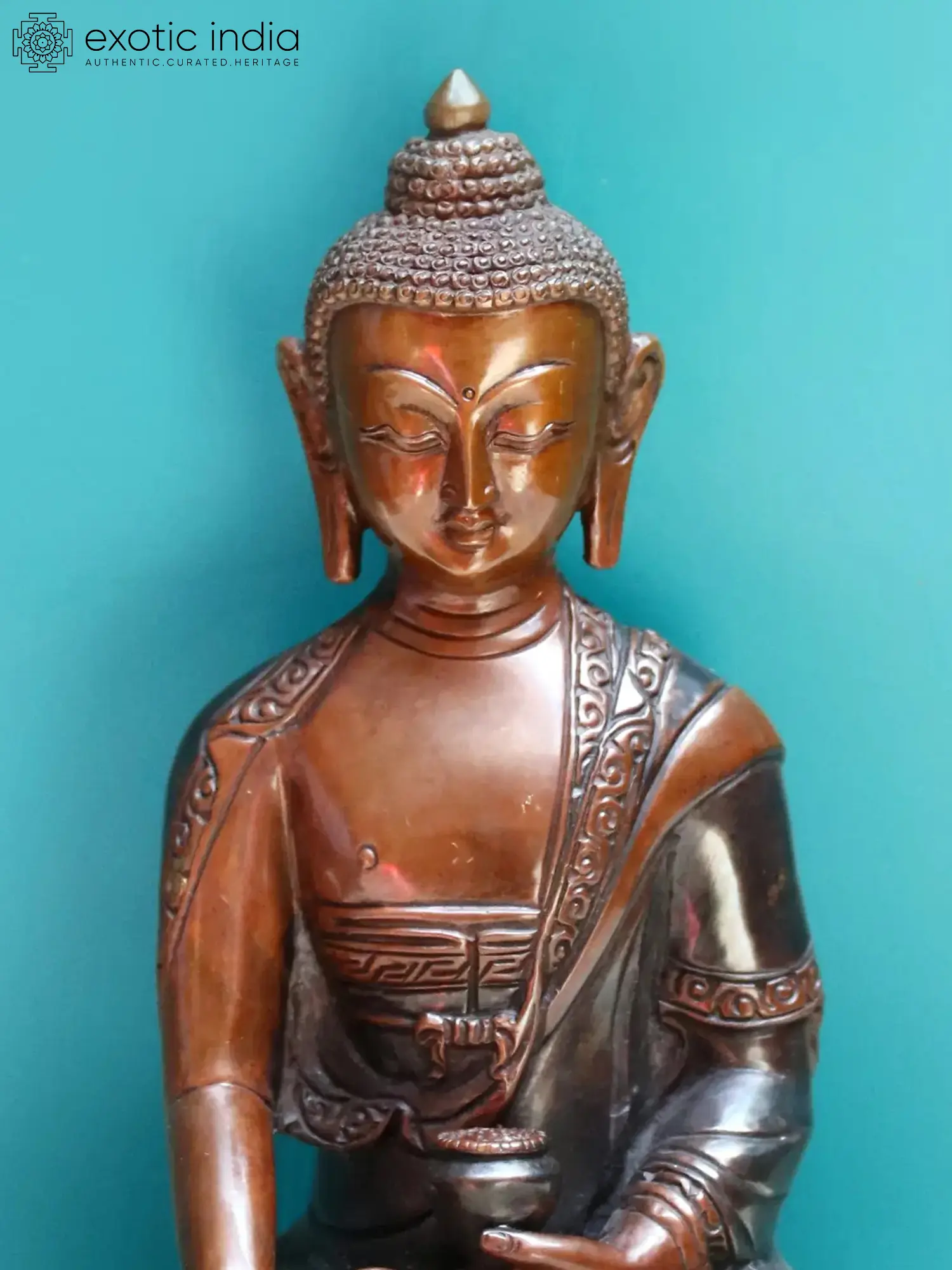 Crafted from the molten embrace of copper, this wonderful work of art gleams with a divine radiance, uttering tales of wisdom from the ancient past. Like a brilliant beacon of Knowledge, this embodiment of serenity sits gracefully on the pedestal podium, depicting Bhumisparsha Mudra and carrying a bowl of healing in his left hand. A profound connection is made by gently touching the holy ground with fingertips that are reaching down to caress it, uniting human life with the infinite knowledge of the cosmos. Every shape of the Buddha’s figure emits a celestial elegance that entices the eye into a beguiling dance of delicacy and serenity. In this sacred artwork, the senses dance amidst the celestial melodies, and a transformative journey begins, illuminating the path towards enlightenment.