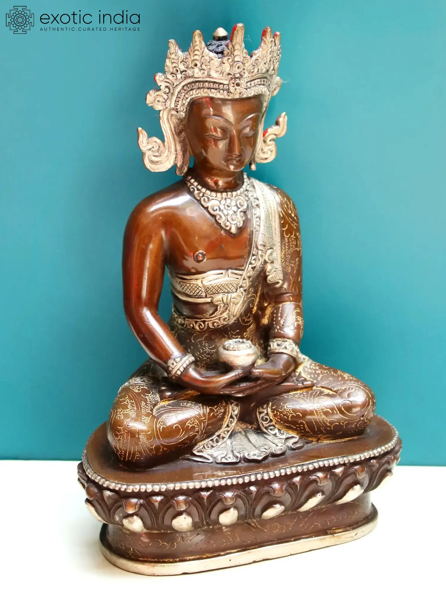 In the Buddhist artistic tradition, Crowned Buddha represents the Enlightened One as the ultimate ruler of the cosmos, the embodiment of the ideal of Chakravartin who has triumphed not through the might of his sword but through the soft roar of Dhamma. Buddha is enthroned as the Universal monarch on a blooming lotus throne in this Nepalese statue.
