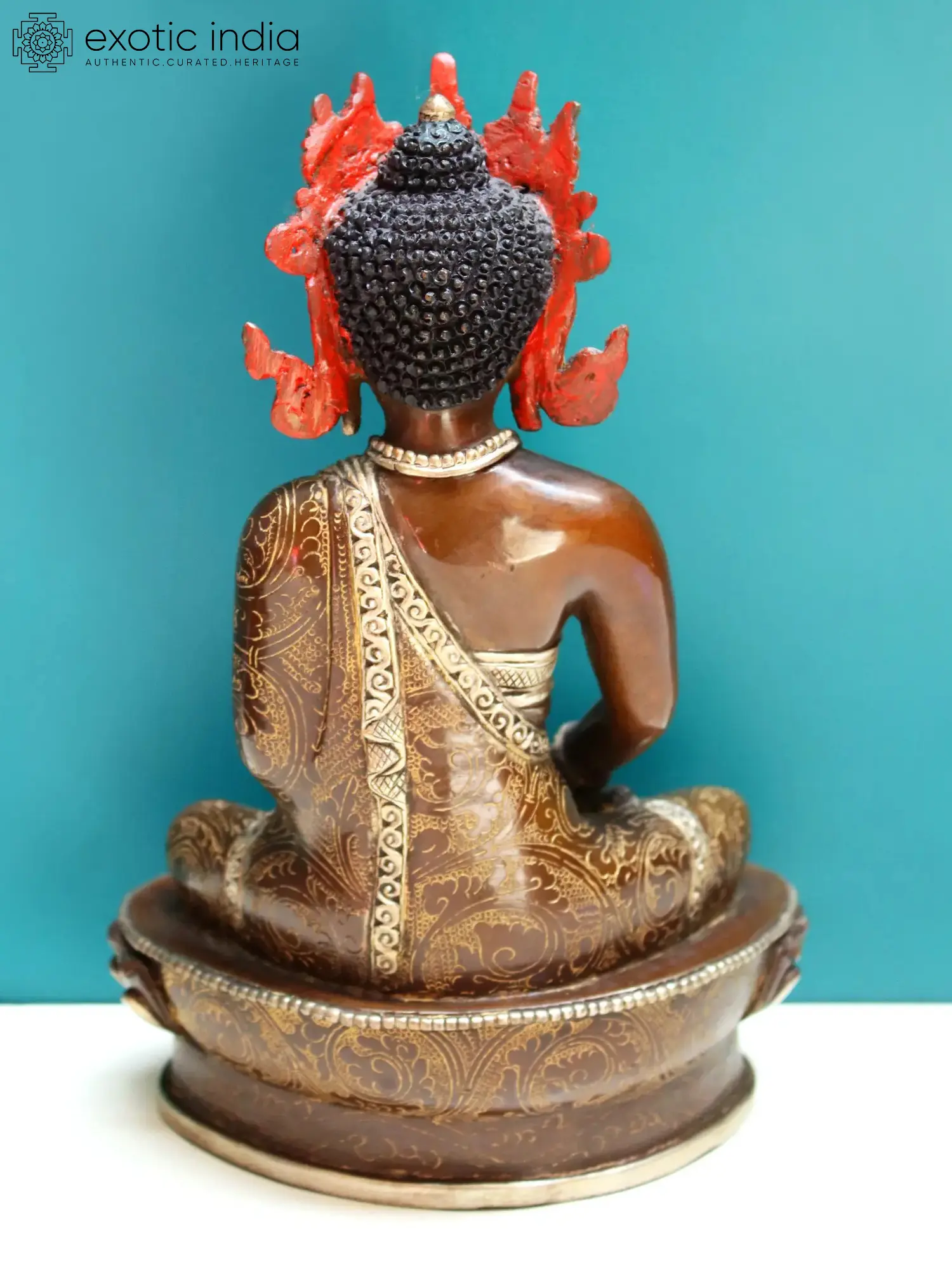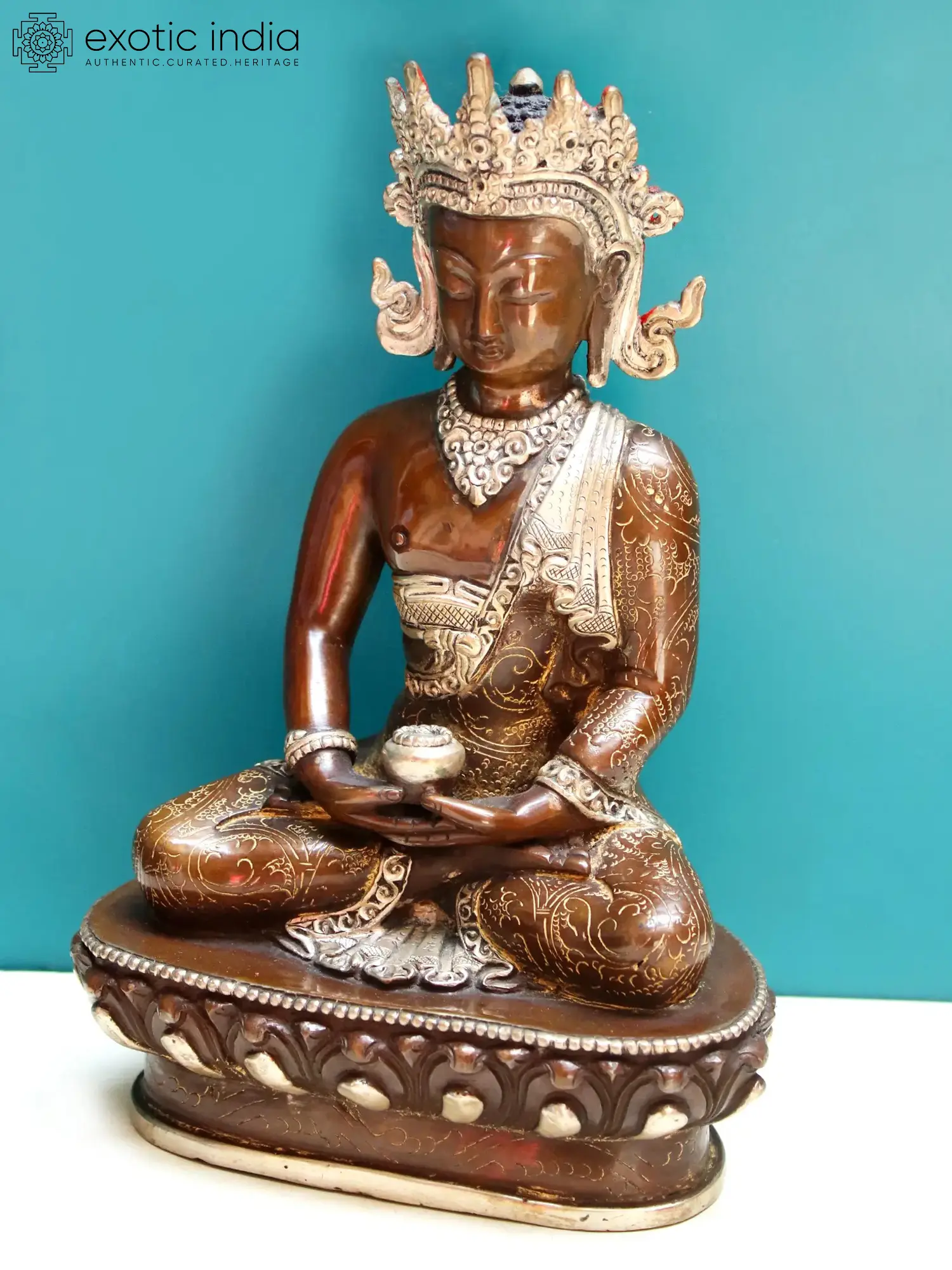 Buddha's divine figure is adorned with tasteful embellishments and a delicate dhoti, which enhance his aura. Placing his hands in the Dhyana mudra or gesture of meditation in his lap, and carrying the alms bowl, the regal Buddha guides the followers to focus on the inner world through meditation, take as little as possible from the world, and experience the true sovereignty, that comes not from worldly but inner wealth.