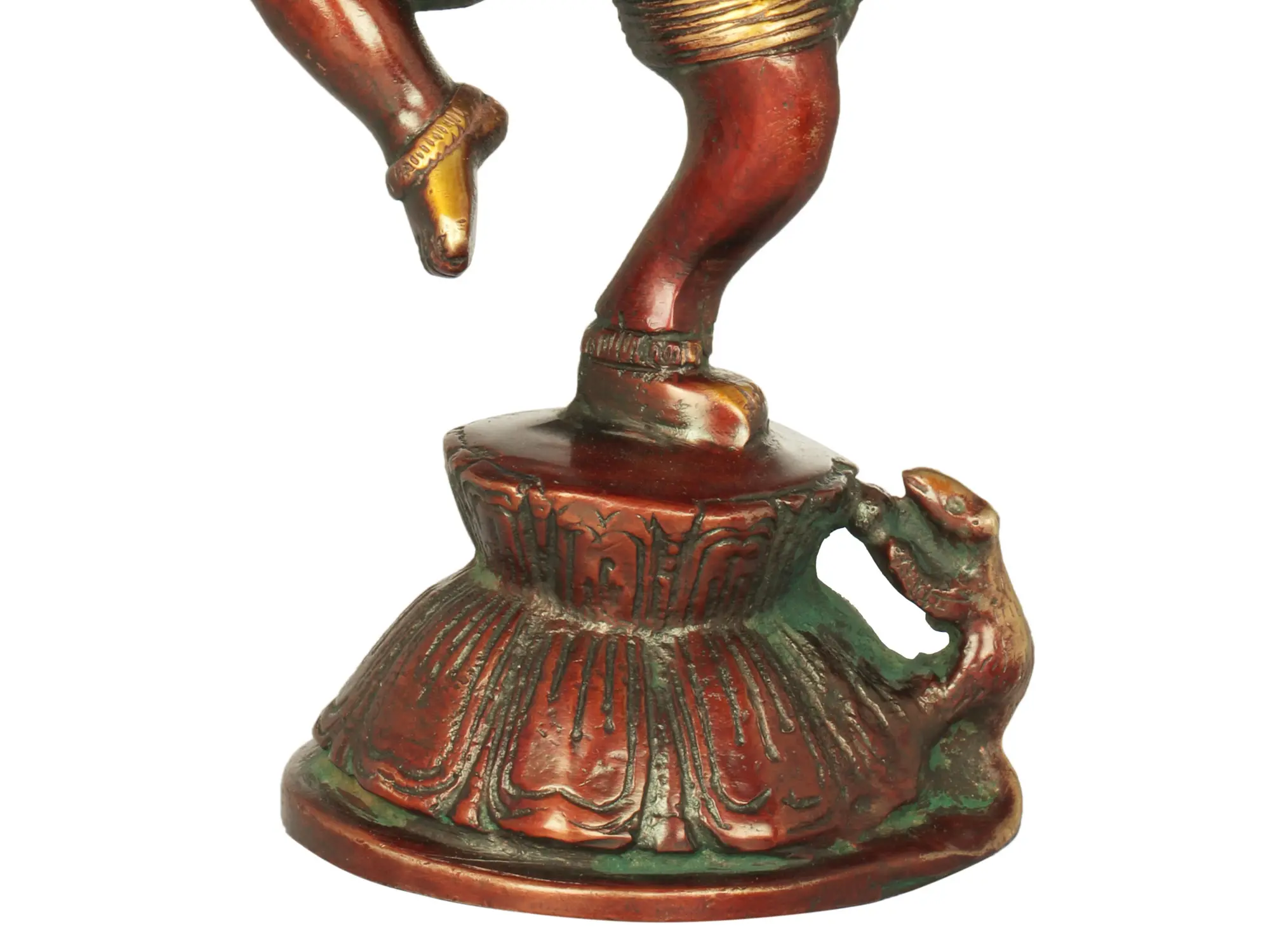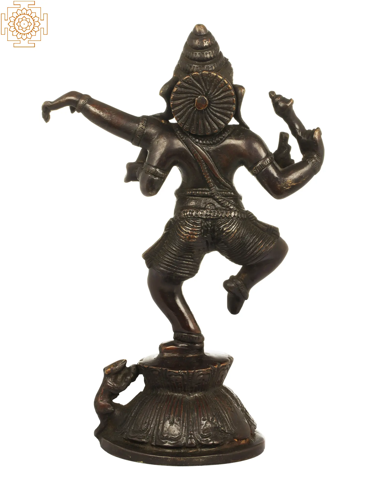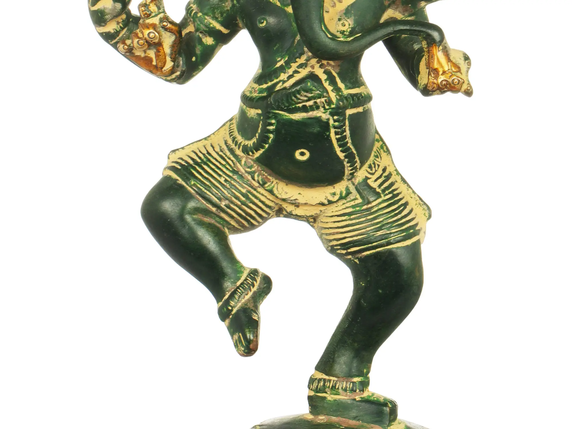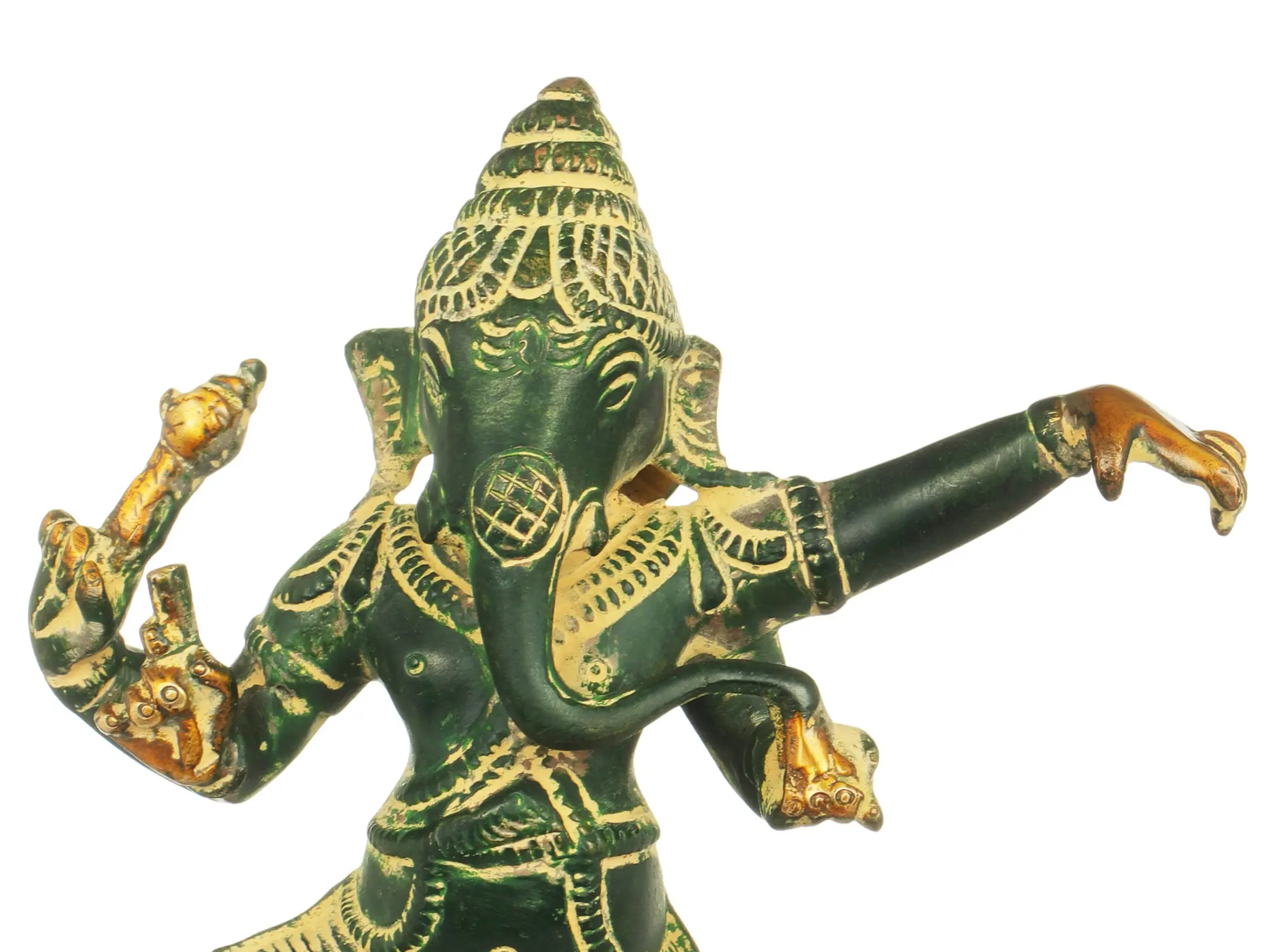 This brass sculpture captures the dynamic essence of Ganesha, the god of new beginnings, in an exuberant dance. Handcrafted with meticulous detail, the deity's joyous movement is immortalized mid-dance, each limb expressing the beat of eternal rhythms. Ganesha's rounded form, traditionally symbolizing prosperity, is adorned with finely etched garments, and his expression is one of divine bliss. Perched on a pedestal, every aspect of this piece, from the ornate crown to the playful twist of the trunk, reflects skilled Indian craftsmanship. This Dancing Ganesha infuses any space with the spirit of celebration and the promise of auspiciousness.