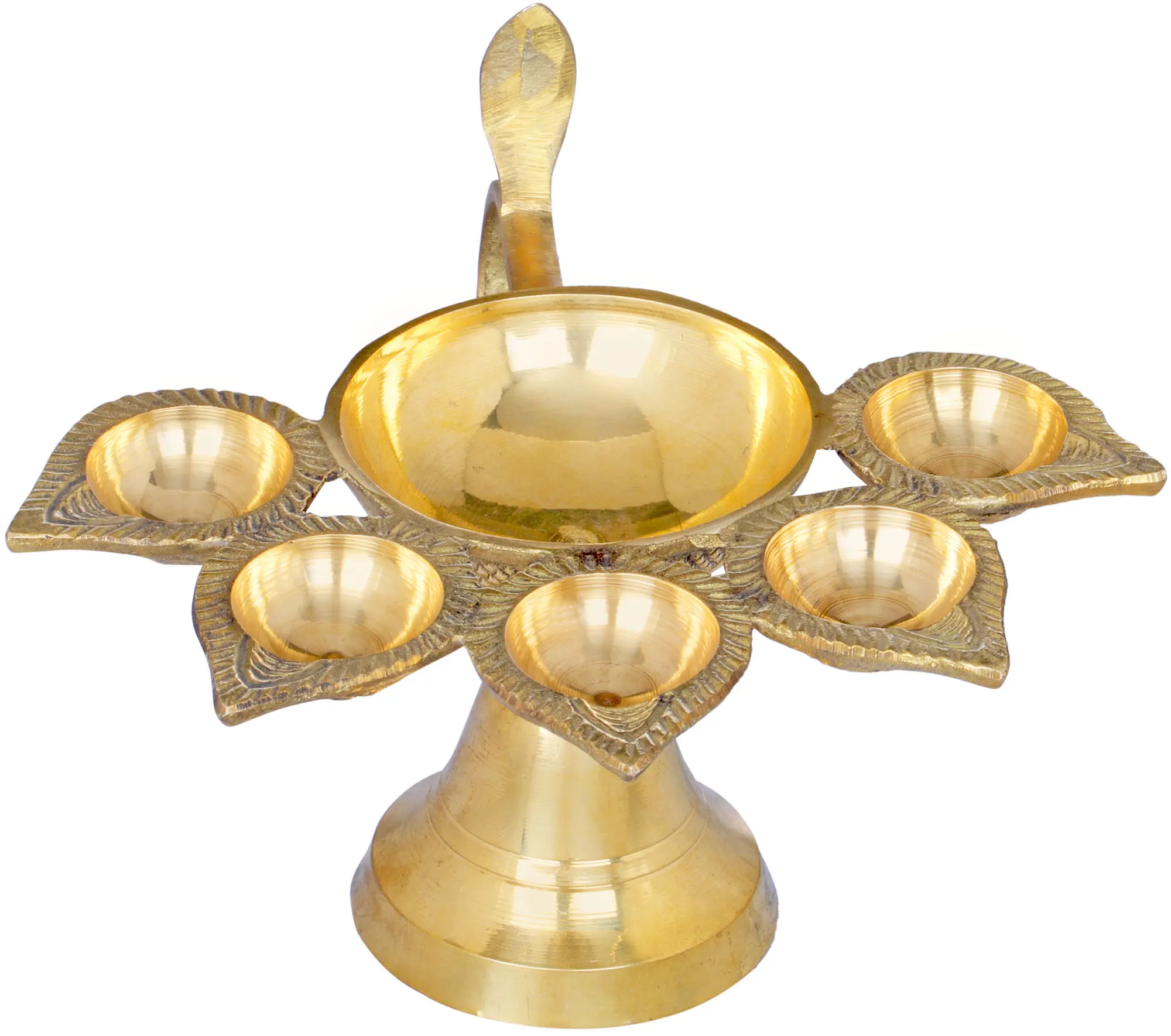 This Brass five wick lamp is perfect for performing arti and delivering almighty observances. The wicks of the lamp are clean, resulting in a straight but calming glow. Because the wick holes are deep, it is also good for burning camphor. The five wicks ensure that light radiates in all five directions, eradicating utter darkness. If you include this light in your regular worship practices, you will be able to make a more joyful donation.