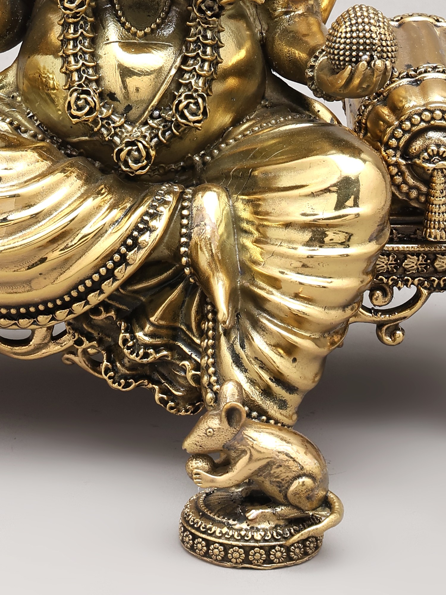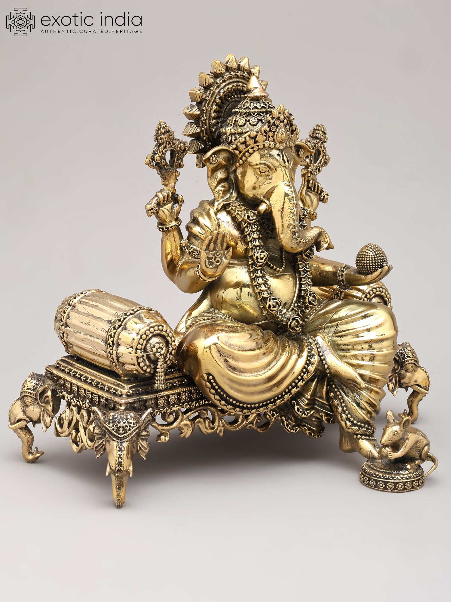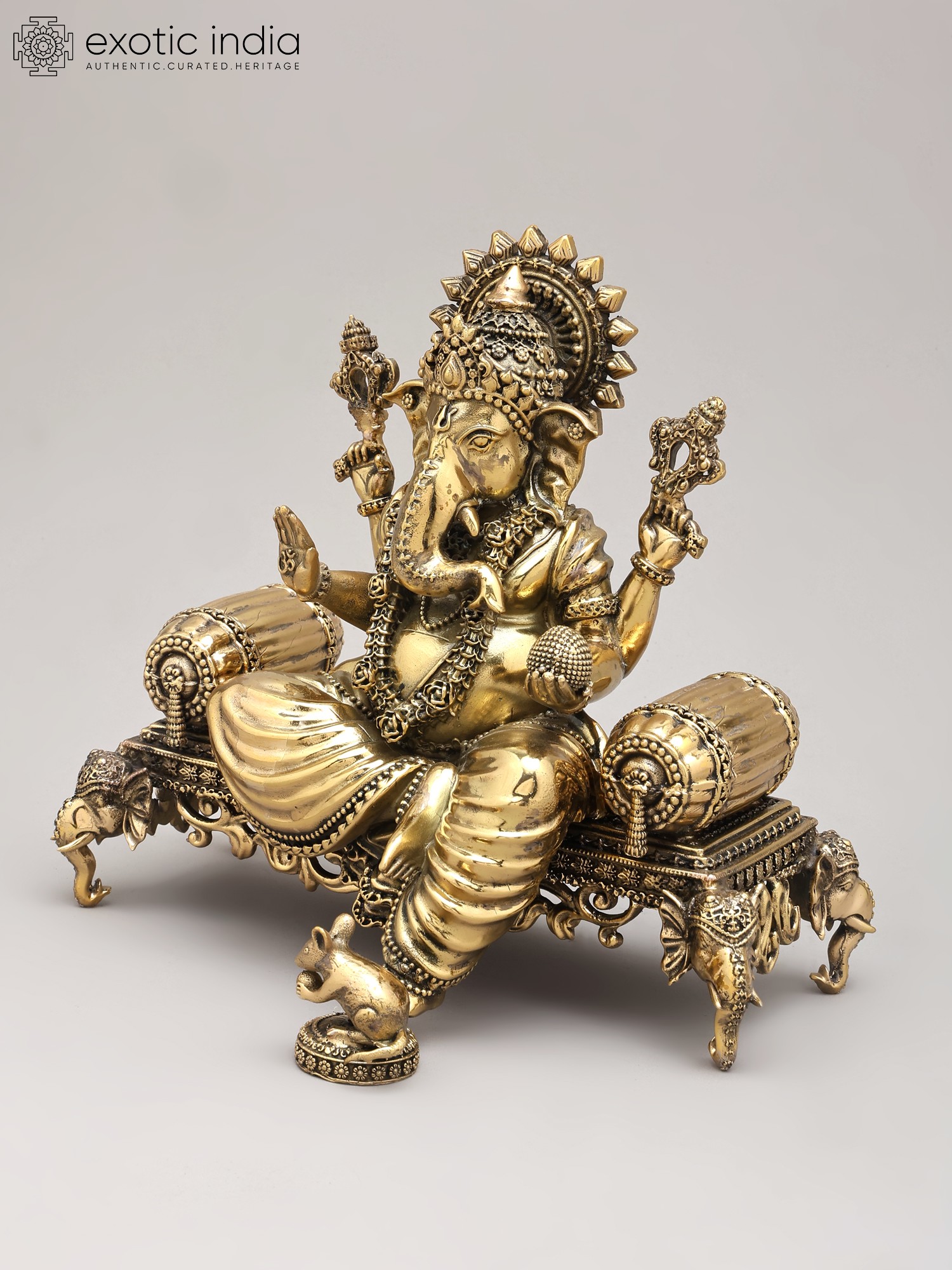 Adorned in regal splendor, the deity is seated upon an elaborately designed royal throne, a testament to earthly and divine power. The four arms, each holding symbolic implements, convey multifaceted aspects of divine power and grace. The gentle form of Mushaka, the divine vehicle, rests faithfully at the feet, representing control over desire and the triumph of intellect.