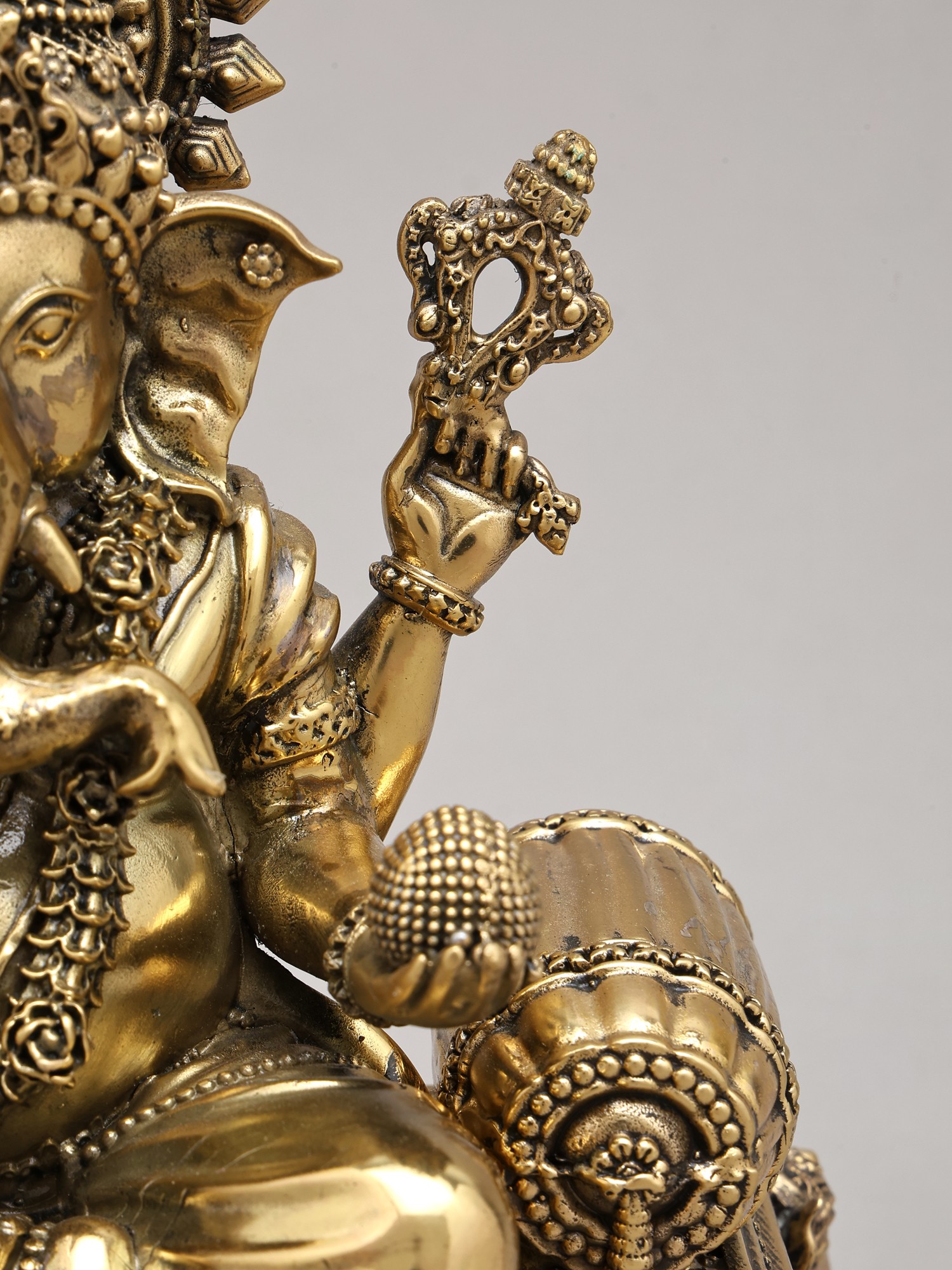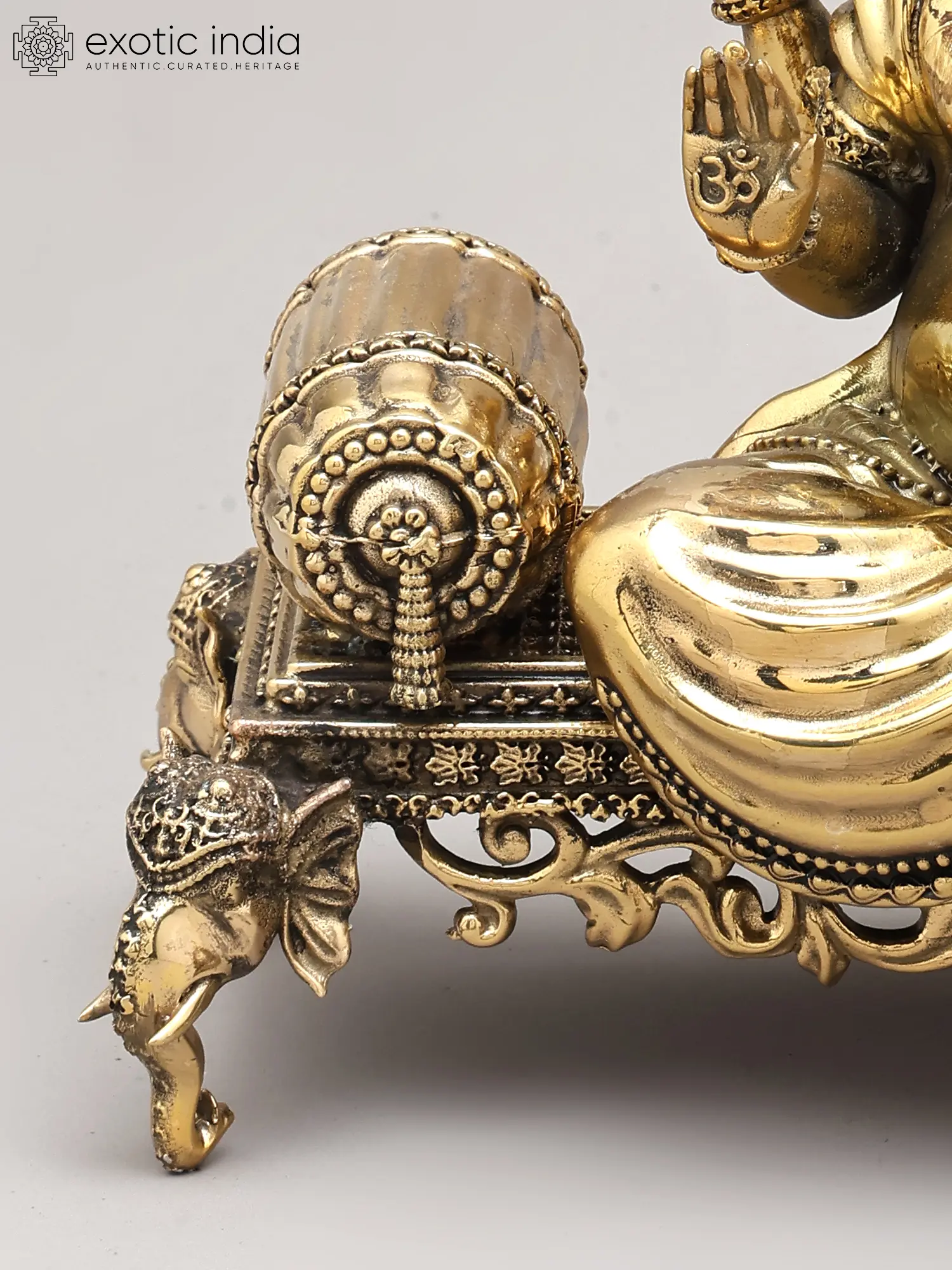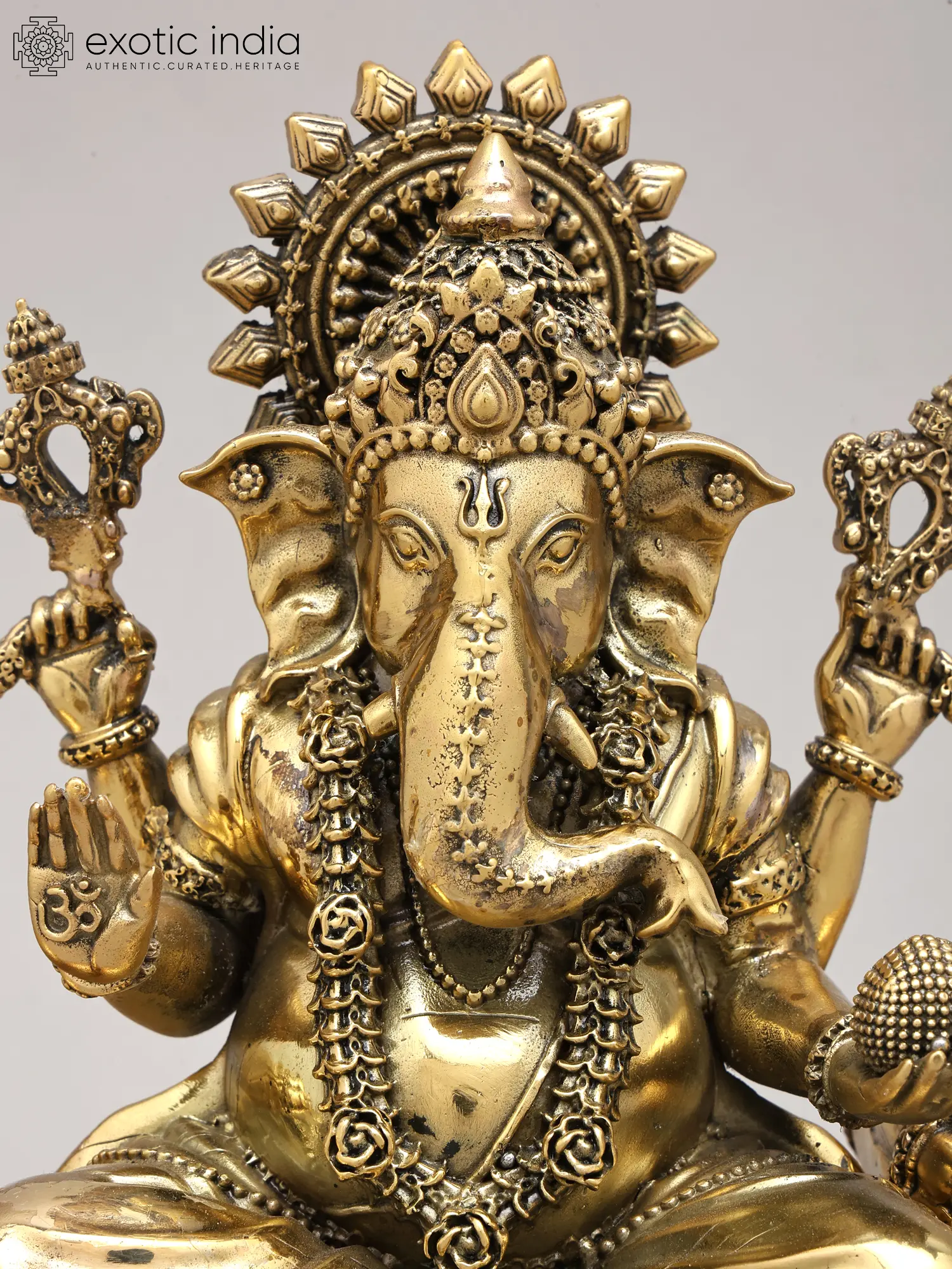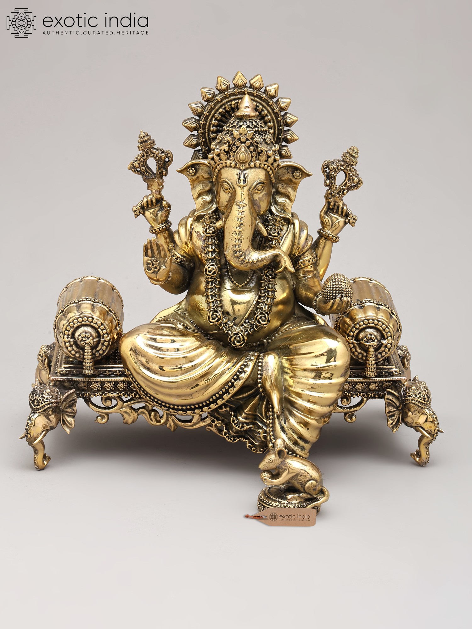 Adorned in regal splendor, the deity is seated upon an elaborately designed royal throne, a testament to earthly and divine power. The four arms, each holding symbolic implements, convey multifaceted aspects of divine power and grace. The gentle form of Mushaka, the divine vehicle, rests faithfully at the feet, representing control over desire and the triumph of intellect.