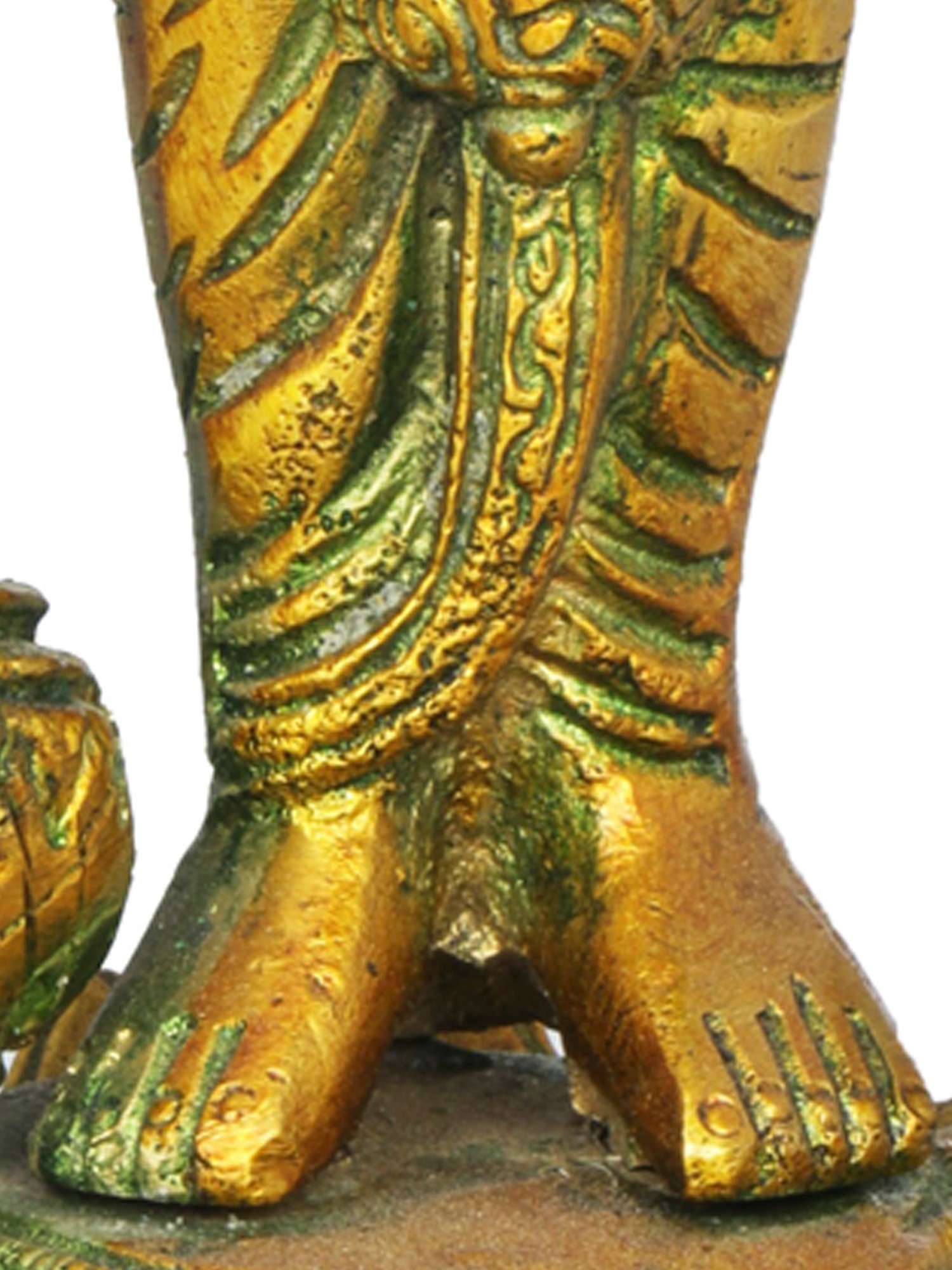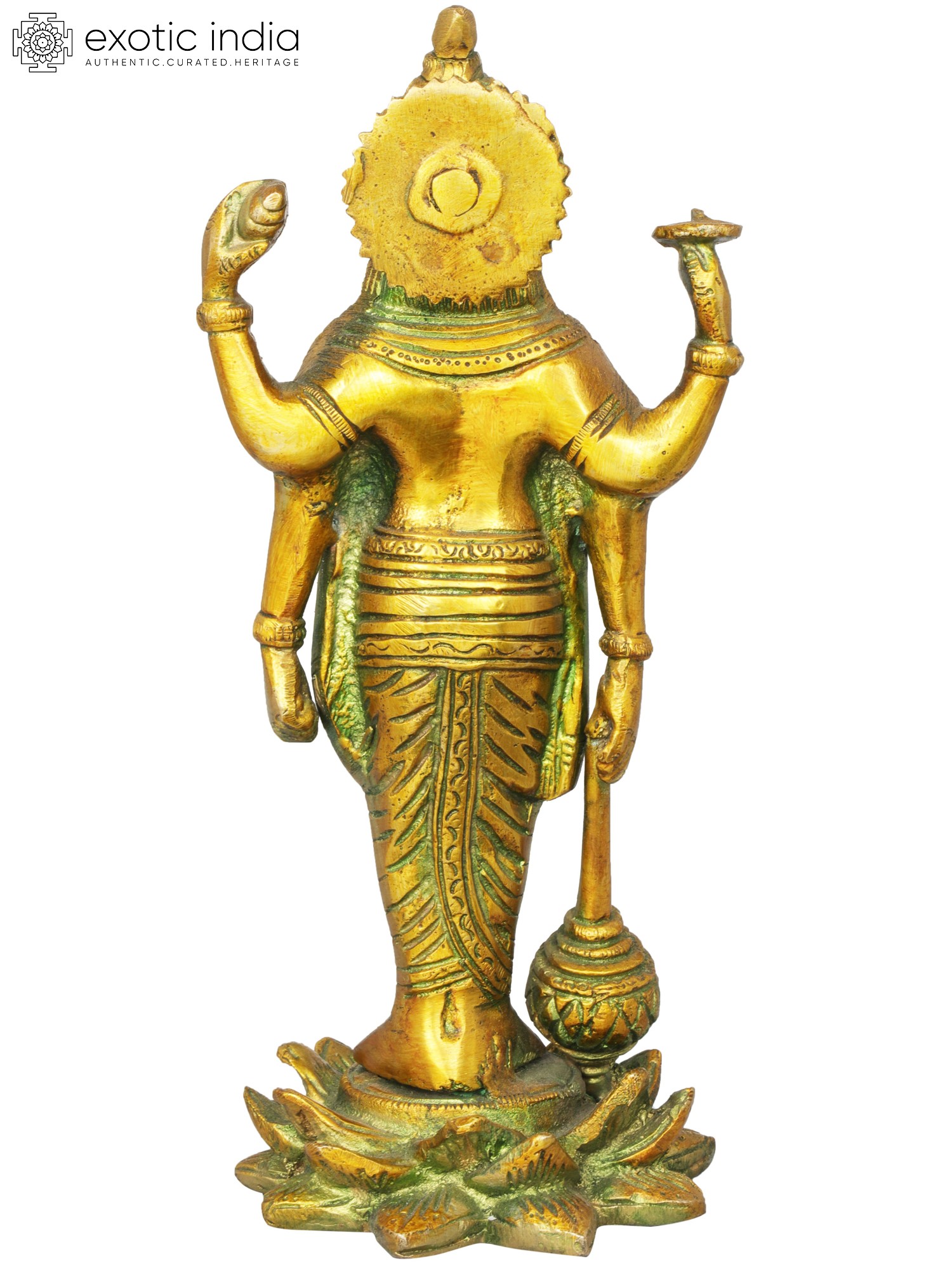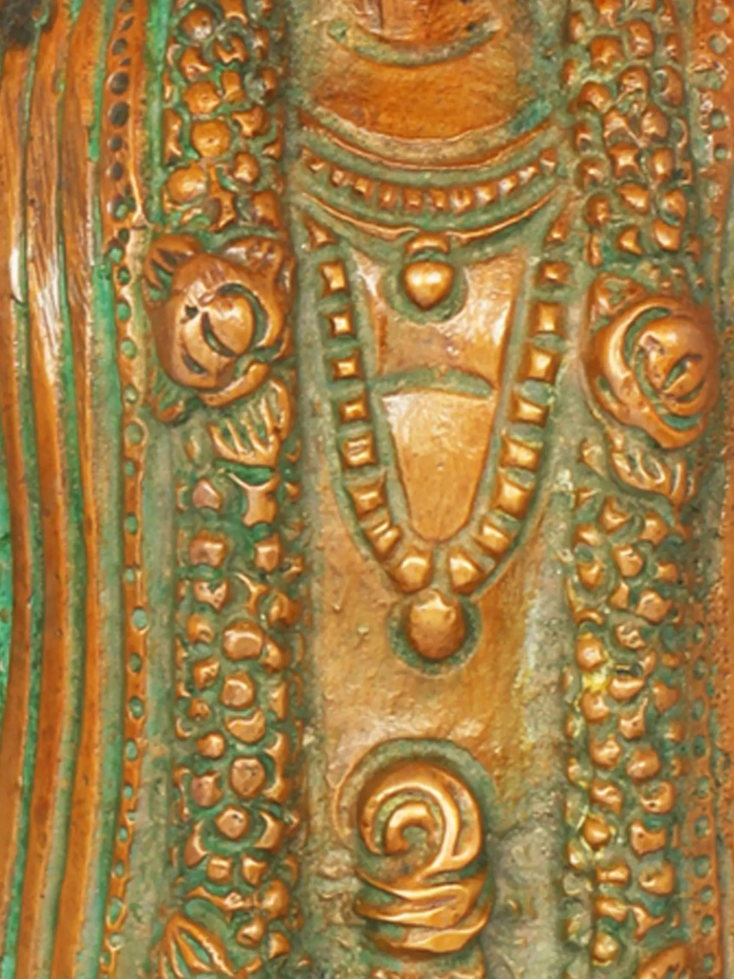 The portrayal of Chaturbhuja Swami Vishnu in brass signifies the omnipresent nature and divine power of Vishnu. This sculpture captures the four-armed form of Vishnu, symbolising his omnipresence and cosmic influence. The intricate details within this sculpture foster an ambiance of divine presence and power, encouraging viewers to reflect on the cosmic influence and the omnipresence of Swami Vishnu. Each detail invites contemplation on the all-pervading nature and the cosmic influence of Lord Vishnu, creating an ambiance of divine omnipresence and influence.