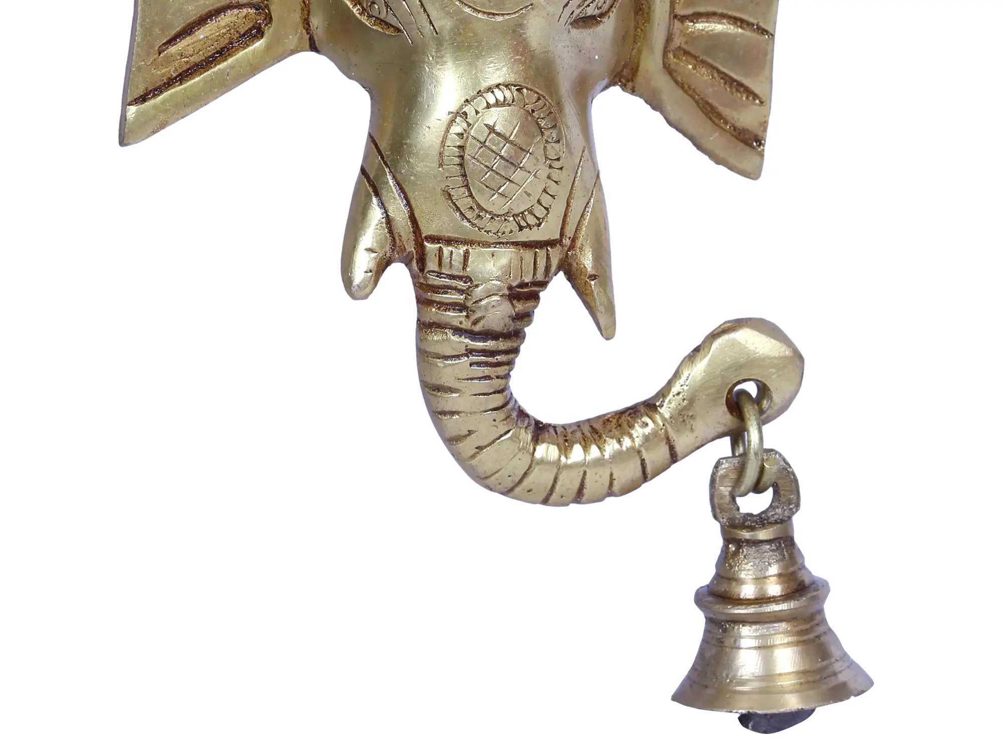 This Lord Ganesha wall hanging mask with a bell is constructed of high-quality brass and exudes the aura of old workmanship. The skillful depiction of Lord Ganesha looking at his worshippers with loving and caring eyes is a tribute to great craftsmanship. Lord Ganesha's trunk is adorned with a bell at the end, symbolizing the connection of the sacred sound with this wall hanging. This brass wall hanging is a powerful spiritual symbol that welcomes Lord Ganesha's blessings into your home.