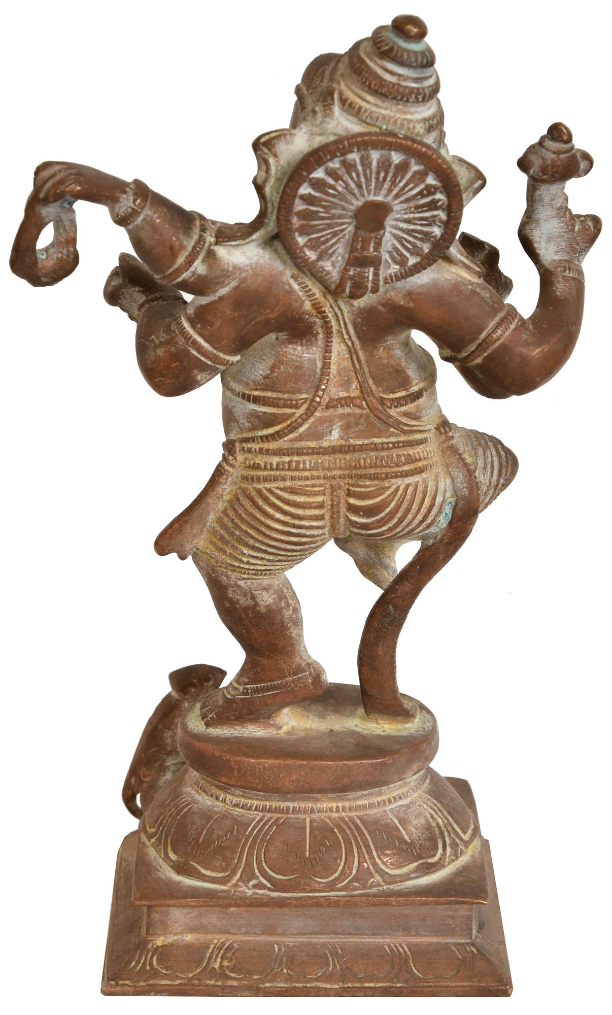 Here Ganesha dances with his right leg raised in joyous abandon, and the left heel slightly lifted, the same foot being balanced solely on the toes. His legs are short and chubby. The beautifully delineated trunk is incised and holds his a modaka (sweet meat) in it. This being Ganesha's favorite food. His four dynamic arms hold an elephant goad; his severed tooth; a noose; and a modak again. Ganesha wears a detailed crown which hoods his forehead completely, and is capped with a four-tiered pyramidal structure.