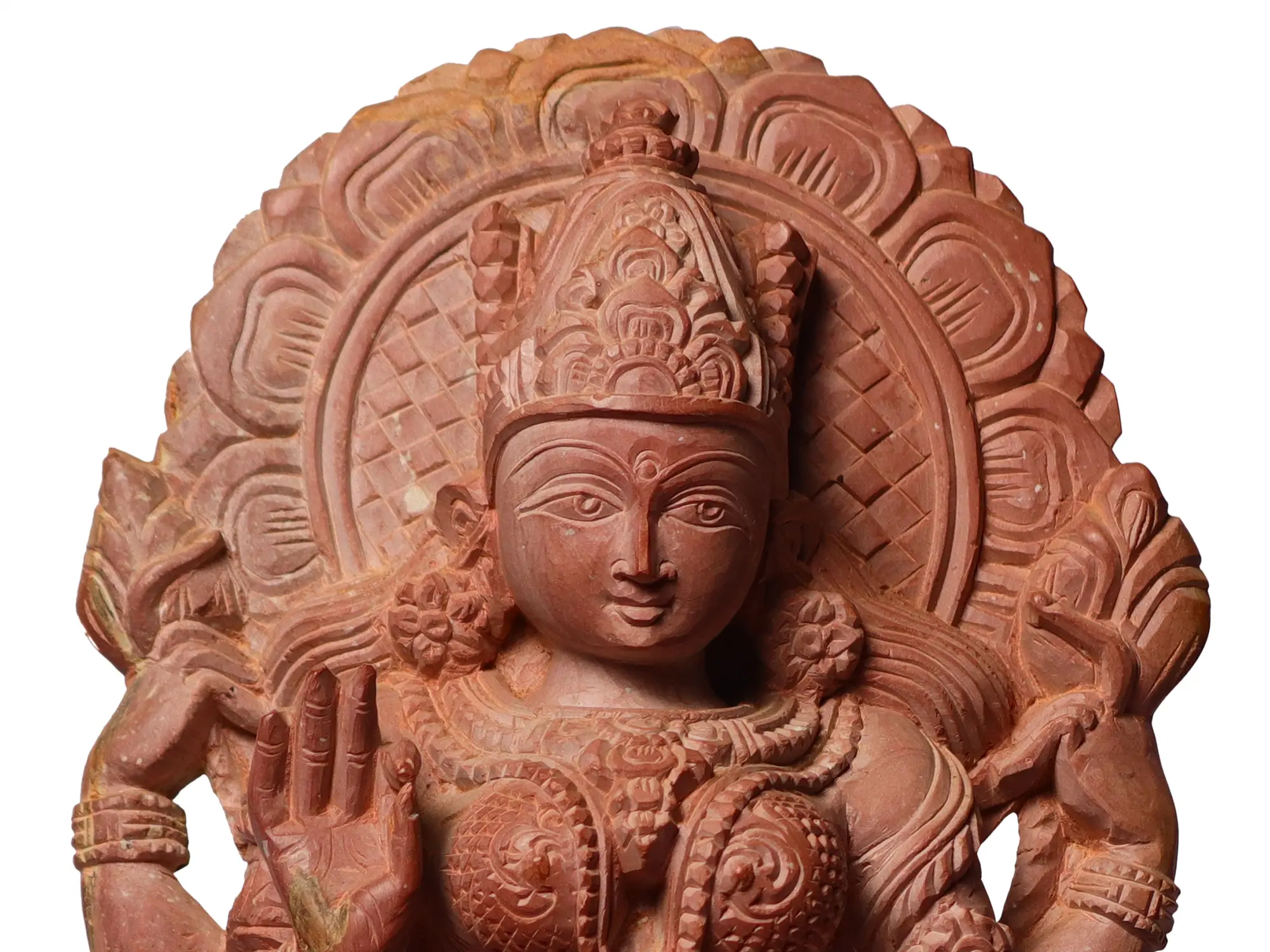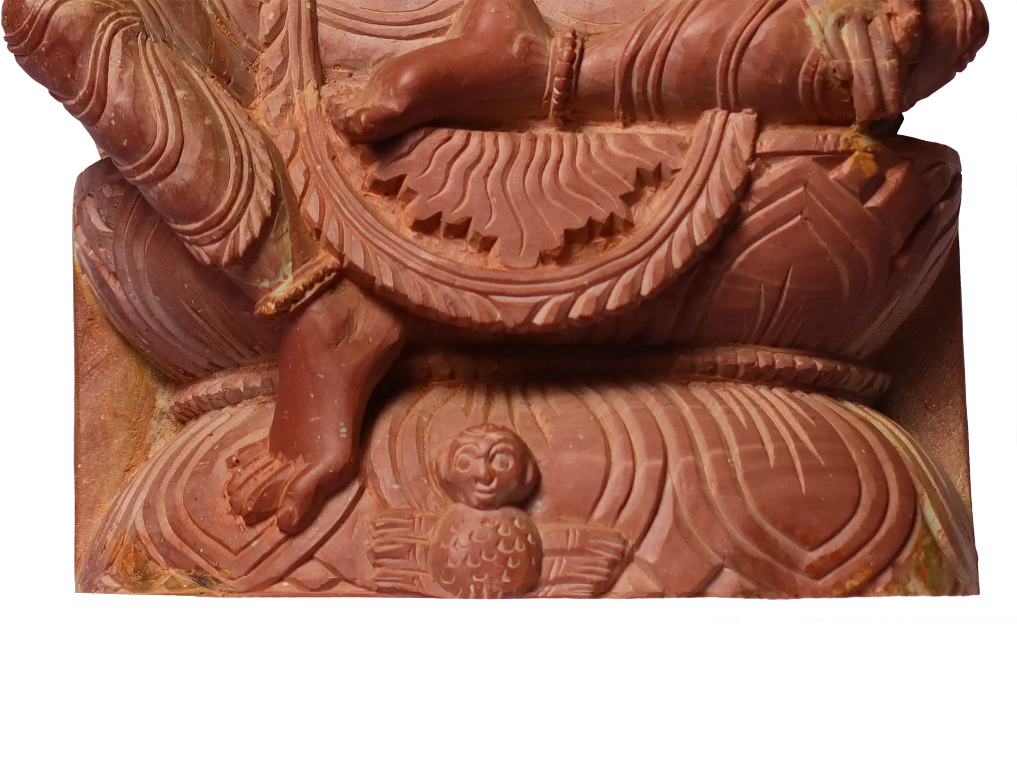 Goddess Lakshmi is goddess of wealth, prosperity, and fortune. She is depicted as a radiant goddess with four arms, often holding lotus flowers, signifying purity and abundance. Devotees believe that invoking her blessings brings material and spiritual wealth. Maa Lakshmi embodies virtues like generosity and benevolence, emphasising the importance of sharing one’s wealth with others. Her worship signifies the welcoming of prosperity into homes. The pink stone, with its soft hues, gives an ethereal character to this sacred creation, enhancing the sense of divinity that surrounds her. Devotees seek her favour and the blessings of abundance that she embodies.