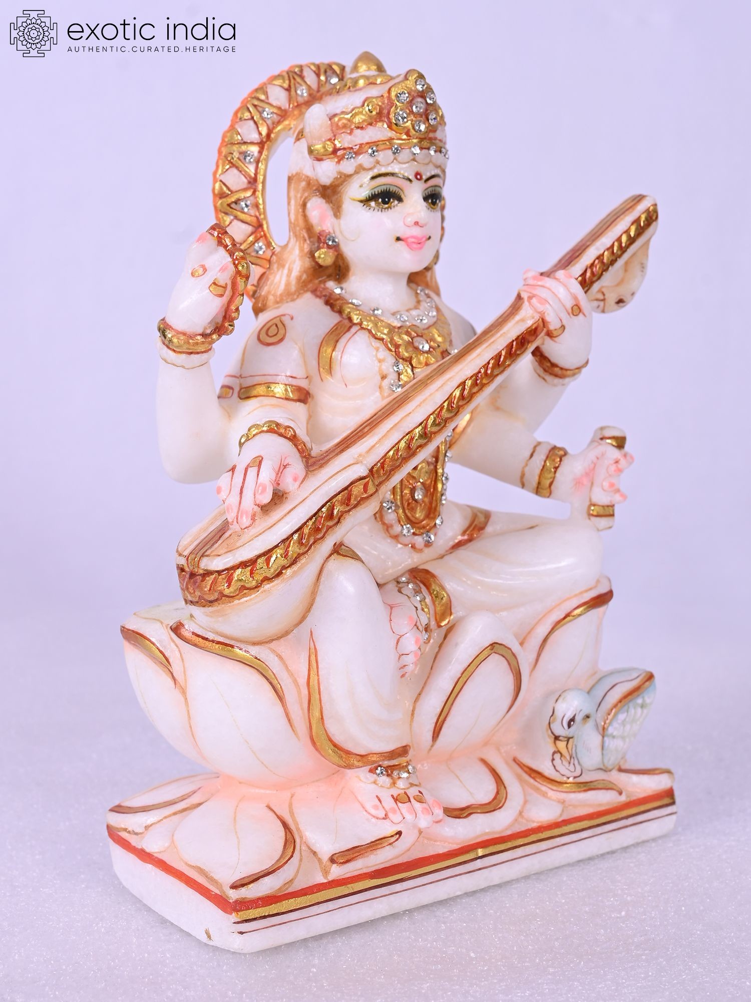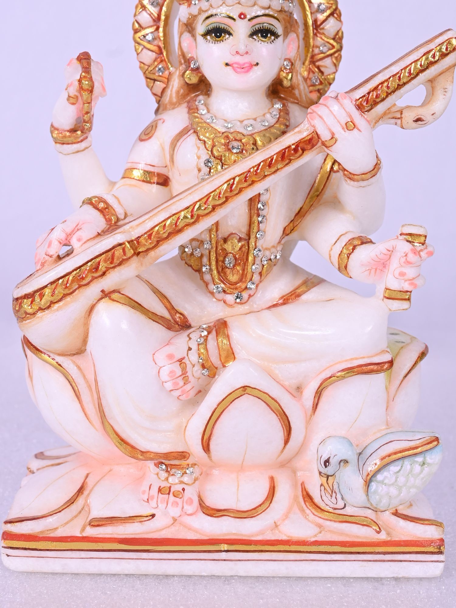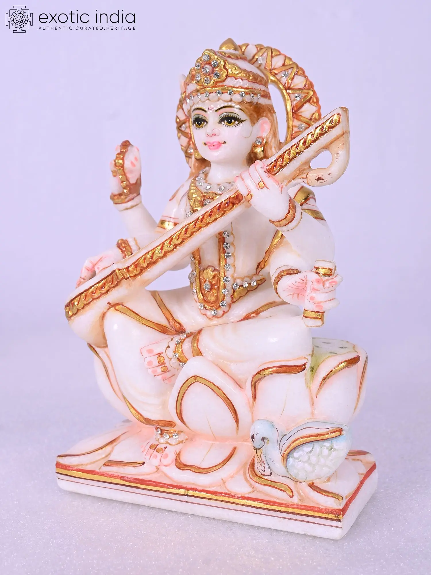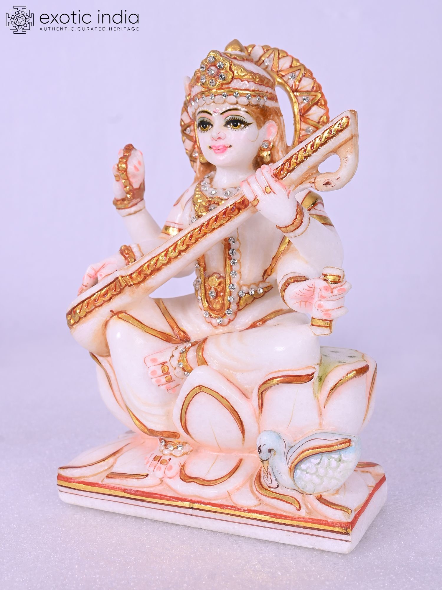 9" Goddess Saraswati Statue With Swan | Super White Makrana Marble Figurine