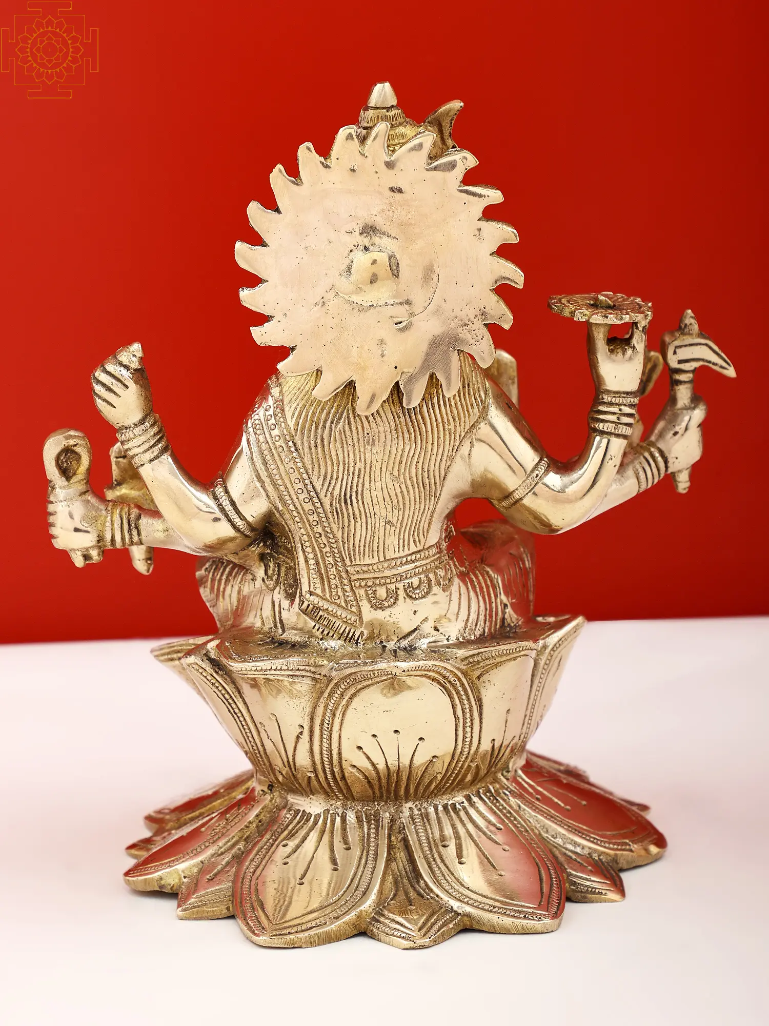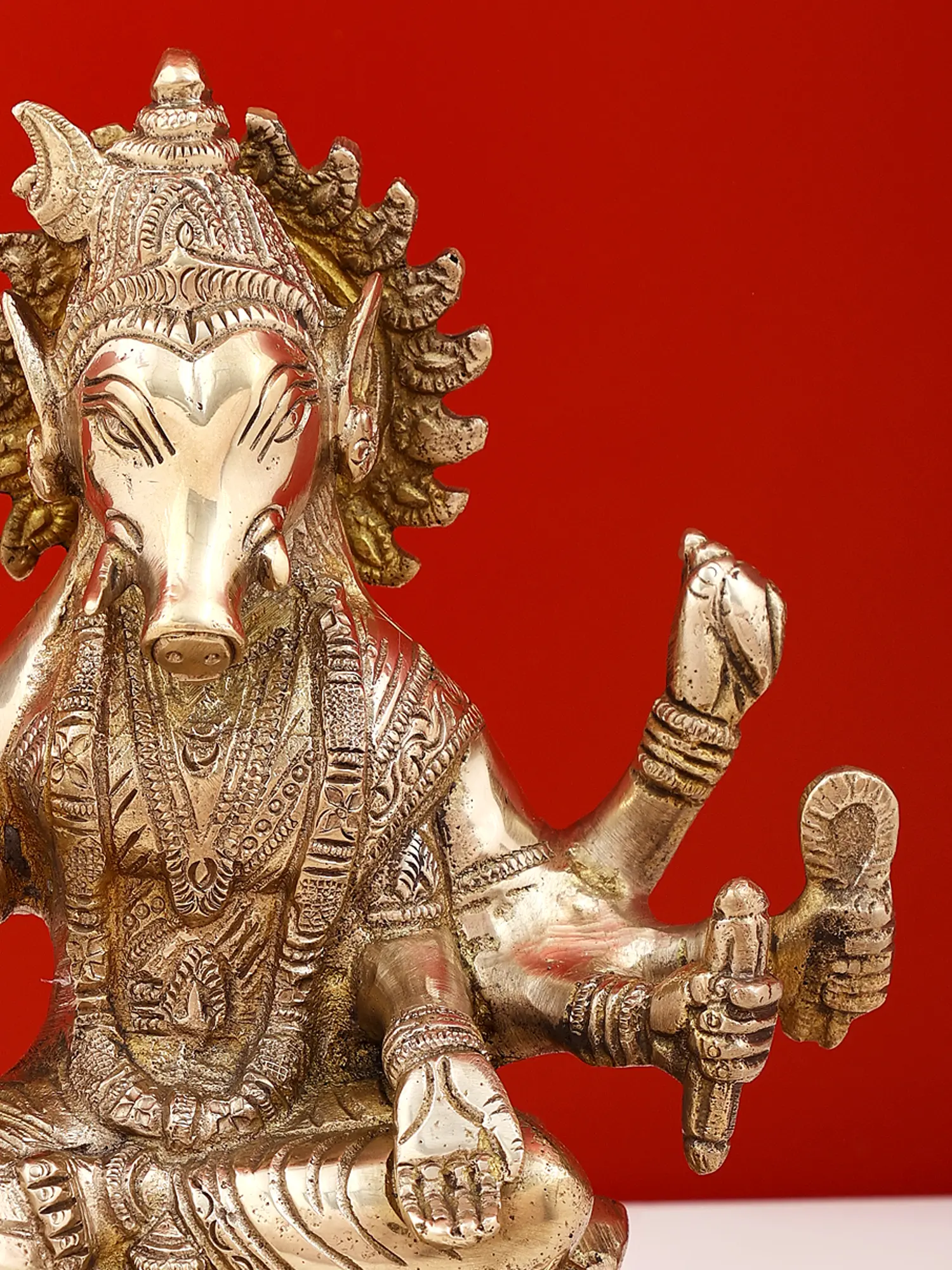 Explore the divine energy of Varahi, the powerful shakti of Varaha, through this remarkable depiction in brass. With the head of a sow and adorned in a majestic karaṇḍa mukuṭa, Varahi radiates strength and grace. Her four arms carry symbolic attributes reminiscent of Vishnu, such as the discus, mace, and noose. Varahi's sacred presence, holding the Earth on her tusks akin to Varaha, symbolizes protection and cosmic balance. This handmade brass sculpture captures the intricacies of Varahi's divine form, inviting you to connect with the profound energy of the feminine and the cosmic. Embrace the spiritual essence embodied in this exquisite Varahi statue.