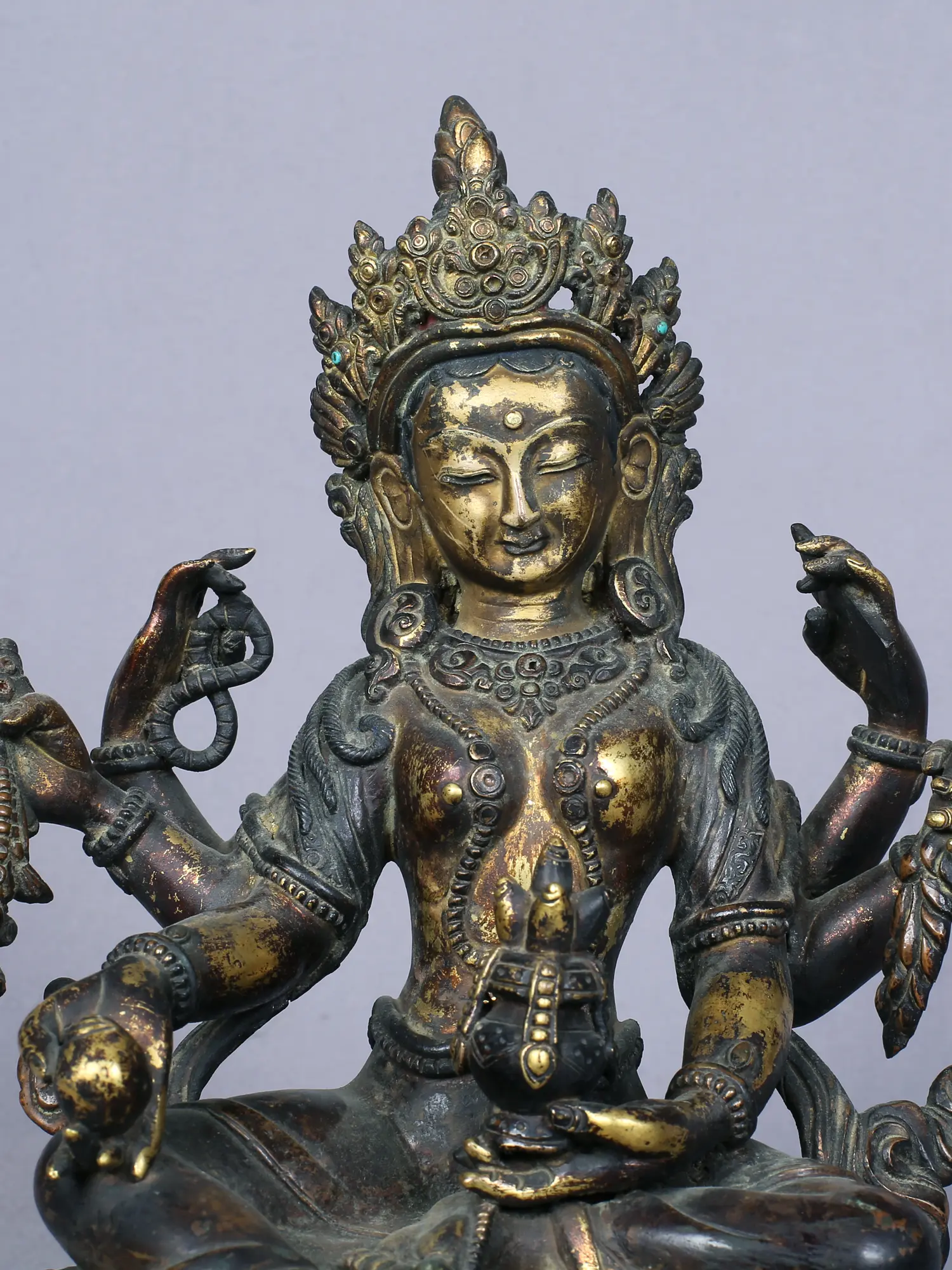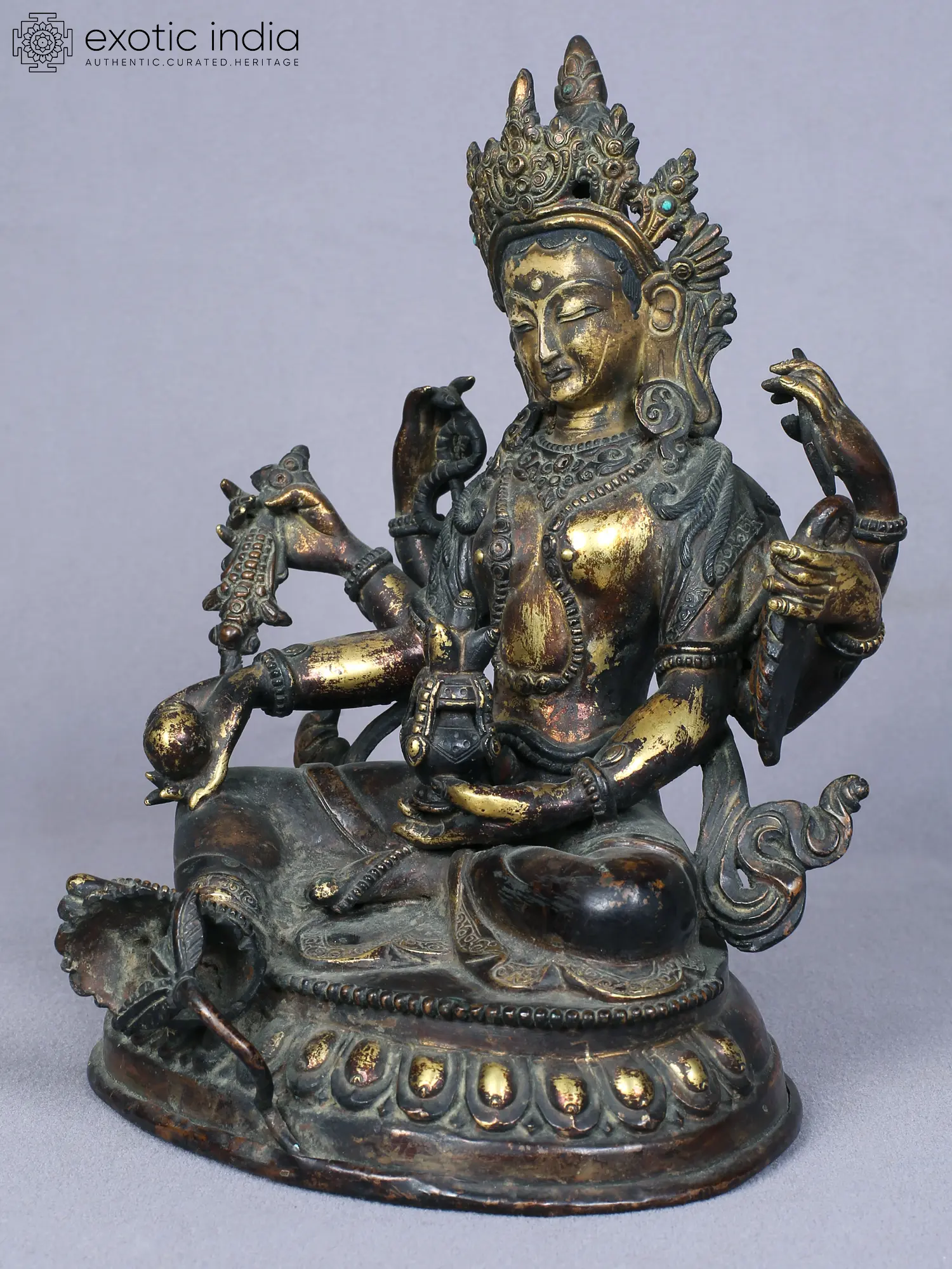 Vasundhara- she who is the source of wealth, is a revered deity of the Newari community in Nepal, seen as an equivalent of the Hindu goddess Lakshmi, who bestows eternal wealth on her devotees. As the deity who protects and nurtures material wealth in all forms- money as well as agricultural produce, Vasundhara is also comparable to Bhudevi, the Earth goddess in Hinduism. In this divine copper statue from Nepal, Vasundhara is depicted in a powerful six-armed form, signifying her bountiful nature. She carries the rosary, jeweled plant, a fruit, the pot of amrita or ambrosia, grains, and a book- symbols of her all-encompassing nature, through which she nourishes every aspect of human needs.