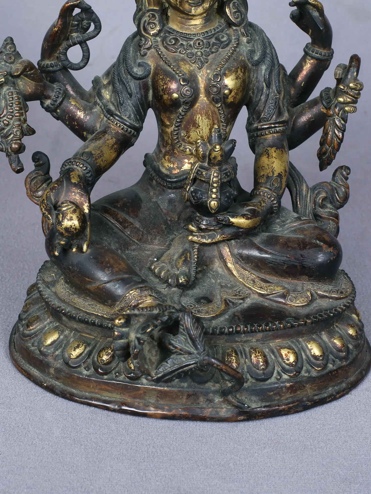 The form of Vasundhara is heavenly, with an eternal youthfulness conveyed through her graceful features, adorned with ornaments and rich clothes. Her throne is an inverted lotus flower, a popular seat of Buddhist deities, and a symbol of the origin of the Universe and wisdom. Sitting in the regal Maharajalilasana pose, Vasundhara has her foot extended on a beautiful lotus, as a refuge to those who seek her benevolence.