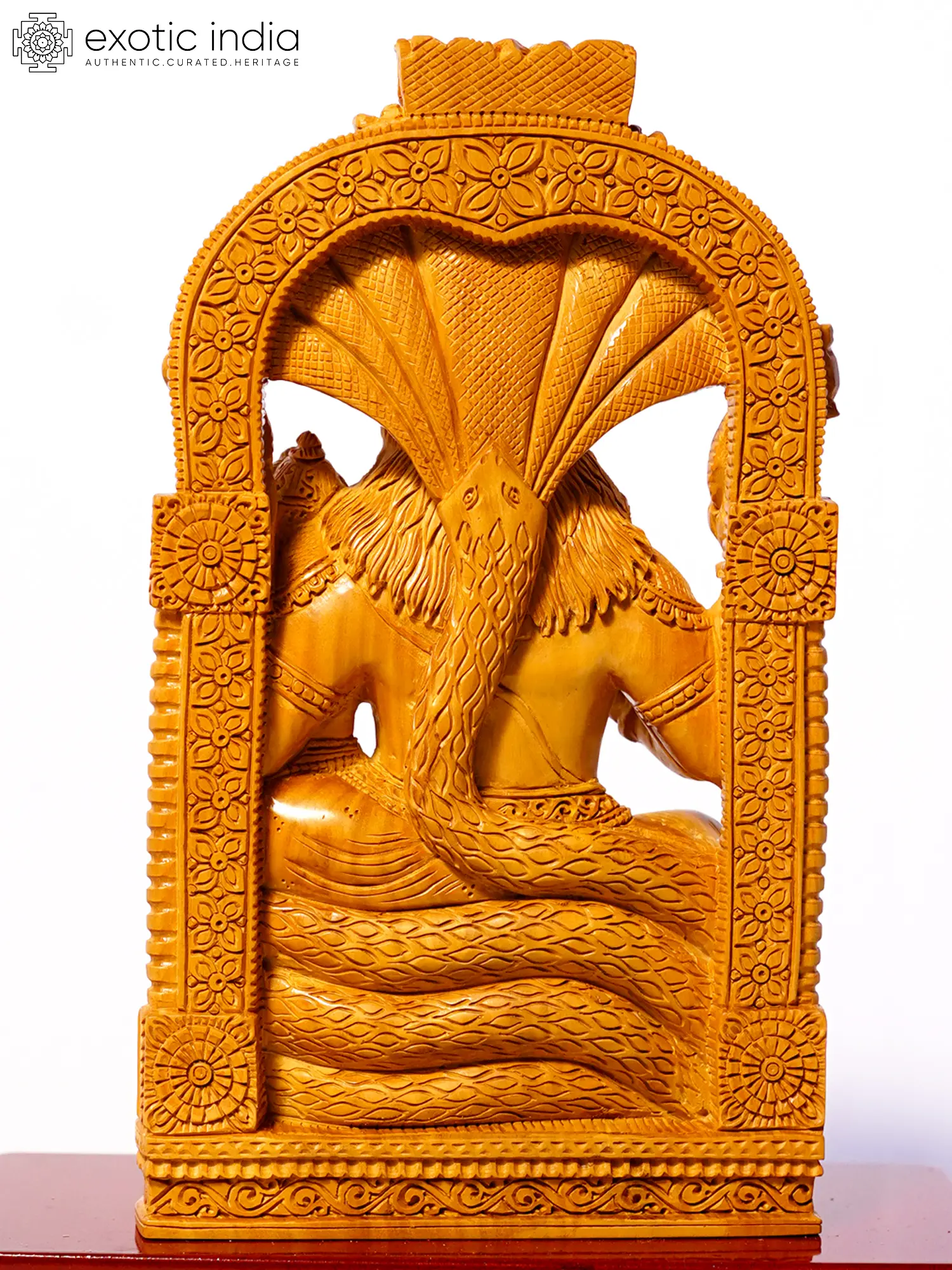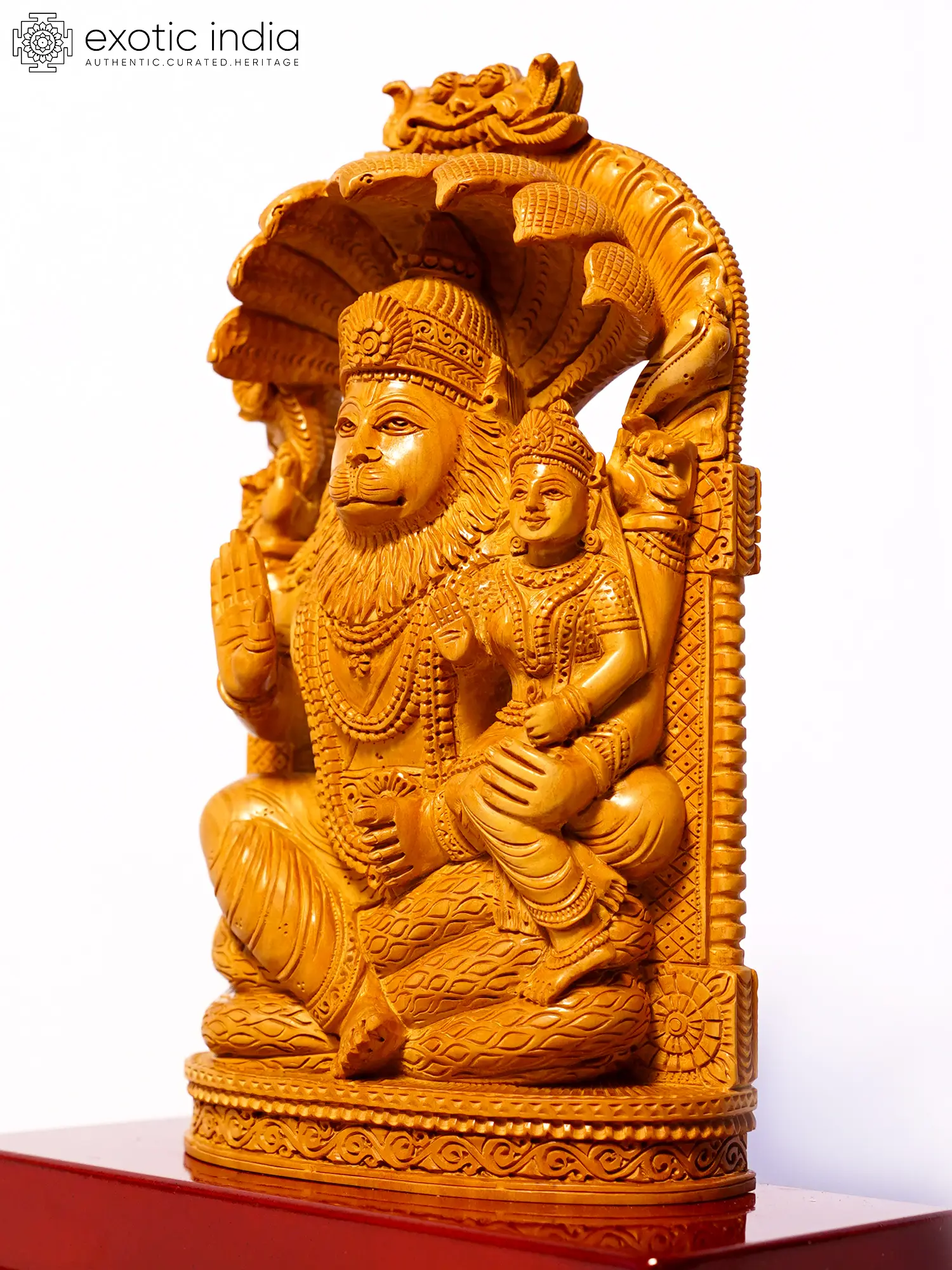 Behold the serene embodiment of power and compassion, skillfully carved from the fragrant heartwood of sandalwood. This statue depicts Lakshmi-Narasimha, a rare and potent combined form of Lord Vishnu as Narasimha and his consort, Goddess Lakshmi. Narasimha, the lion-headed avatar, is revered for his fierce protection and triumph over evil, while Lakshmi, the goddess of prosperity and abundance, represents grace, beauty, and auspiciousness. The iconography of this representation is striking. Narasimha sits majestically, one hand raised in the abhaya mudra, a gesture of reassurance and fearlessness. The protective presence of the Shesha Naga, the cosmic serpent, rises behind him, its multiple heads forming a divine canopy. Nestled comfortably on his lap is Lakshmi, her gentle form a stark contrast to Narasimha's formidable appearance. Her presence signifies that even the fiercest aspects of the divine are tempered by love and compassion.