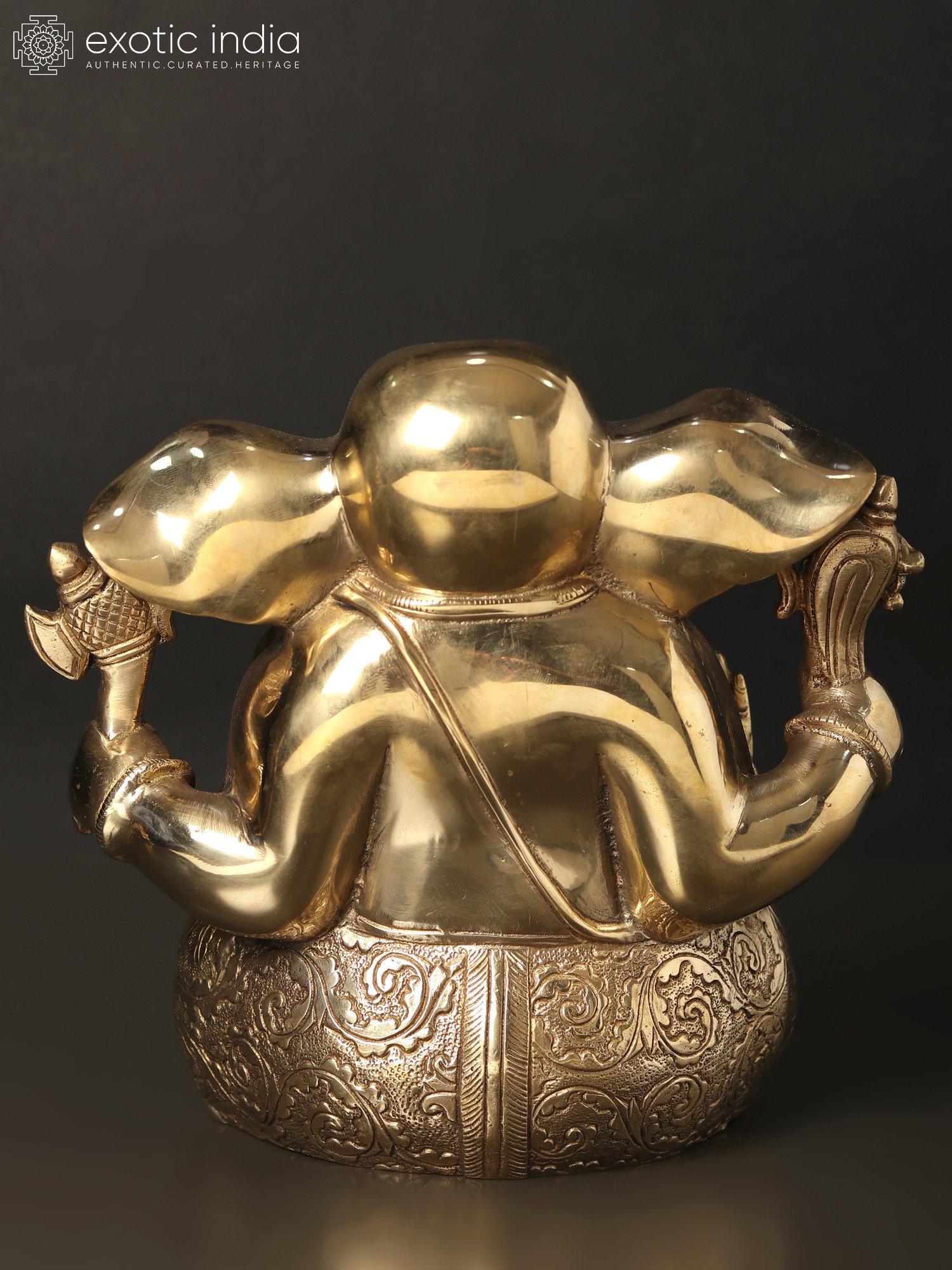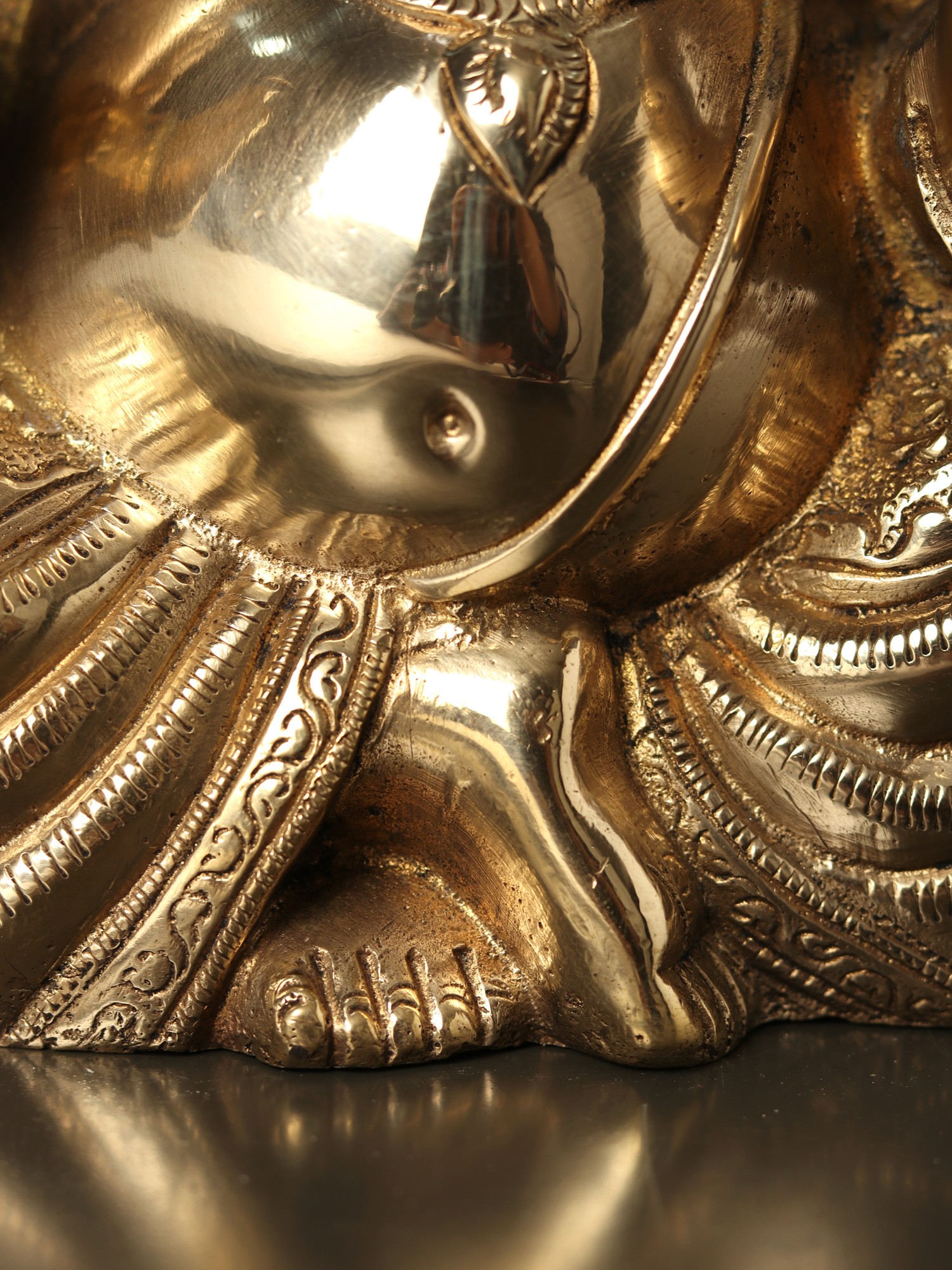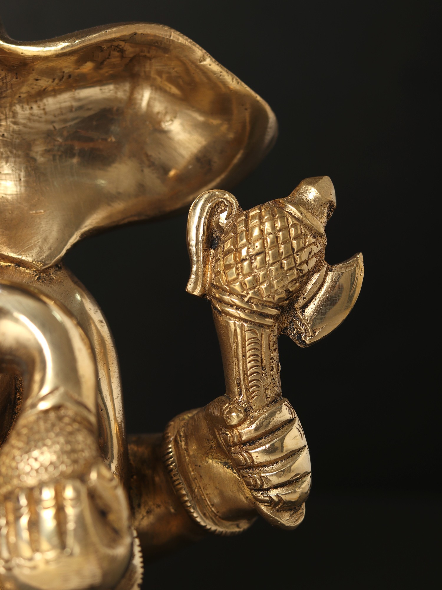 Seated majestically, Lord Ganesha, the enchanting deity of beginnings, cradles a noose and goad in his upper hands, symbols of control and guidance. With a benevolent countenance, his front right hand extends in “Ashirwad Mudra”, bestowing blessings upon all who seek his grace. His ears, like twin sails catching the whispers of the universe, are large and keen. The trident (Trishul) mark adorning his noble forehead exudes divine power. Ganesha enjoys a “Modak”, his favourite sweet, as a gesture of divine delight. Draped in the sacred Yajnopavita, Ganesha exudes purity. This brass creation is a testament to the divine presence of Lord Ganesha.