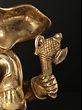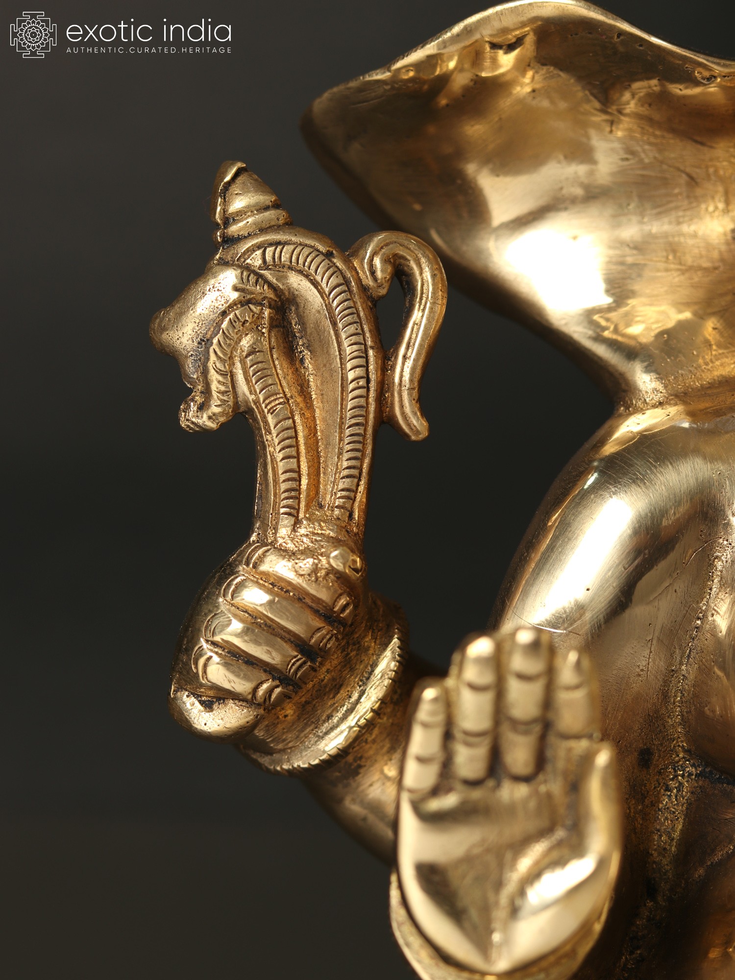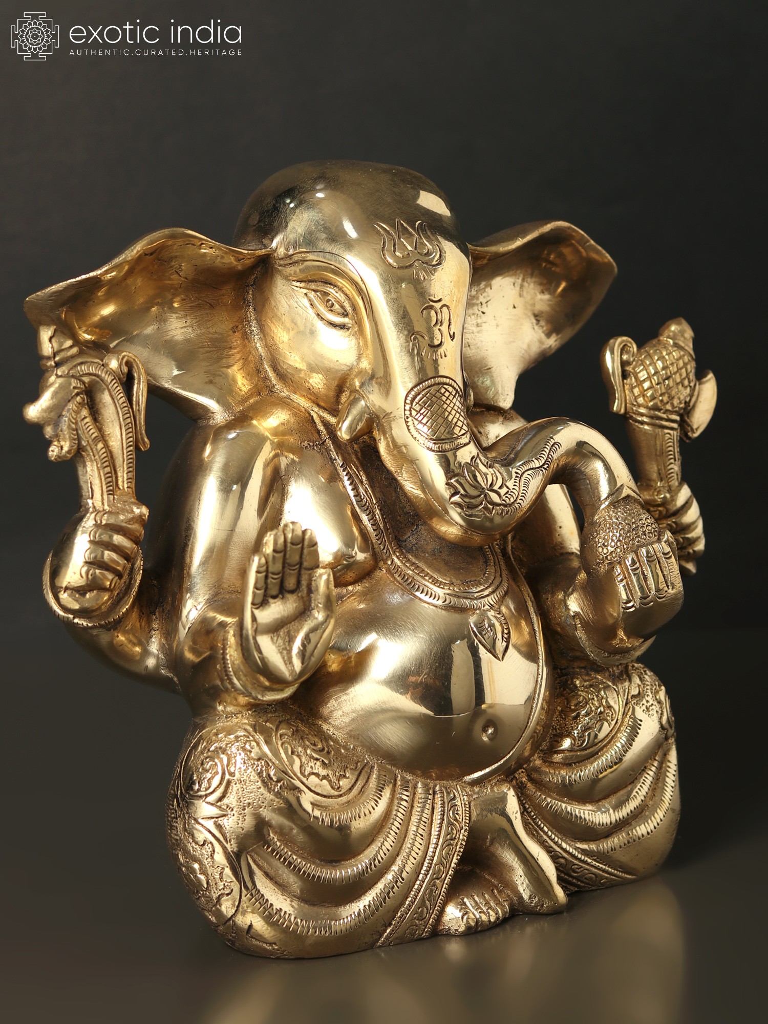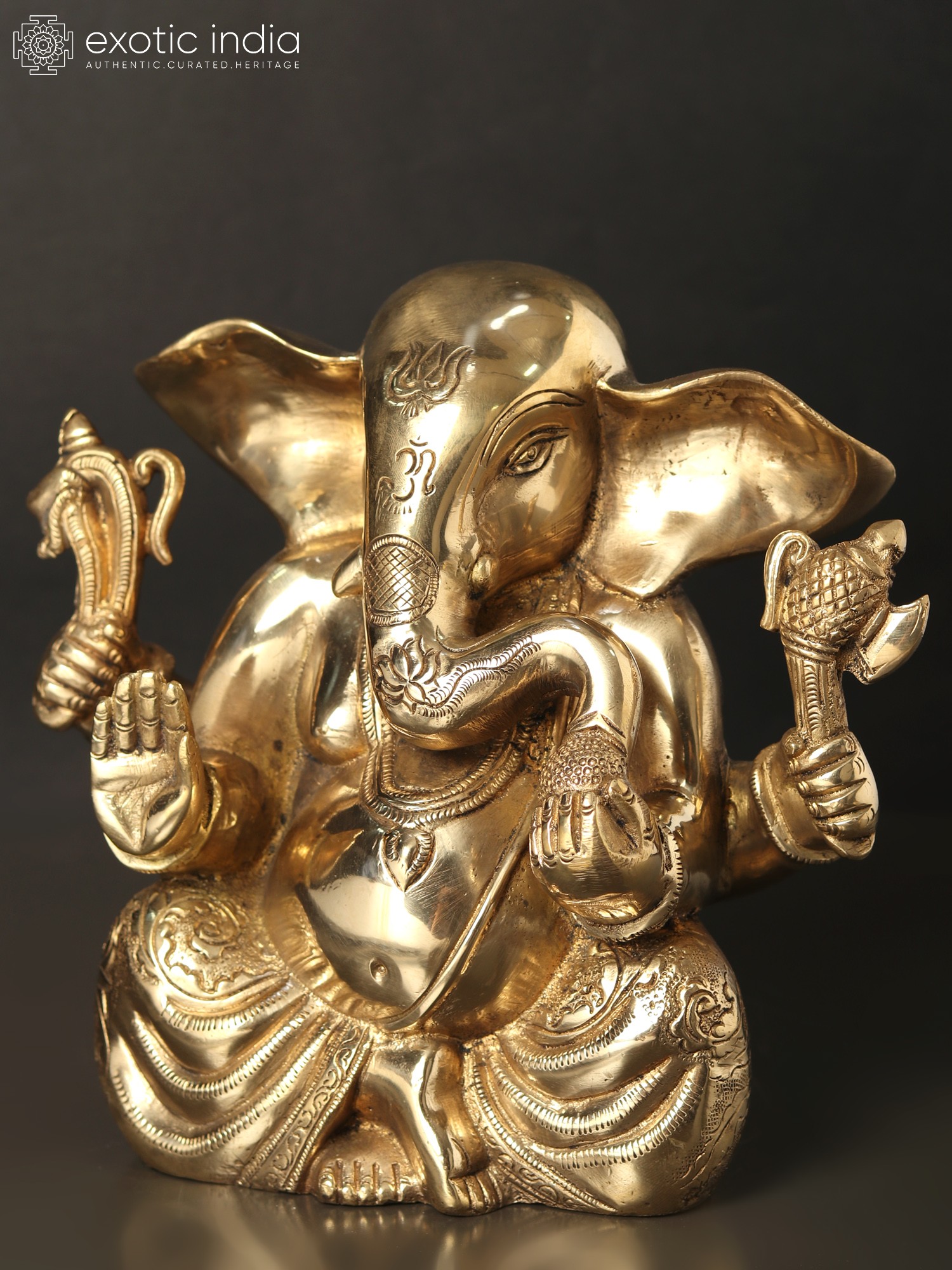 Seated majestically, Lord Ganesha, the enchanting deity of beginnings, cradles a noose and goad in his upper hands, symbols of control and guidance. With a benevolent countenance, his front right hand extends in “Ashirwad Mudra”, bestowing blessings upon all who seek his grace. His ears, like twin sails catching the whispers of the universe, are large and keen. The trident (Trishul) mark adorning his noble forehead exudes divine power. Ganesha enjoys a “Modak”, his favourite sweet, as a gesture of divine delight. Draped in the sacred Yajnopavita, Ganesha exudes purity. This brass creation is a testament to the divine presence of Lord Ganesha.