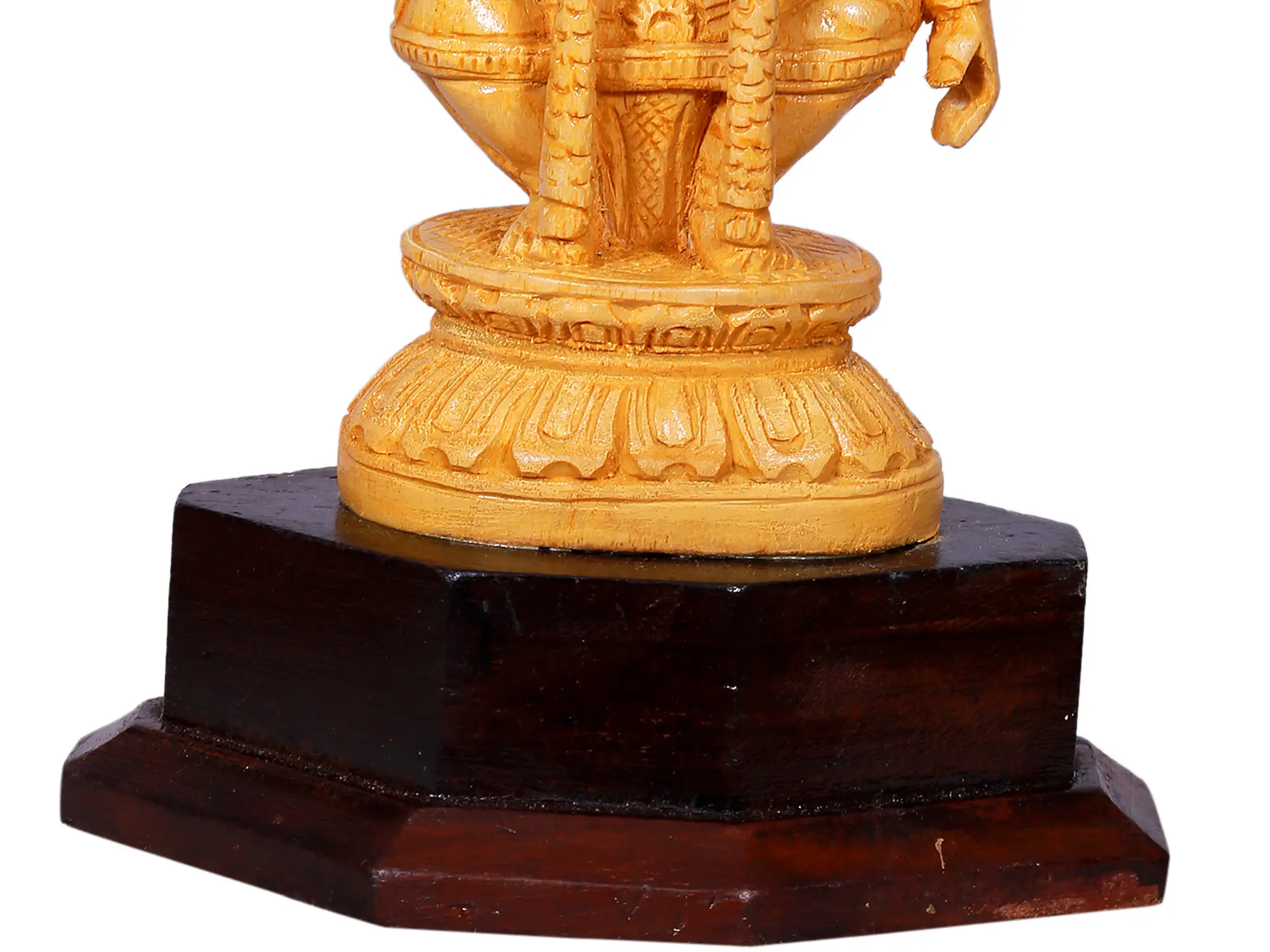 This statue depicts Lord Ayyappan in a seated posture, exuding an aura of calm authority and grace. His hands are raised, perhaps in a gesture of blessing or protection, a common representation of his benevolent nature. The intricate details of his attire, the jewelry, and the serene expression on his face are all brought to life through the skilled hands of the artisan. The statue rests upon a layered base, intricately carved to resemble a lotus, a symbol of purity and spiritual awakening, further enhancing its sacred appeal. The dark, polished wooden base provides a stable and elegant foundation, highlighting the natural beauty of the carved figure.