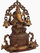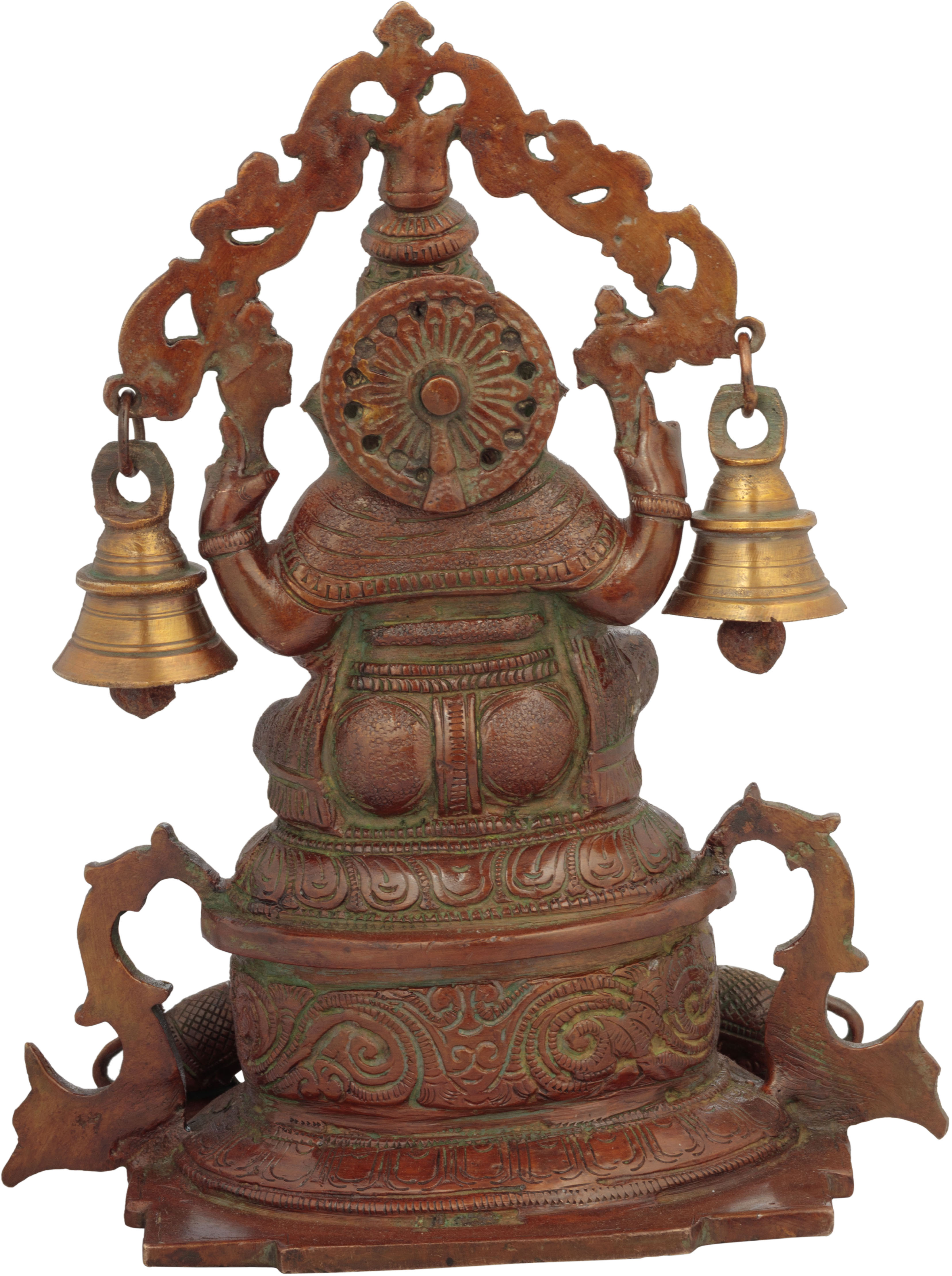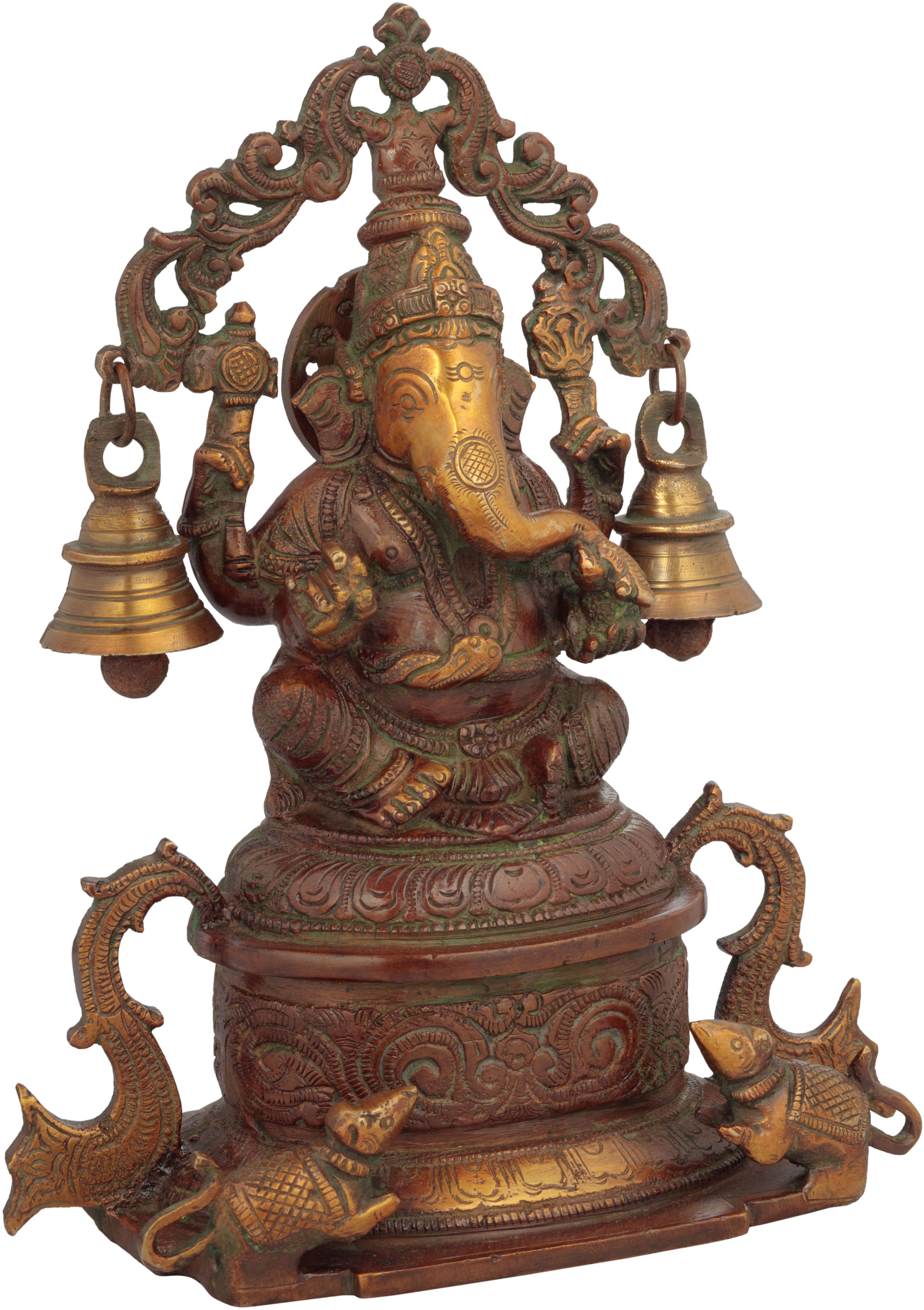 The Lord Ganesha Seated on a High Pedestal with Hanging Bells Aureole in Brass is a captivating representation of the beloved Hindu deity. Ganesha, the remover of obstacles, is seated regally on a lofty pedestal, exuding an aura of divine authority. The pedestal is ornamented with delicate carvings, and two vines come from both sides. Two Mooshaks sit underneath Lord Ganesha’s feet, signifying devotion. What sets this statue apart is the exquisite aureole adorned with hanging bells, creating a melodious and sacred atmosphere. The brass finish adds a touch of timeless elegance to the depiction. Ganesha's presence embodies wisdom, protection, and the promise of success, making this artwork not only artistically captivating but also spiritually significant, offering blessings and guidance to those who venerate him.