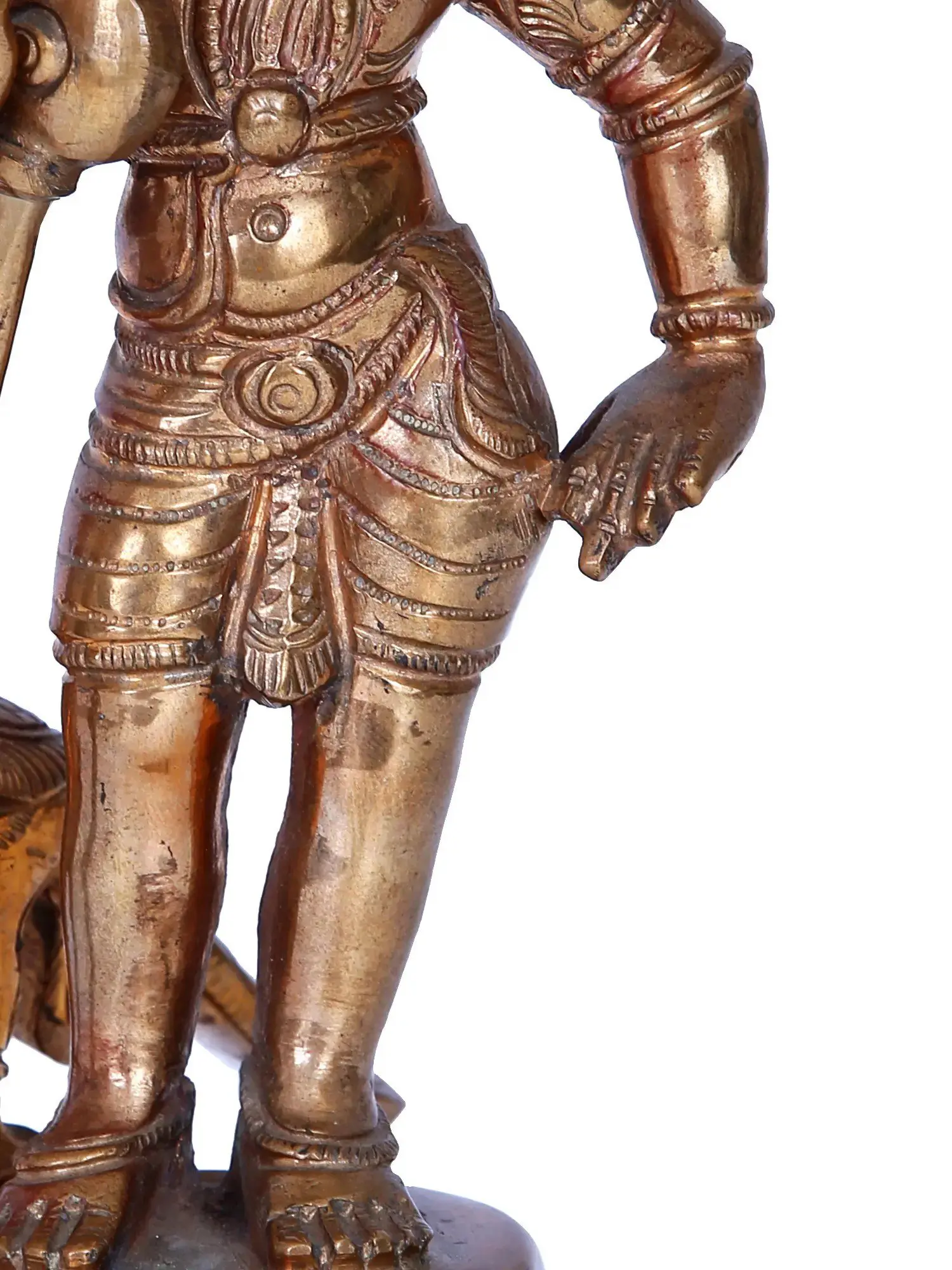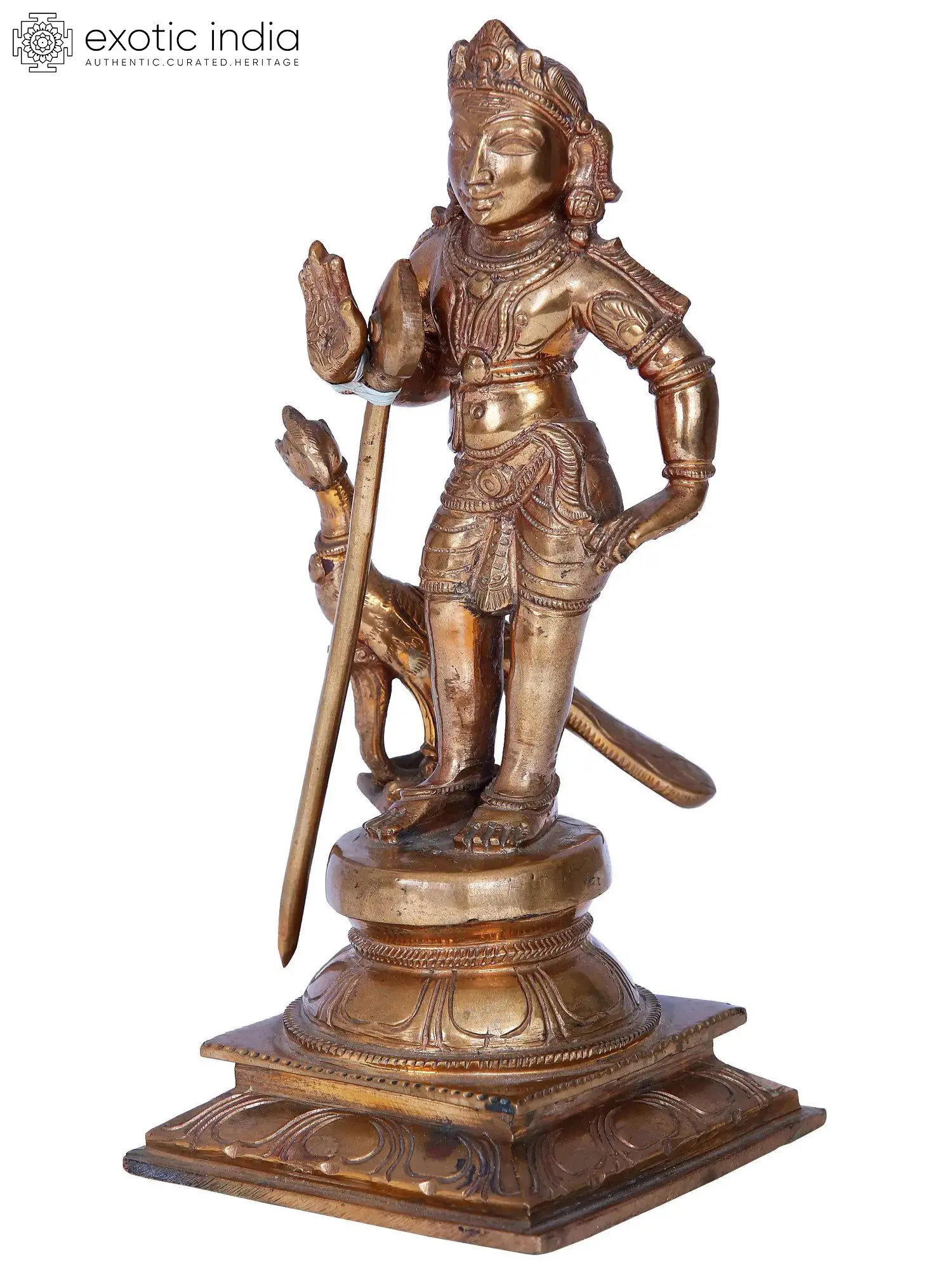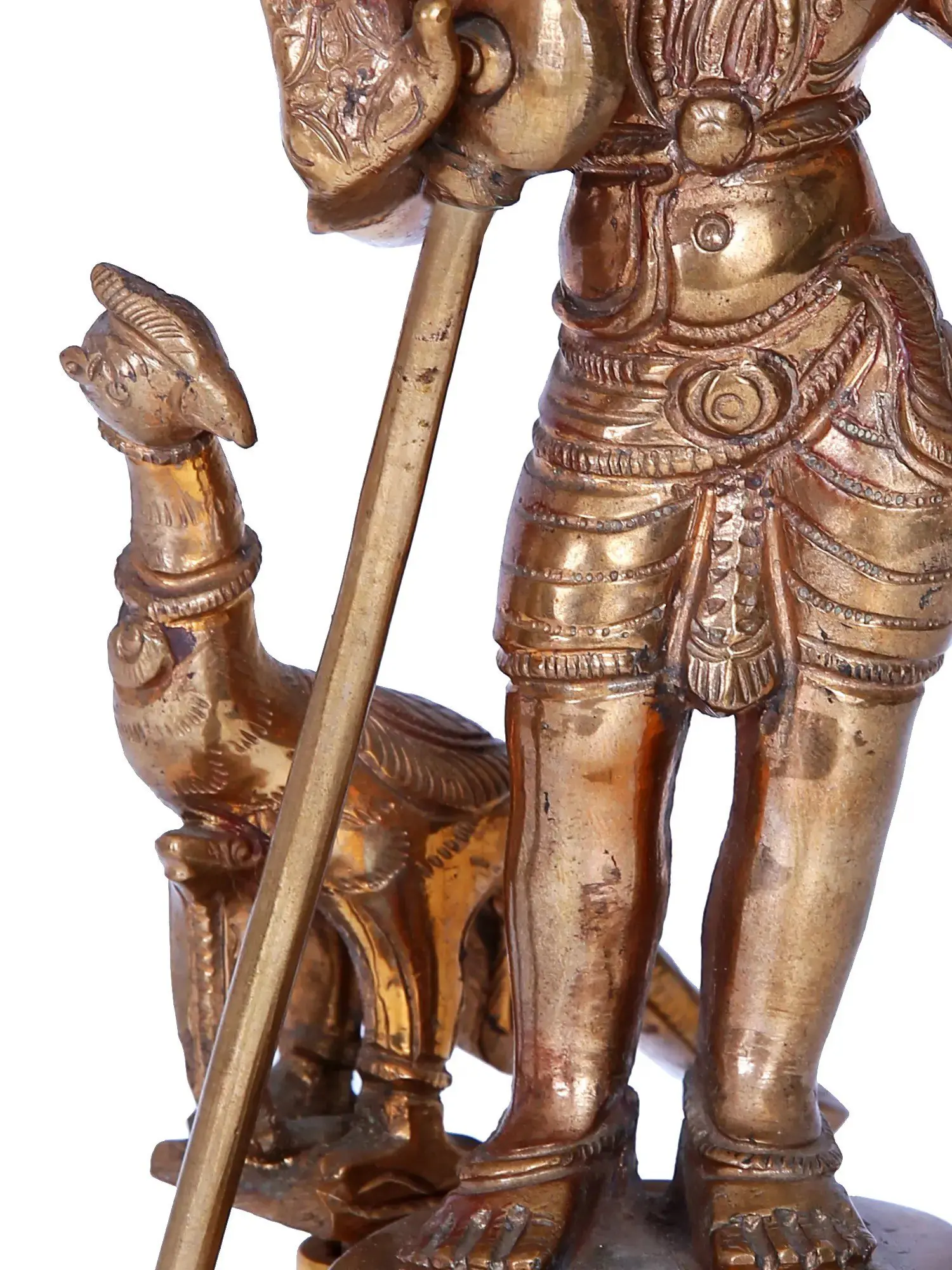 Embrace the divine valour with our Lord Murugan sculpture, meticulously crafted through Madhuchista Vidhanam in Swamimalai's Panchaloha Bronze. This idol beautifully portrays Lord Murugan, the warrior deity. Beyond its artistic finesse, the sculpture embodies the Hindu philosophical concept of 'Courage and Wisdom,' symbolising Murugan's attributes as a fearless warrior and wise philosopher. The lost-wax technique intricately captures the details, inviting you to connect with the divine energy that empowers and enlightens.