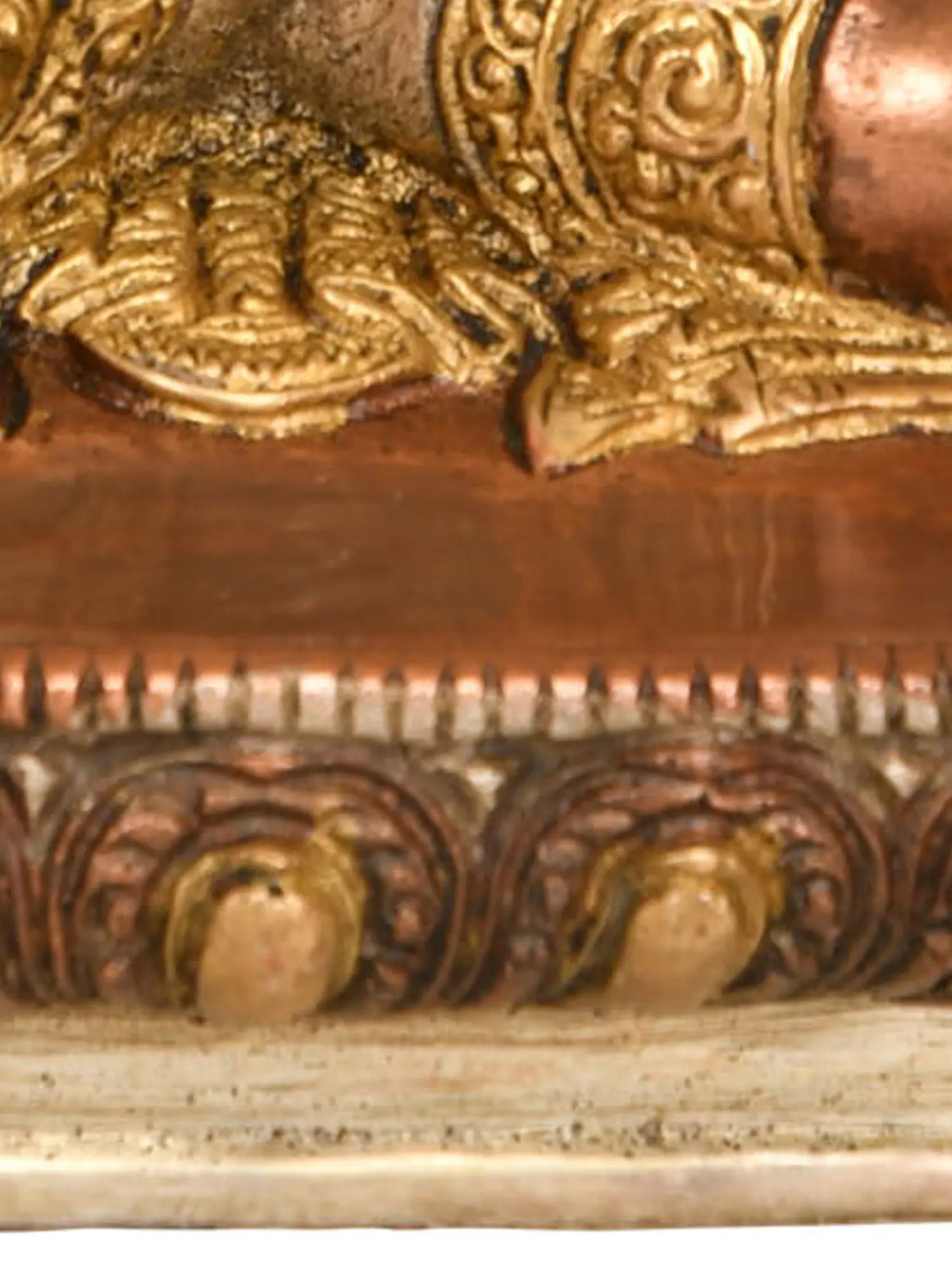This exquisite brass statue captures the serene visage of Lord Buddha in a deep state of meditation. Crafted with meticulous attention to detail, the statue embodies the profound peace and wisdom that the Buddha represents. The artist has skillfully rendered the tranquil expression, the gentle curve of the lips, and the downcast eyes, inviting the viewer into a world of inner calm. The traditional robes are adorned with intricate patterns, accented by a beautiful patina that speaks of age and reverence. The pose itself is iconic. Lord Buddha is seated in the lotus position, a posture signifying spiritual discipline and a connection to the earth. His hands are cupped together, holding a *Pindapatra*, an alms bowl. This detail is deeply symbolic, representing the Buddha's renunciation of worldly possessions and his reliance on the generosity of others for his sustenance. It also signifies his role as a spiritual alms-giver, bestowing the teachings of the Dharma upon all beings. In Tibetan Buddhism, the *Pindapatra* is not just an object of necessity but a reminder of humility, detachment, and the impermanence of all things.