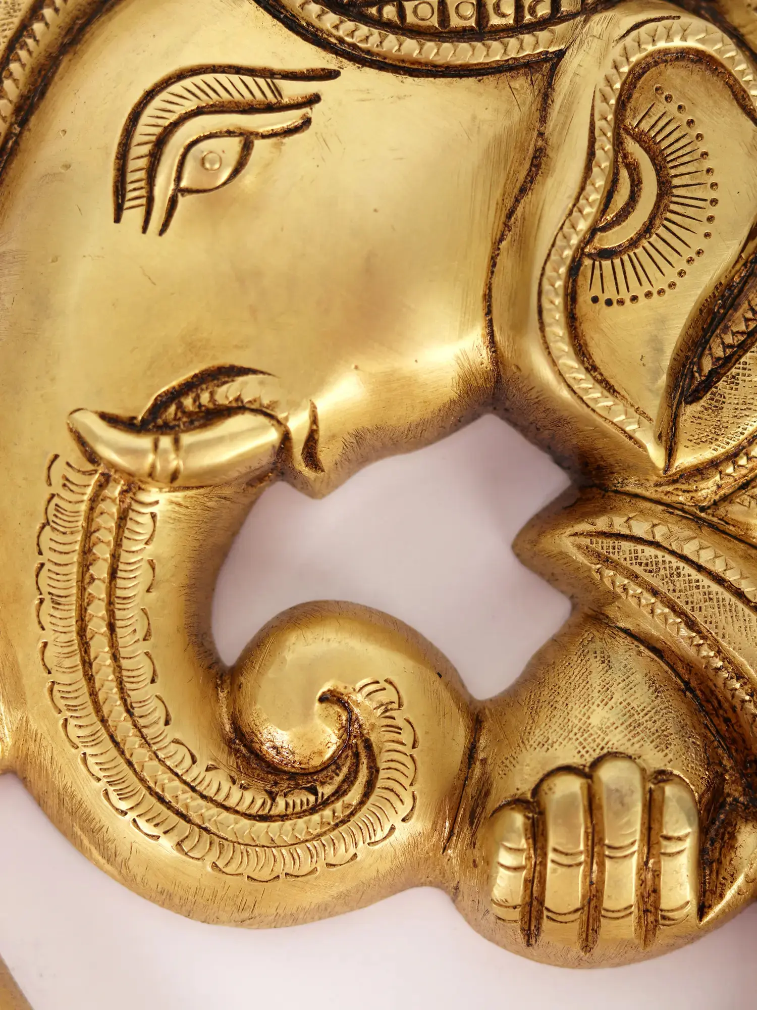 A sacred and deeply profound icon of Hinduism, the ‘Aum’ beholds the entire cosmos within its form. In this gorgeous depiction of Aum, the initiator deity - who’s the remover of the obstacles and source of wisdom; seated is Lord Ganesha. Holding his favorite modak, he blesses the devotees in protection as seen on this brass wall decor piece.