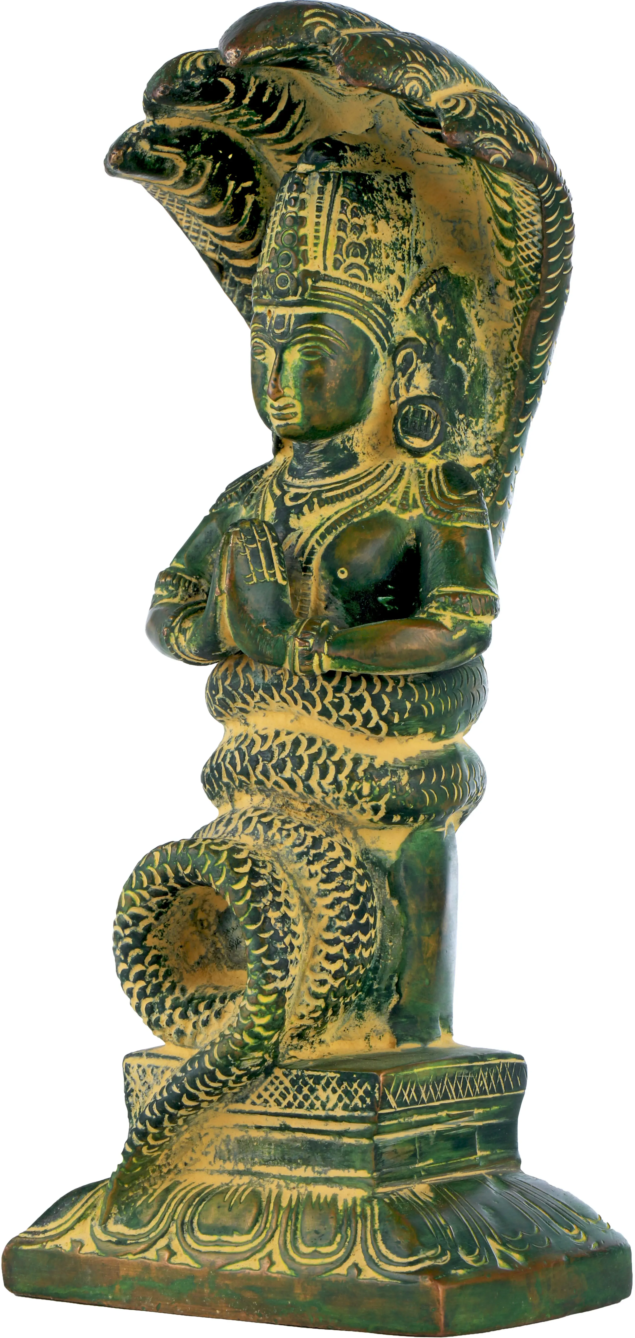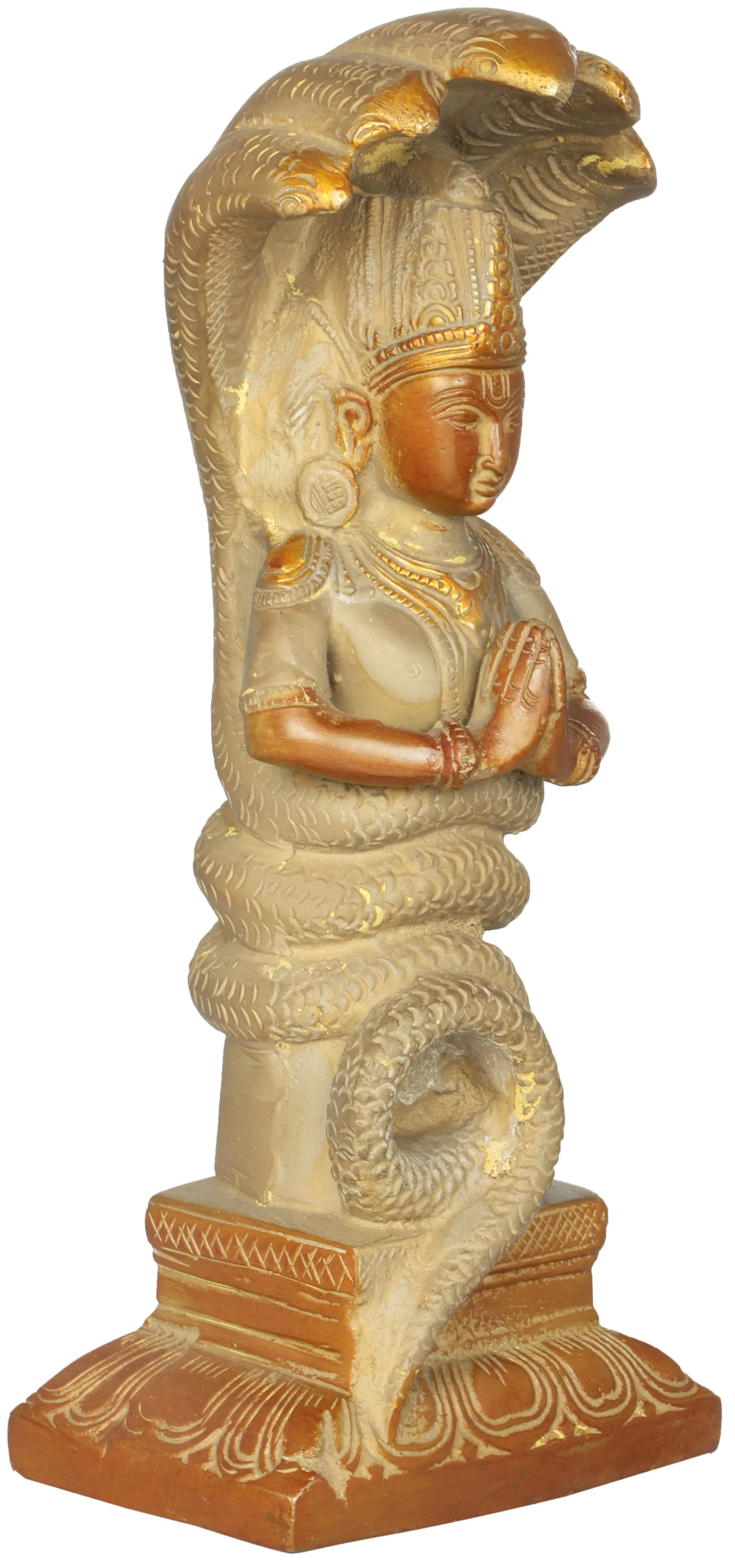 This brass statue of Patanjali, the revered sage of yoga, is a captivating embodiment of ancient wisdom. It boasts a stunning red chola color, symbolizing vitality and energy. Here, Siddhar Patanjali is portrayed with a protective sesh naga hood, signifying his connection to the serpent deity. Half his body is gracefully coiled like a serpent, exemplifying his deep understanding of yoga and meditation. He stands in the Namastey posture, an homage to the spiritual tradition he helped shape. This statue is a testament to the profound teachings of Patanjali and his profound influence on the practice of yoga and spiritual enlightenment.