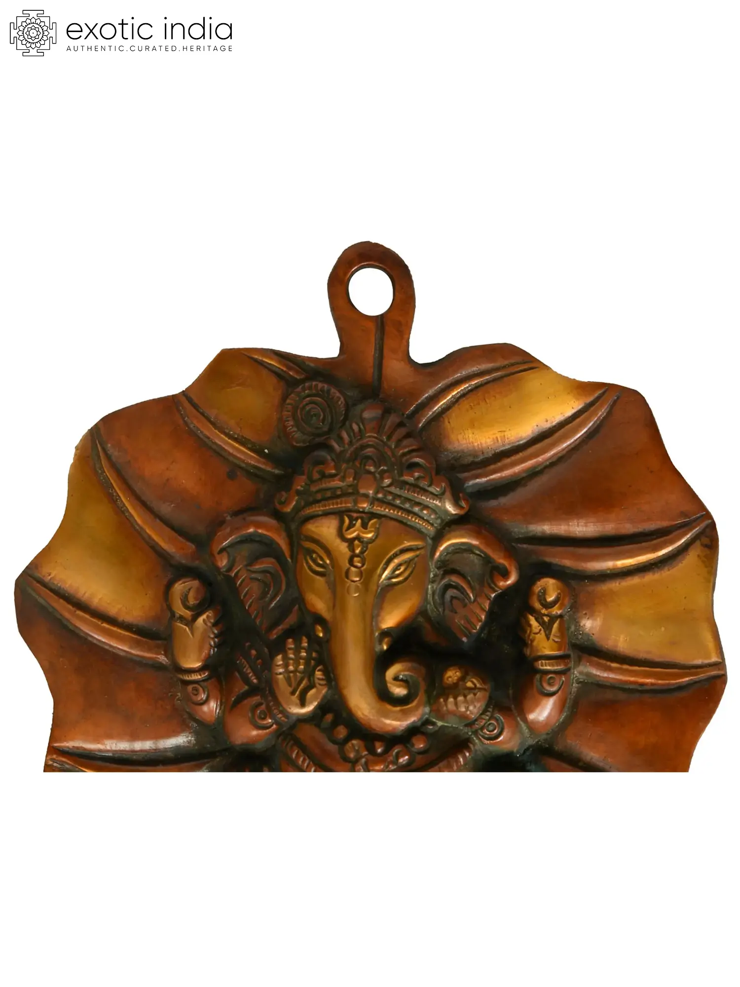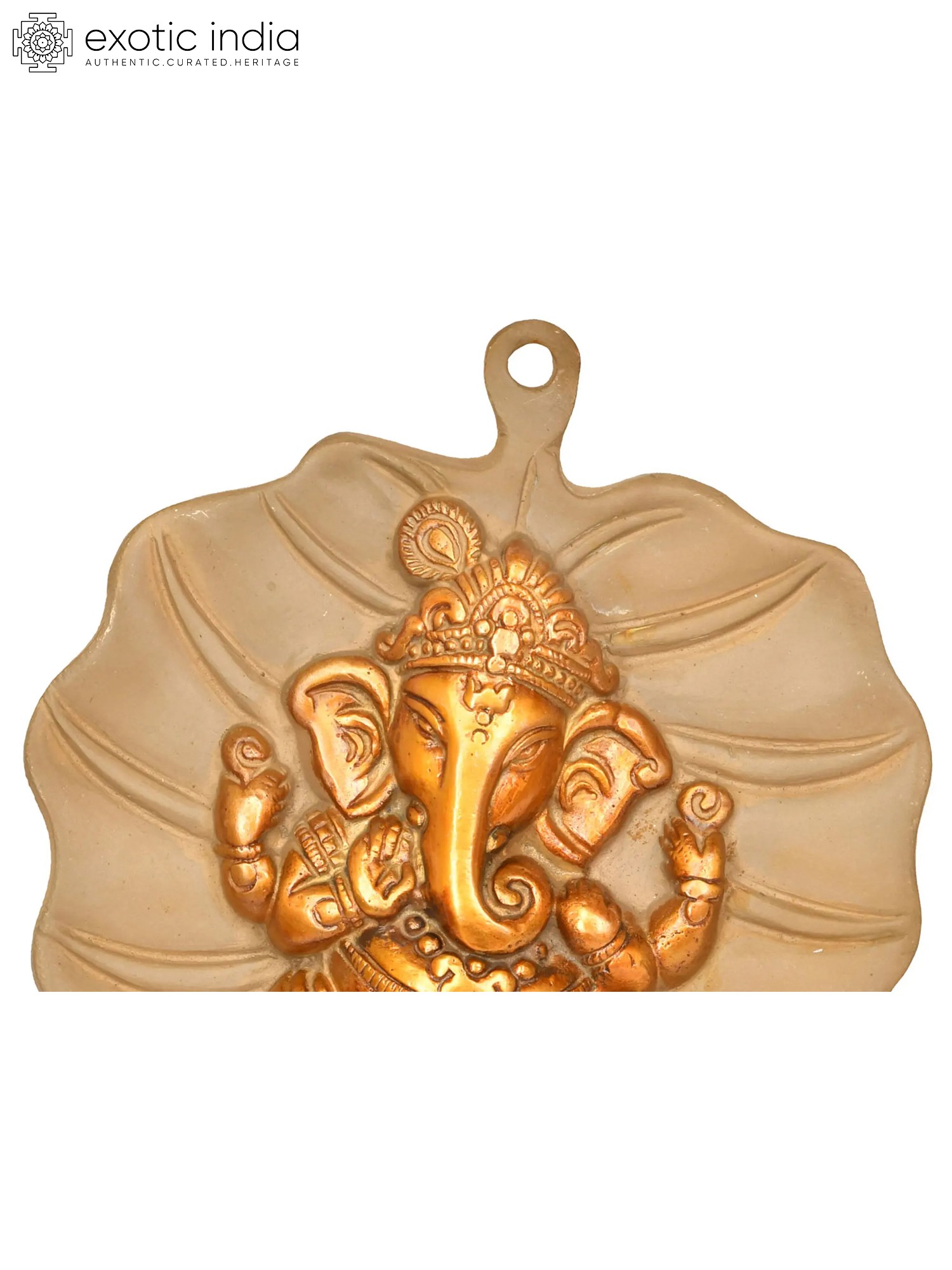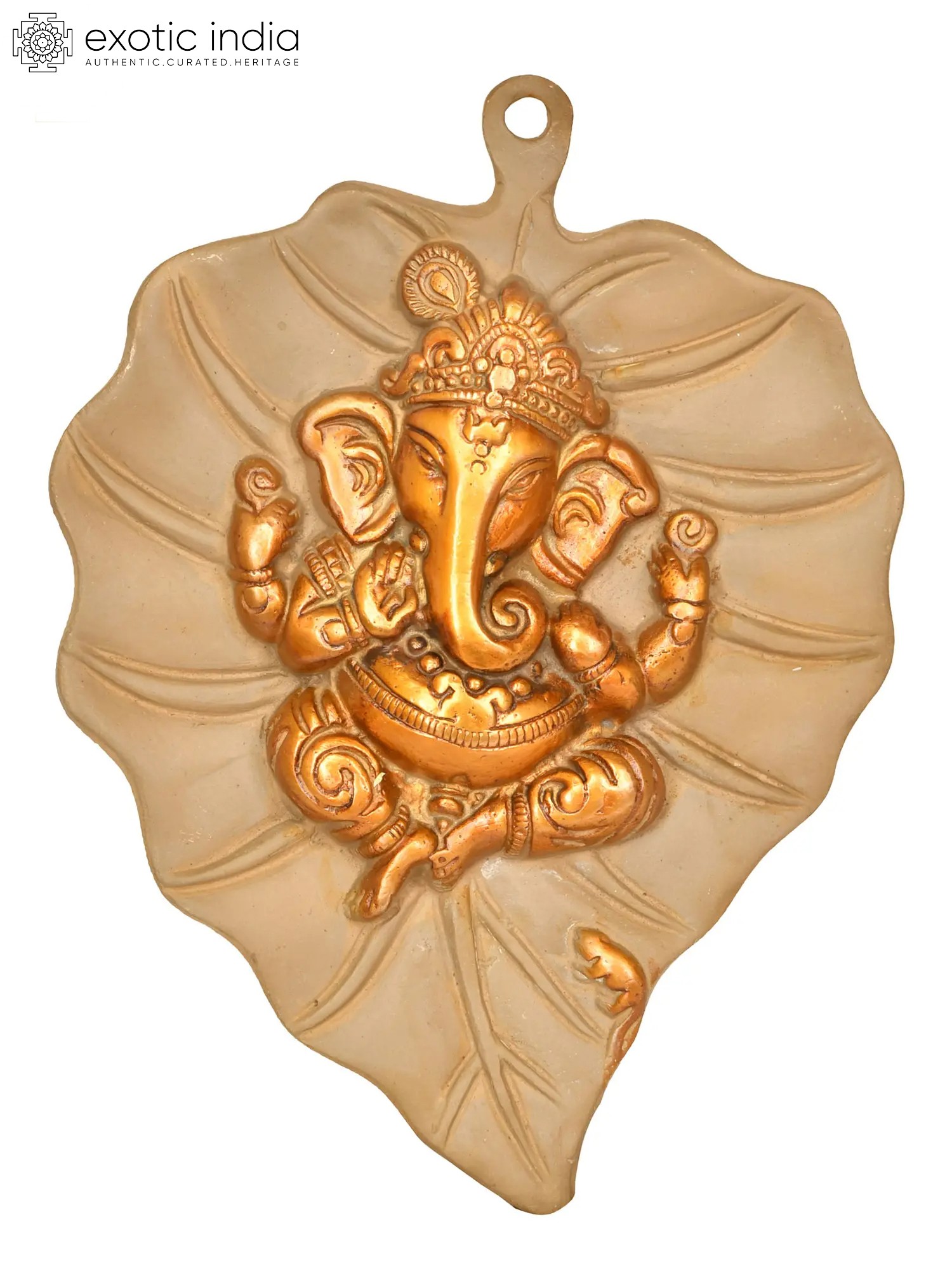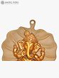 Lord Vishnu and Goddess Lakshmi have heavenly residences on the Pipal tree. This wall hanging in the shape of a pipal leaf represents the Pipal leaf's significance in Hinduism. At the heart of this sculpture is the revered sign of Lord Ganesha. The double chola color makes the piece look regal. The presence of Lord Ganesha completes the plate's auspiciousness. It is a holy ceremonial item that enables the inflow of blessings of Lord Ganesha along with the sacredness of the Pipal tree.