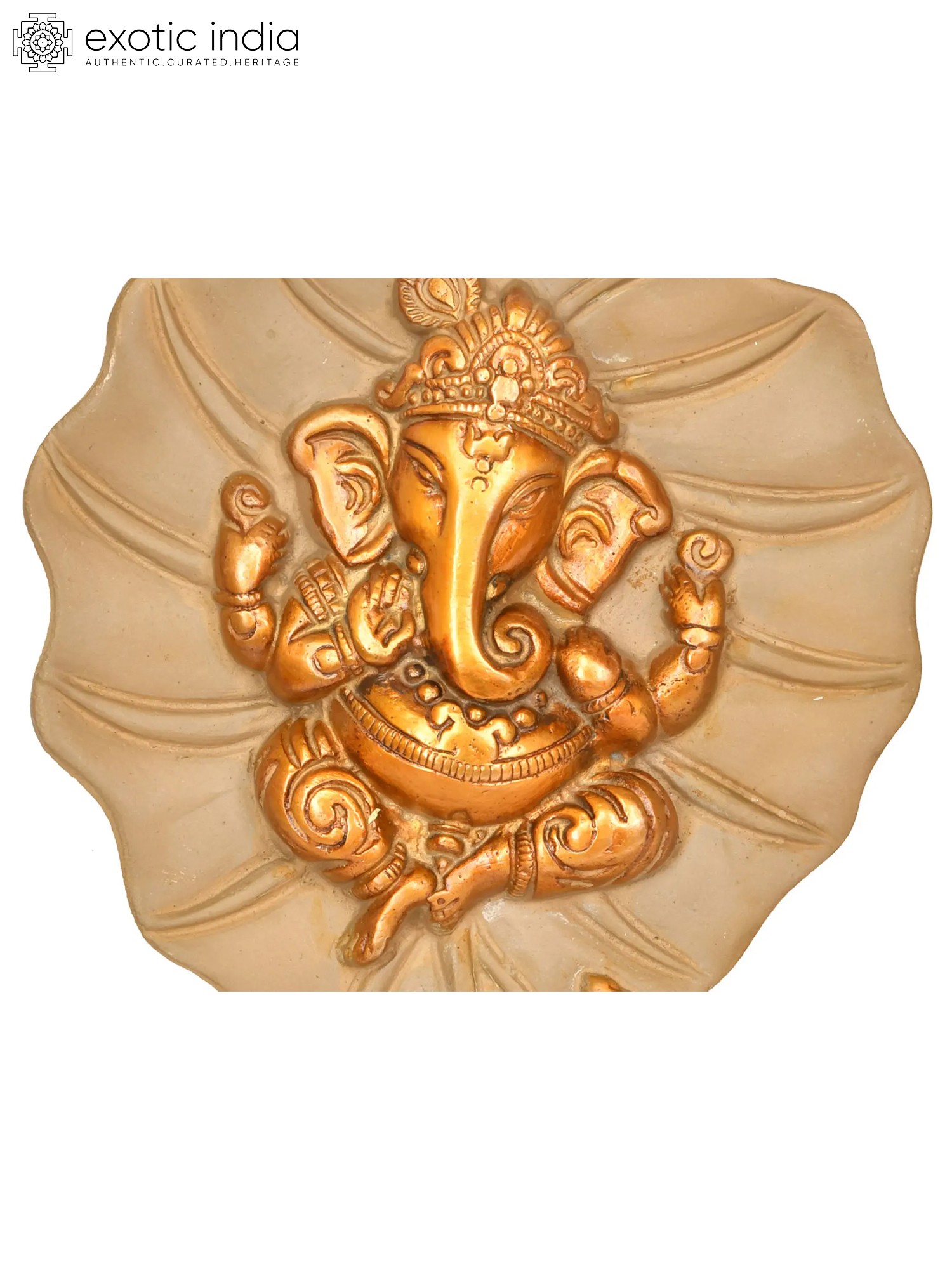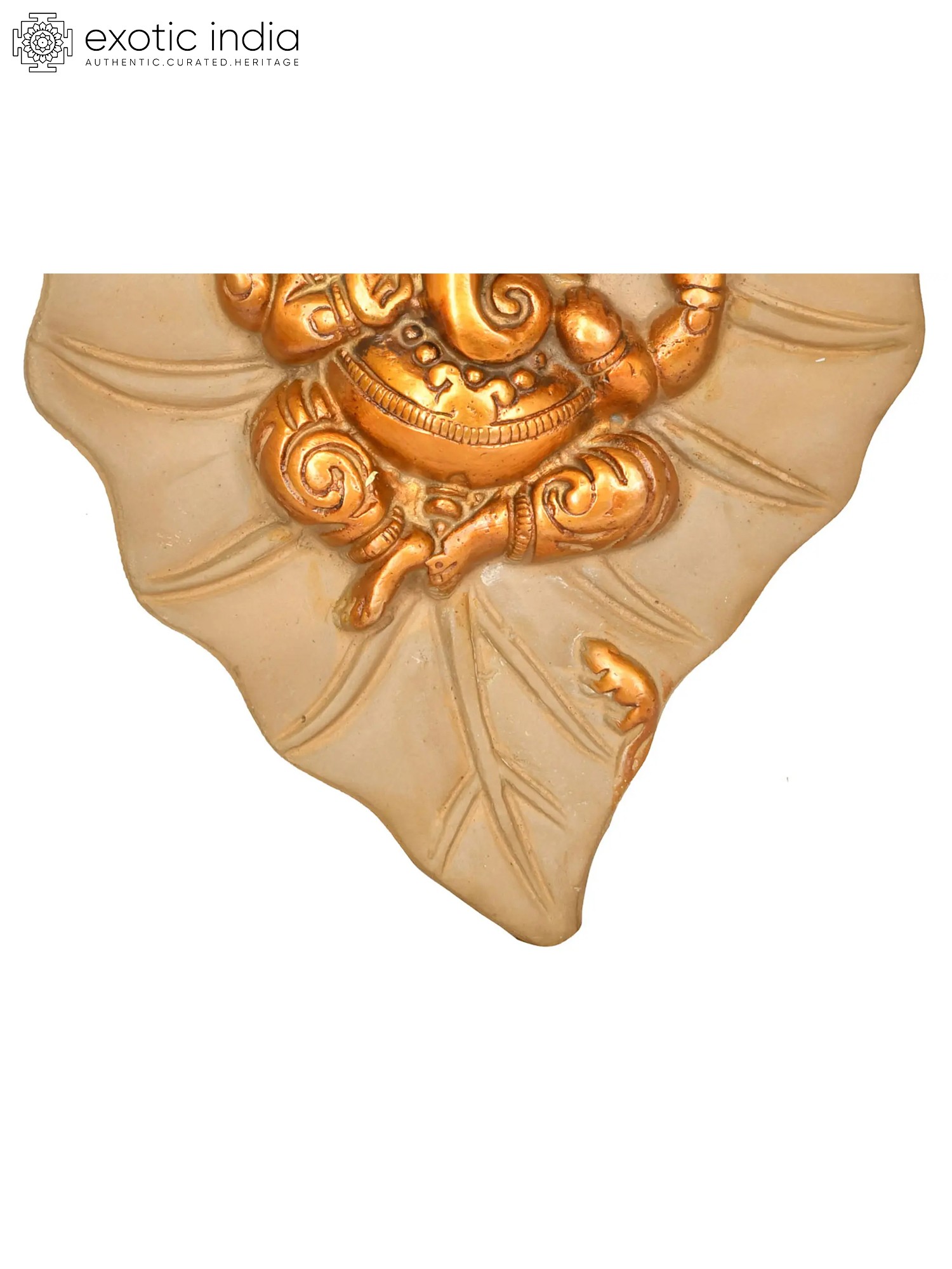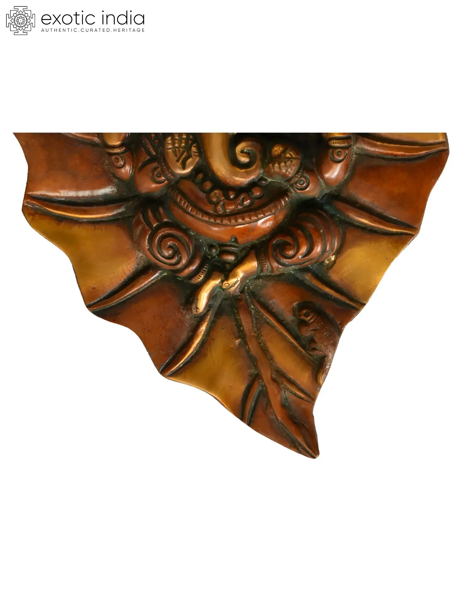 Lord Vishnu and Goddess Lakshmi have heavenly residences on the Pipal tree. This wall hanging in the shape of a pipal leaf represents the Pipal leaf's significance in Hinduism. At the heart of this sculpture is the revered sign of Lord Ganesha. The double chola color makes the piece look regal. The presence of Lord Ganesha completes the plate's auspiciousness. It is a holy ceremonial item that enables the inflow of blessings of Lord Ganesha along with the sacredness of the Pipal tree.