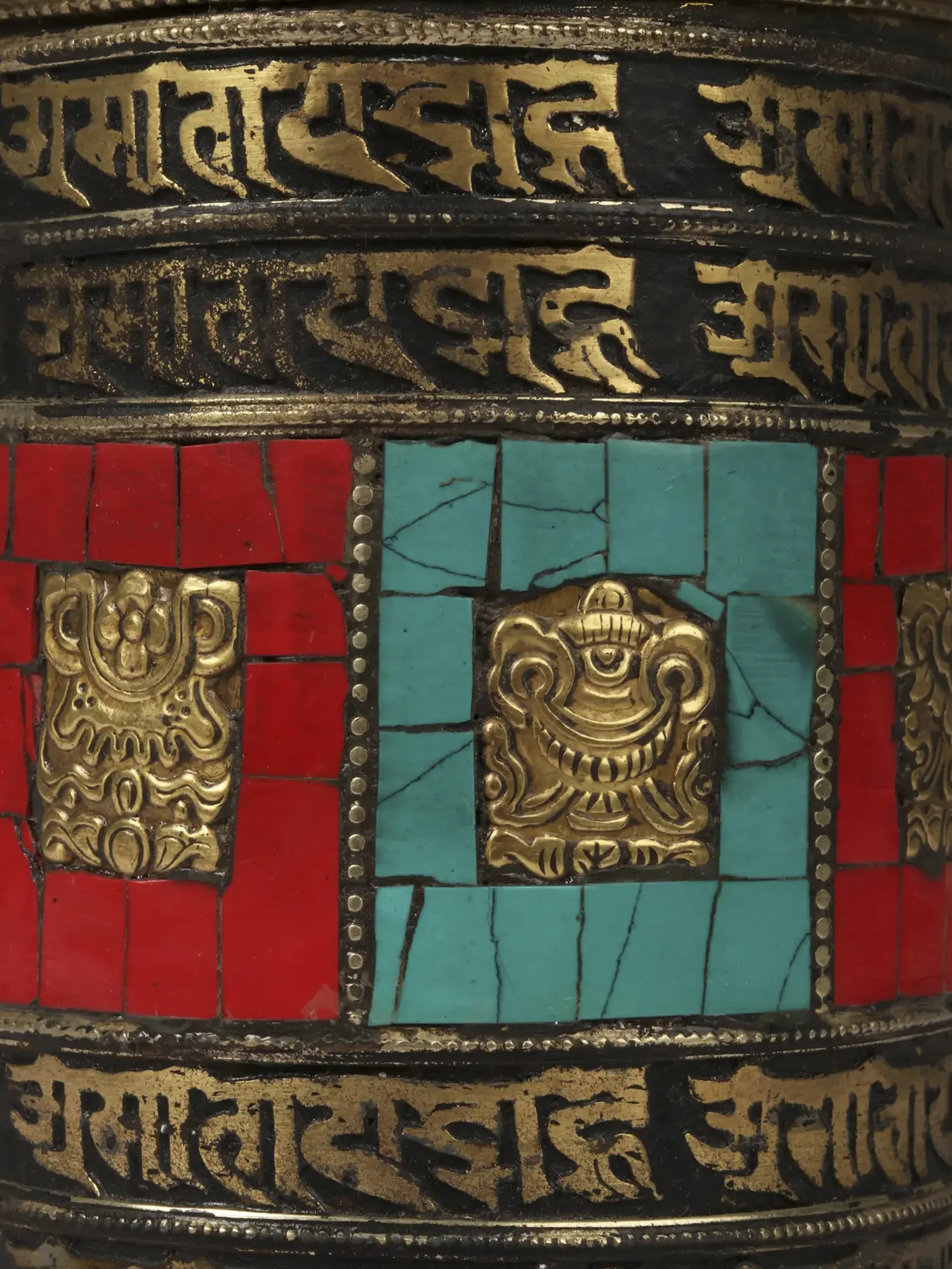 In Tibetan Buddhism, a prayer wheel is a powerful tool for ritual meditation. An initiate uses it as they chant the mantras that their Gurus have given them as linguistic passageways to the highest level of enlightenment. This brass prayer wheel strikes a balance between the holiness of the symbol and traditional aesthetics with its superb inlay work. The prayer wheel is expertly sculpted and decorated with the Ashtamangala, or Eight Auspicious Signs of Buddhism, making it a powerful item to display in your house.