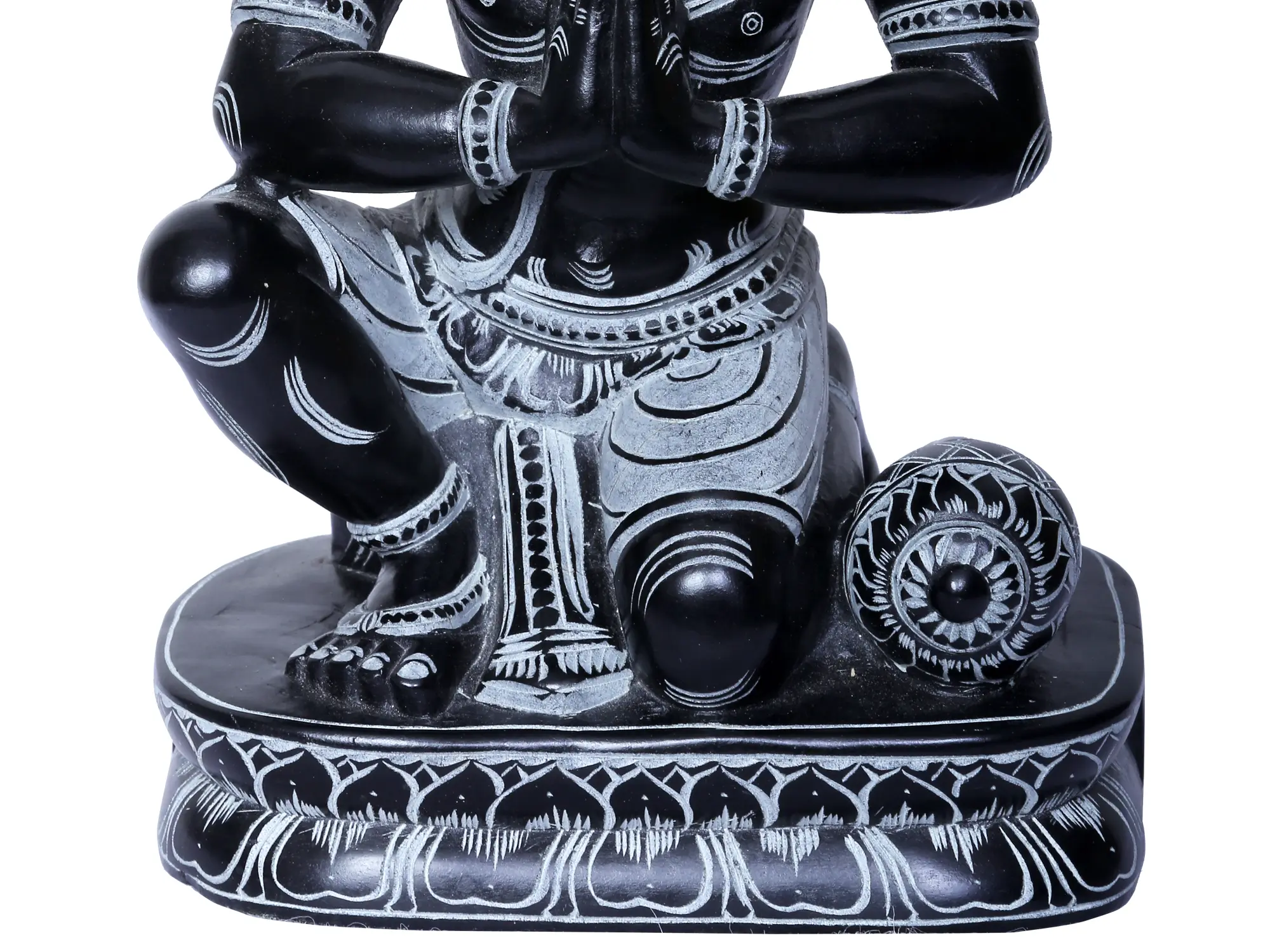 , the gesture of folded hands in prayer and reverence, signifies deep humility and devotion. In this posture, Hanuman embodies the ultimate devotee, his gaze serene yet powerful, reflecting his inner peace and unwavering faith. This sculpture is a testament to the rich artistic heritage of South India, where stone carving has been an esteemed craft for centuries. The artisans of Mahabalipuram are renowned for their ability to breathe life into stone, and this Hanuman statue is no exception. The intricate carvings adorning his headdress, ornaments, and the fiery halo behind him tell a story of divine power and celestial grace. The finely etched details, from the fur on his face to the folds of his garment, showcase the skill and dedication of the craftsman. The form of Hanuman, often depicted as a powerful Vanara (a forest-dwelling humanoid ape), is presented here with a divine aura. The characteristic monkey features are subtly incorporated, exuding a sense of strength and agility. The halo, embellished with traditional motifs, suggests his divine origin and his connection to the cosmic energy. The presence of a mace, often associated with Hanuman as a weapon of great might, is also depicted, hinting at his protective and valorous nature.