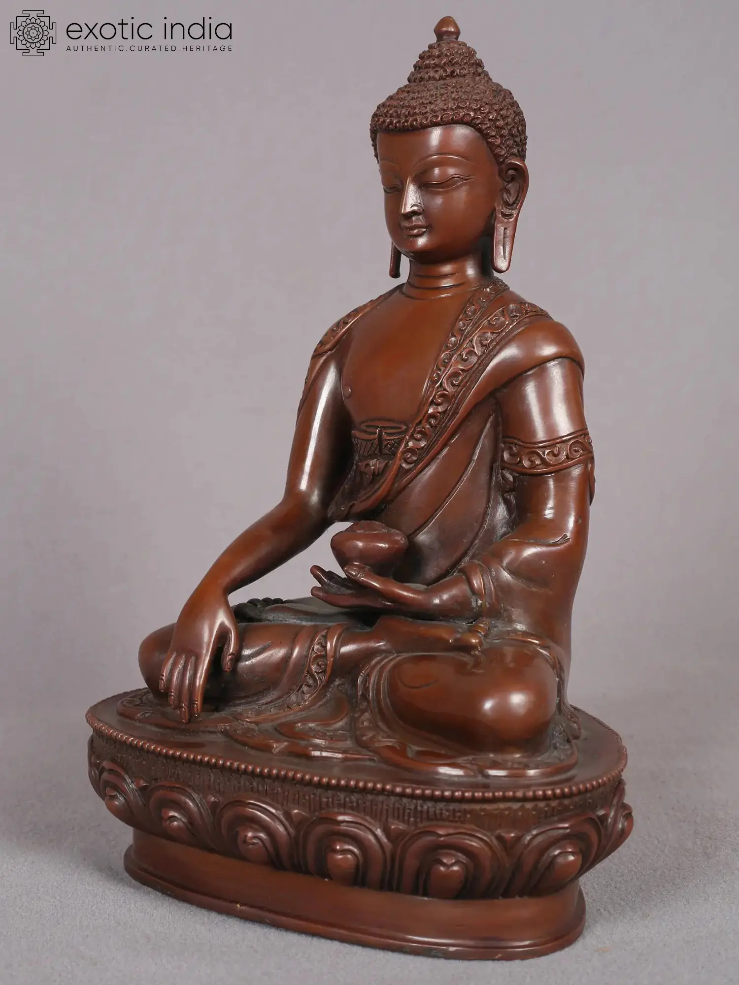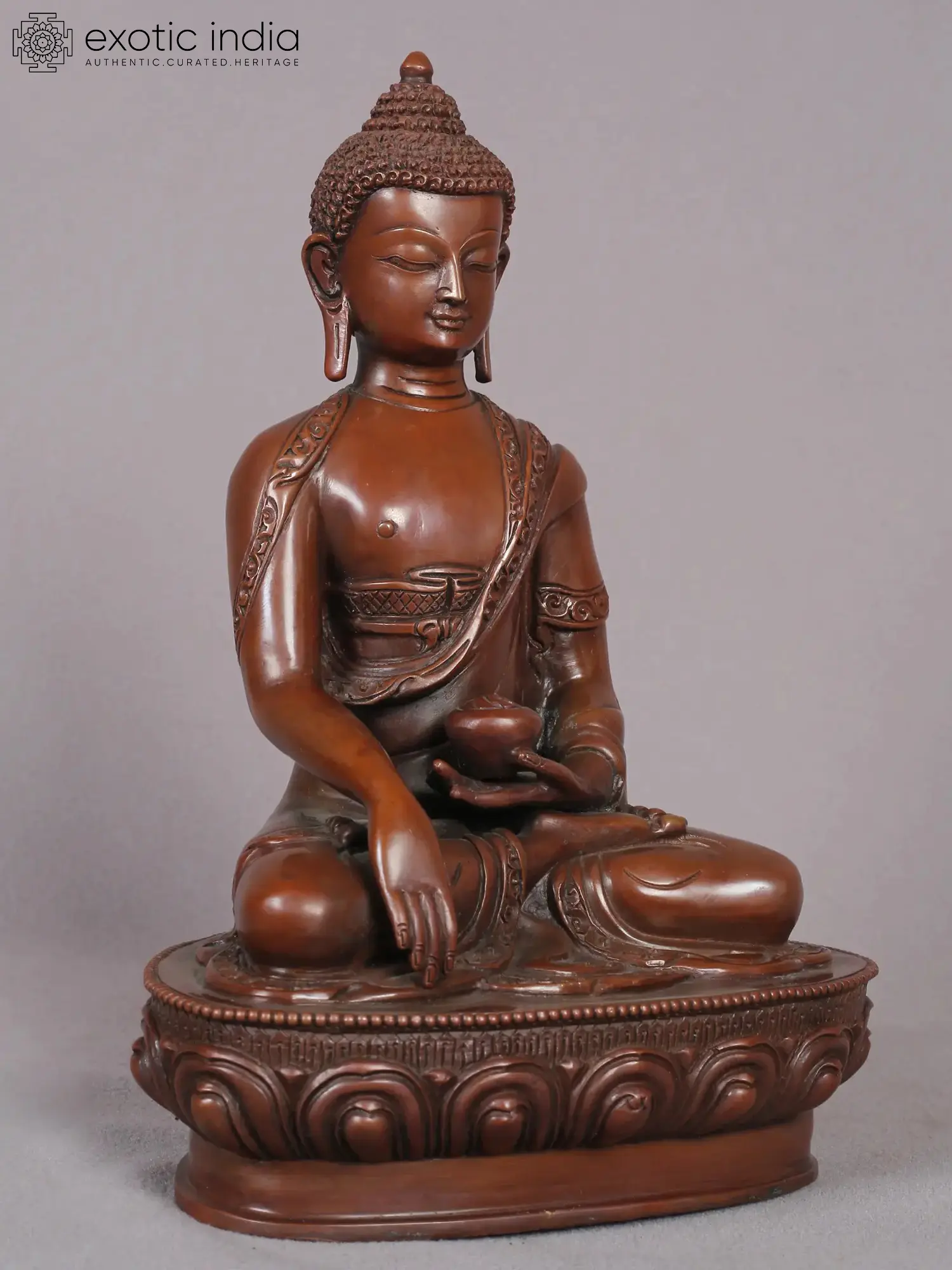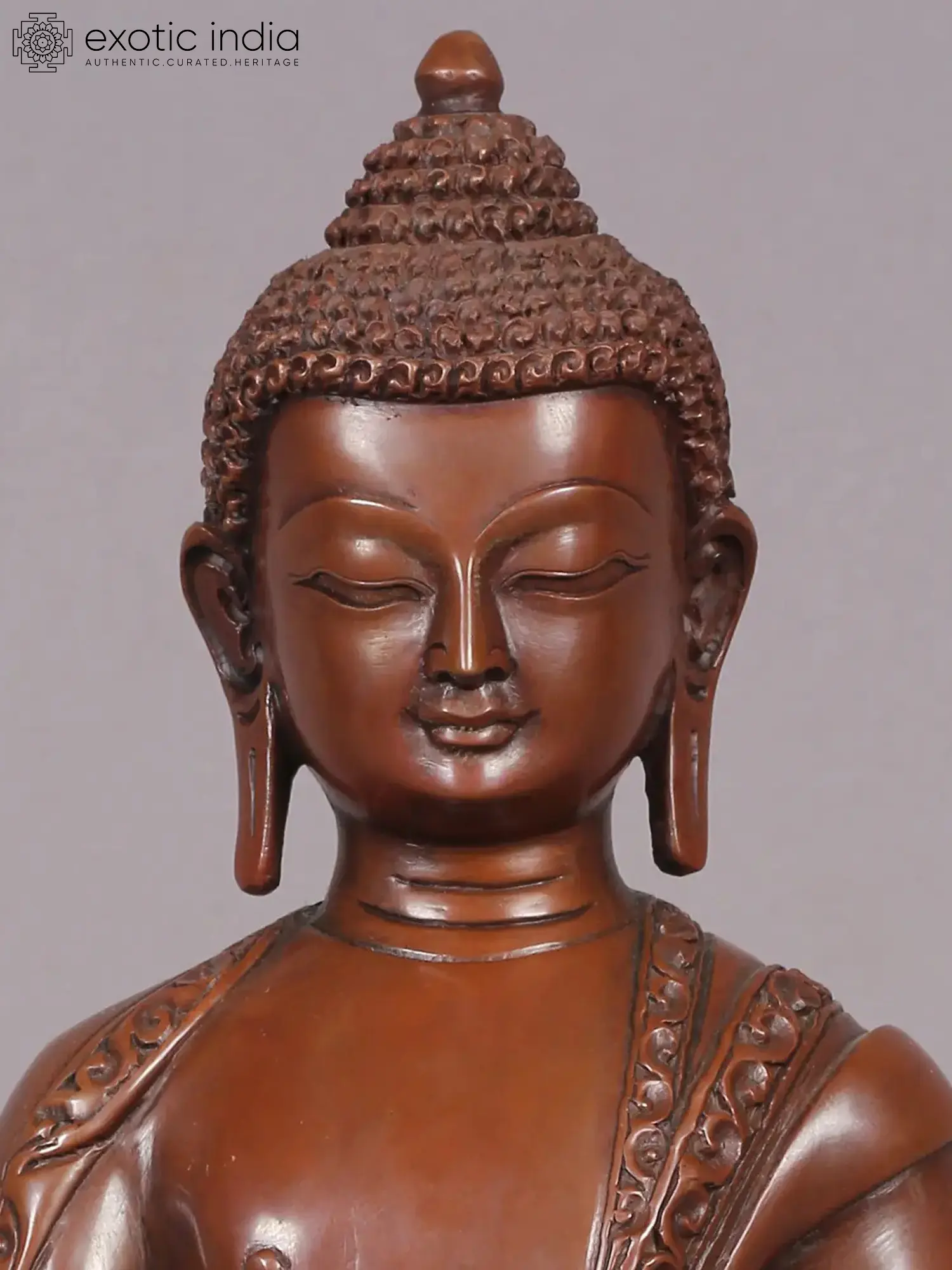 Emerging from the foundation of Buddhist philosophy, crafted by the skilled artists of Nepal, this meticulously sculpted copper statue of Shakyamuni Buddha stands tall, radiating an undeniable aura of peace and spiritual awakening.