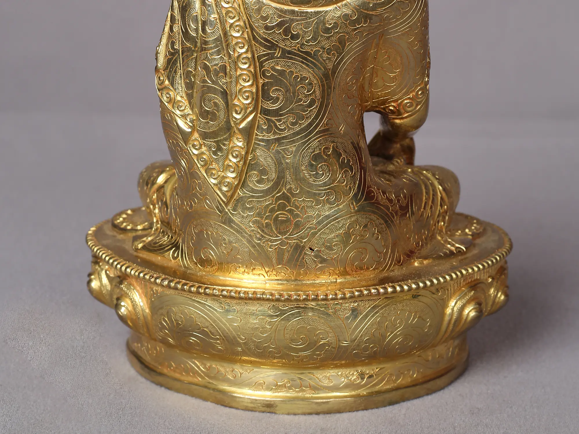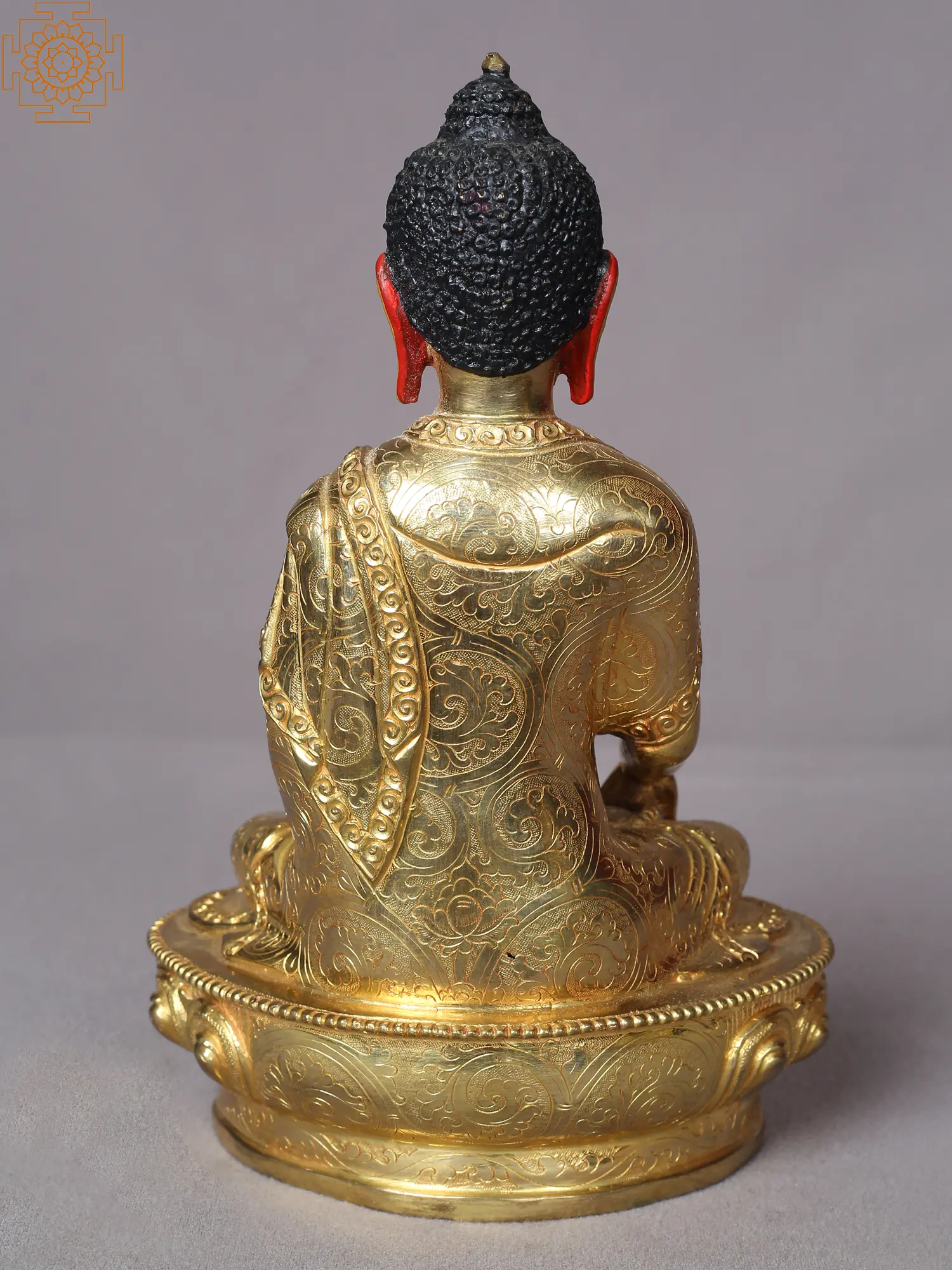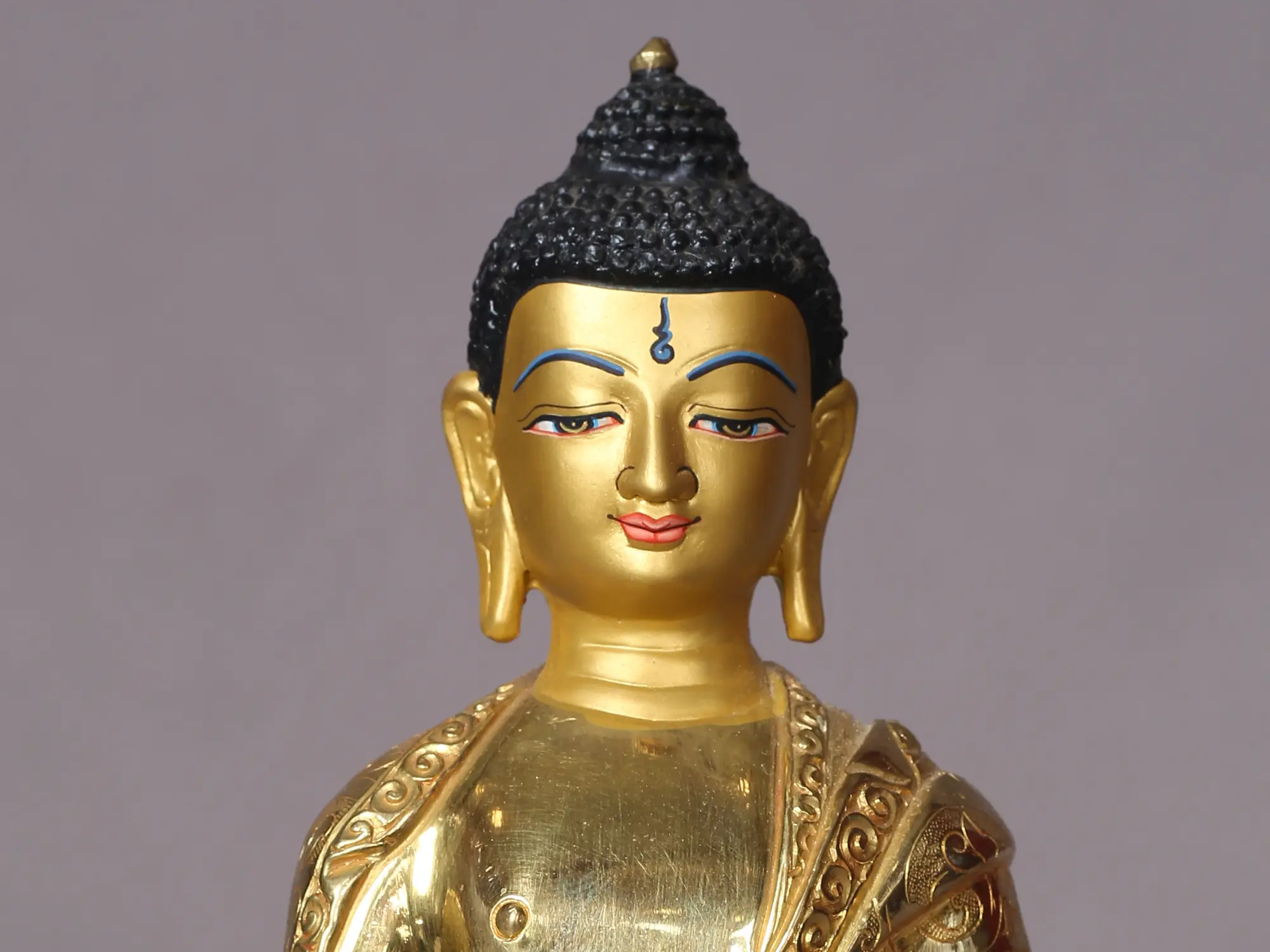 This gilded copper Nepalese statue of the Buddha is a potent tool for the disciples of Tathagata to see and realize his enlightenment. Buddha is depicted sitting on a lotus flower, which represents an enlightened mind, and has his hands in the Dhyana mudra while carrying a monk's bowl. The Buddha's facial features are depicted in this statue with exquisite realism, which gives the piece of art an unfathomable fascination.
