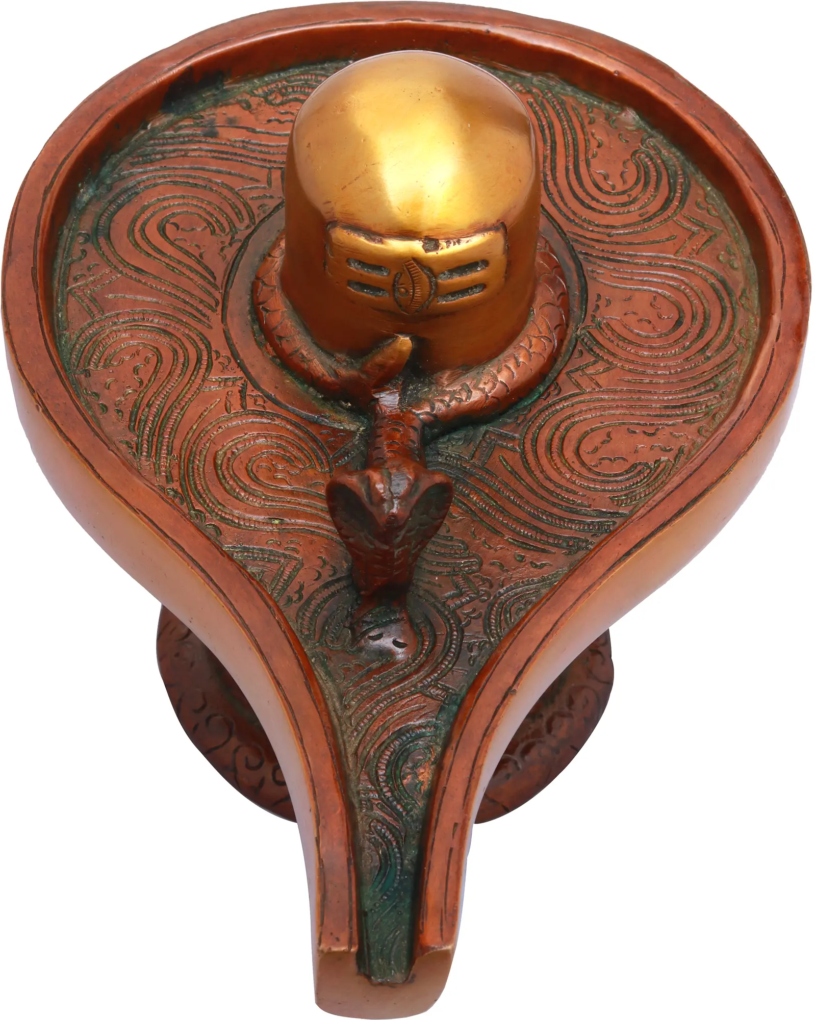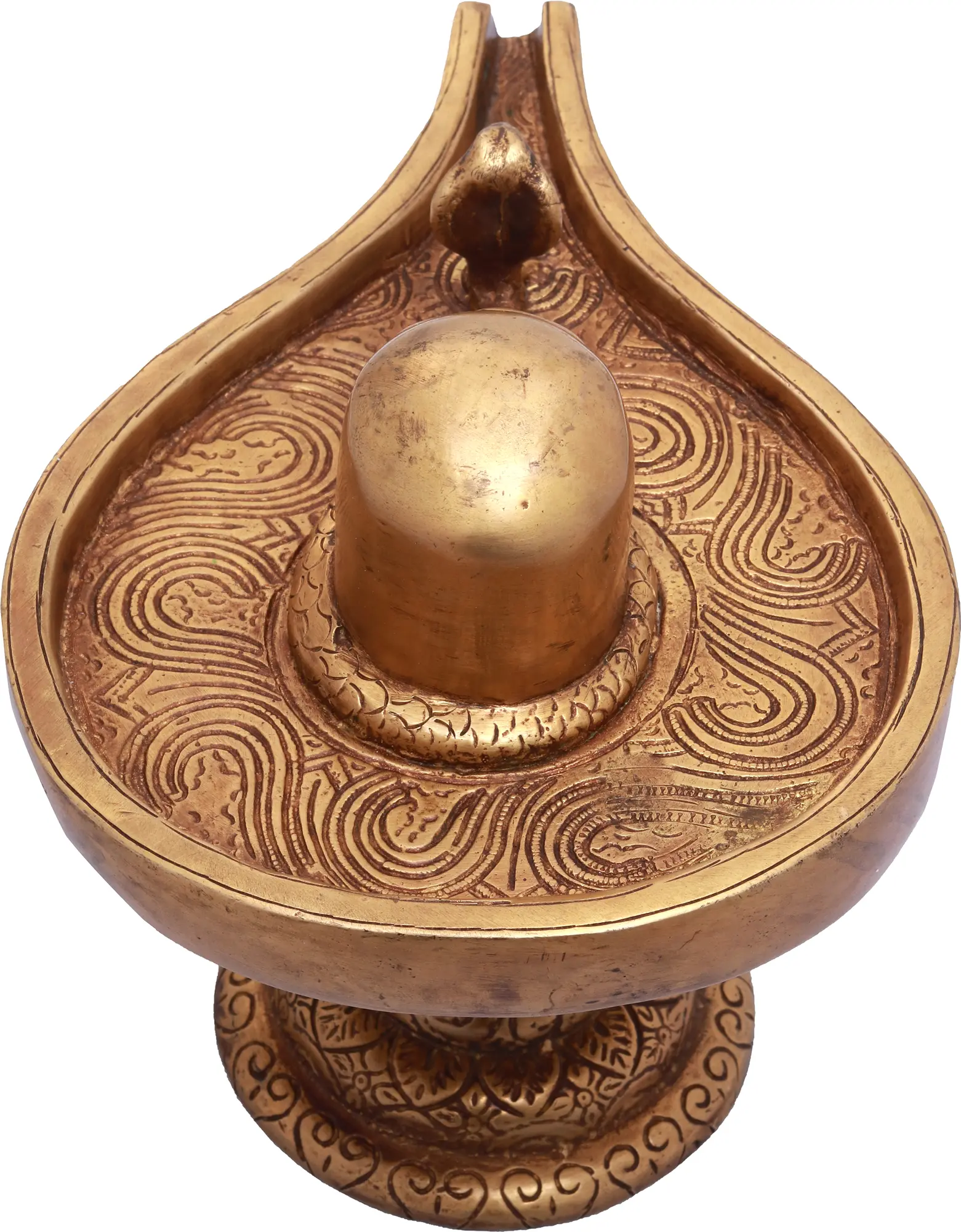 The Shiva Linga represents Lord Shiva and is connected to creation. This brass version of the Shiva Linga adheres to the traditional iconography of the Shiva Linga but is embellished with some designs of flora and fauna and also the Tri-Pundra and Third Eye. The base is a triangular projection that aids in draining the offerings made to the Shiva Linga. The base or stand is fully decorated, lending a regal touch to the Shiva Linga. With all its symbolism, this Shiva Linga is a masterful homage to Lord Shiva's power of creation.