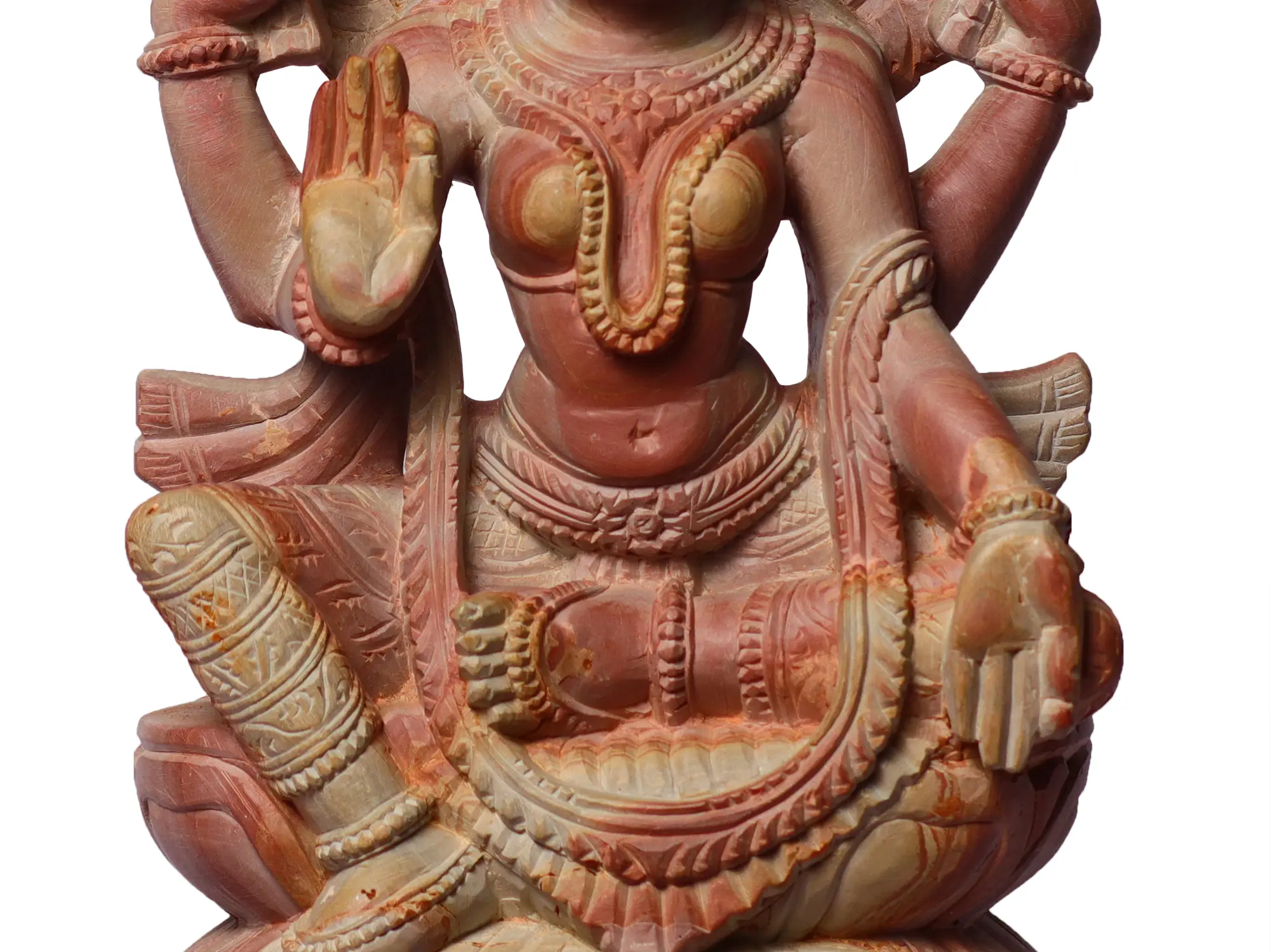 The Sitting Goddess Lakshmi is a beautiful pink stone statue that radiates prosperity and abundance. Goddess Lakshmi, the embodiment of wealth and auspiciousness, sits gracefully with her two lotus flowers in hand. Her benevolent expression exudes love and compassion. The importance of gratitude and contentment in attracting abundance into our lives is radiated through this sculpture. Goddess Lakshmi's presence inspires us to appreciate the blessings we have and to embrace an attitude of gratitude, inviting prosperity and happiness into our hearts and homes.