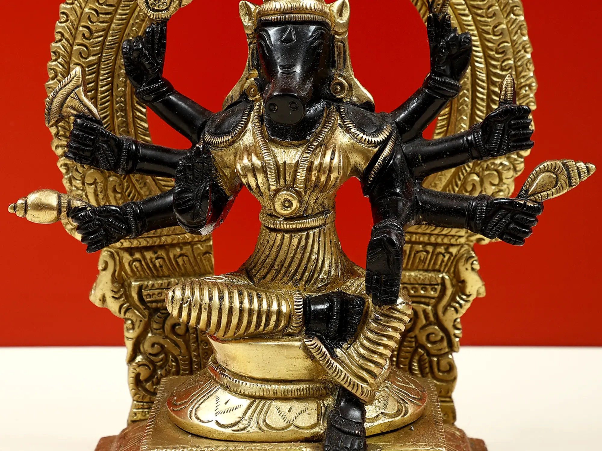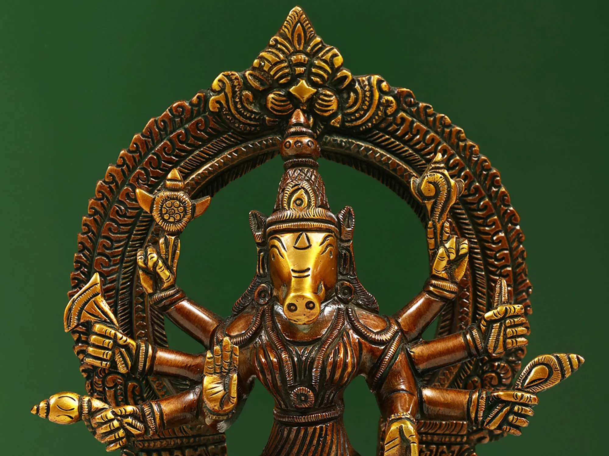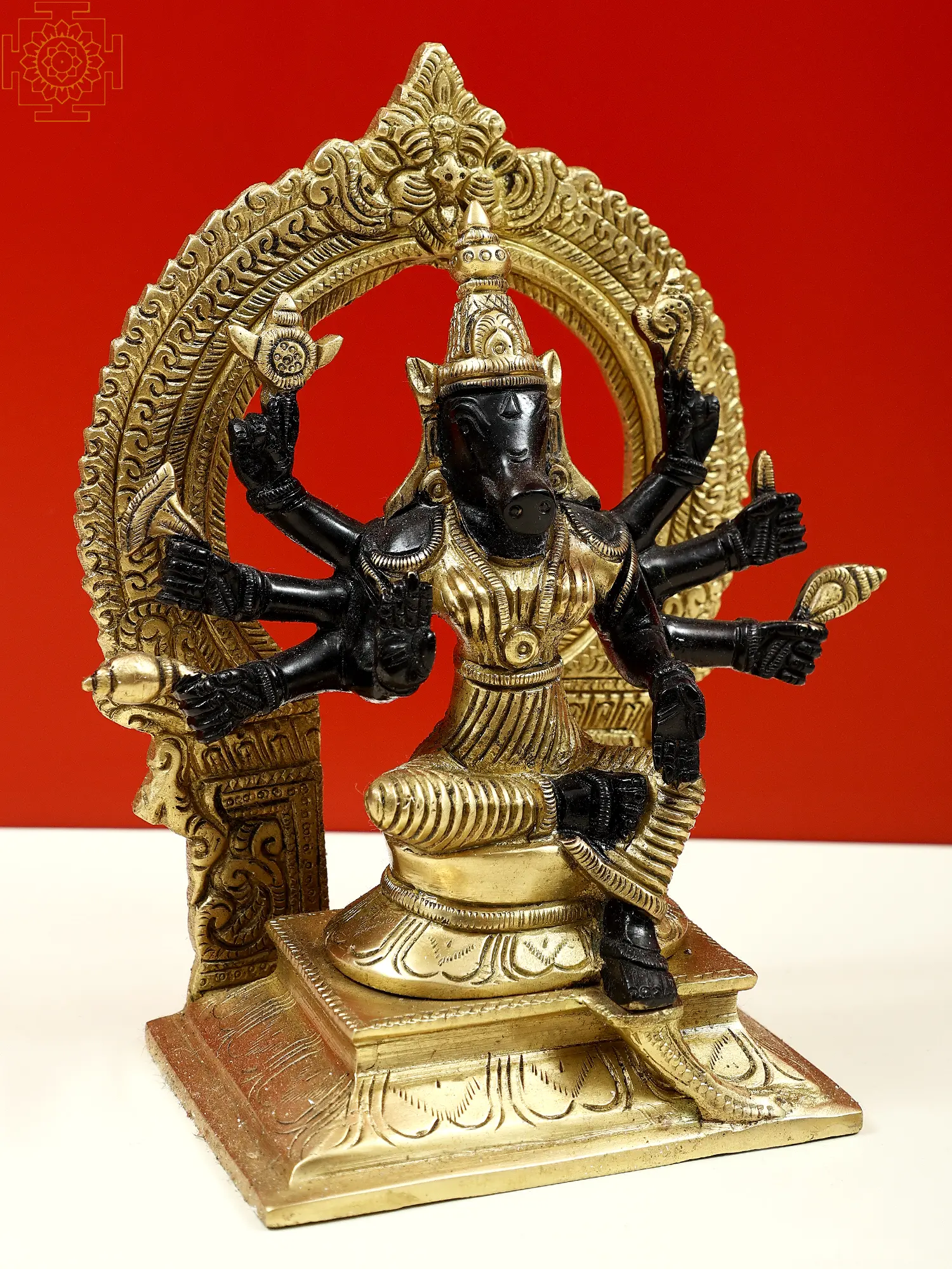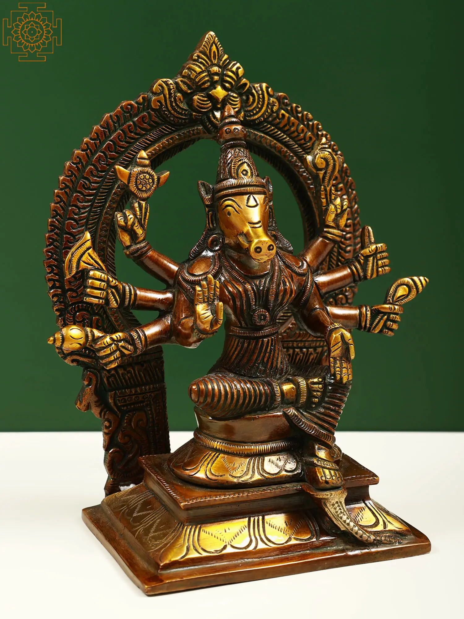 Maa Varahi is the commander of Devi Durga’s divine army of goddesses and the Shakti of Vishnu’s Varaha (boar) avatar. In Hindu Tantra, devotees revered her to attain strength, wisdom, and spiritual upliftment. This small brass statue presents her potent form as an Ashtabhuja (eight-armed) Matrika (mother). Devi Varahi sits on a lotus throne, in the posture of royal ease, surrounded by a Kirtimukha prabhavali, symbolizing the prowess of the great mother goddess.