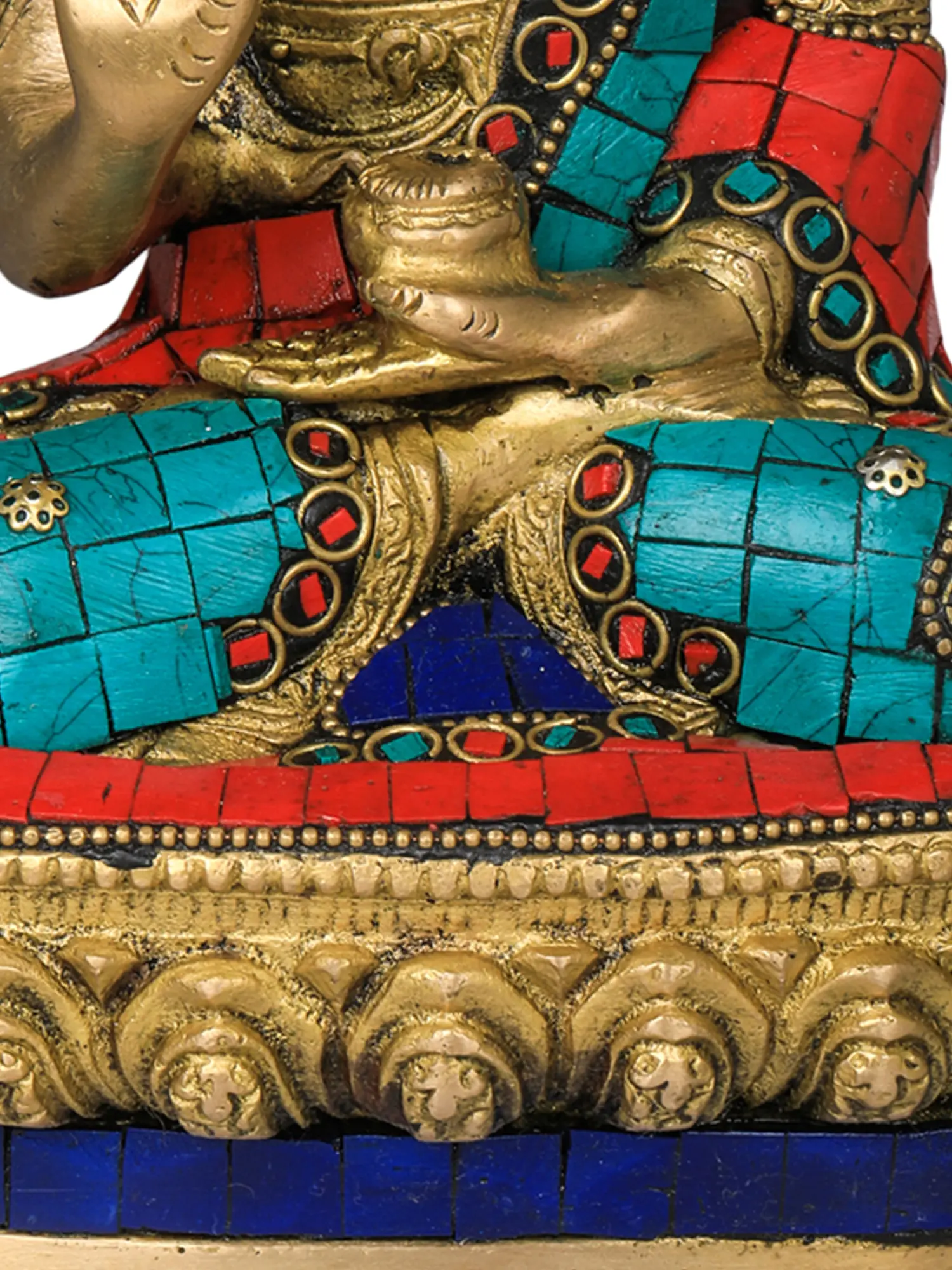 The traditional robes of the deity are adorned with a vibrant inlay of turquoise and red stones, meticulously set into the brass. This rich color palette is not merely decorative; it carries deep symbolic meaning within Tibetan Buddhism. Turquoise, often linked to the heavens and the sky, represents wisdom and the vastness of enlightenment, while red, symbolizing life force and vitality, can also signify compassion and skillful means. The interplay of these colors, bordered by intricate gold detailing, creates a visually captivating spectacle that draws the eye and calms the spirit. The base of the statue further enhances its sacred presence with a deep blue inlay, reminiscent of lapis lazuli, a stone prized for its connection to the celestial and its ability to ward off negative energies.