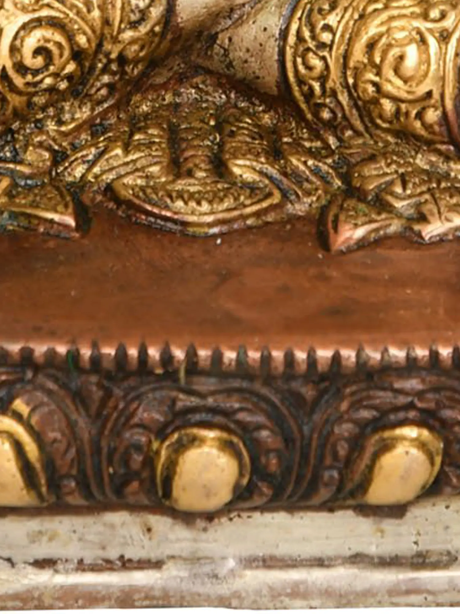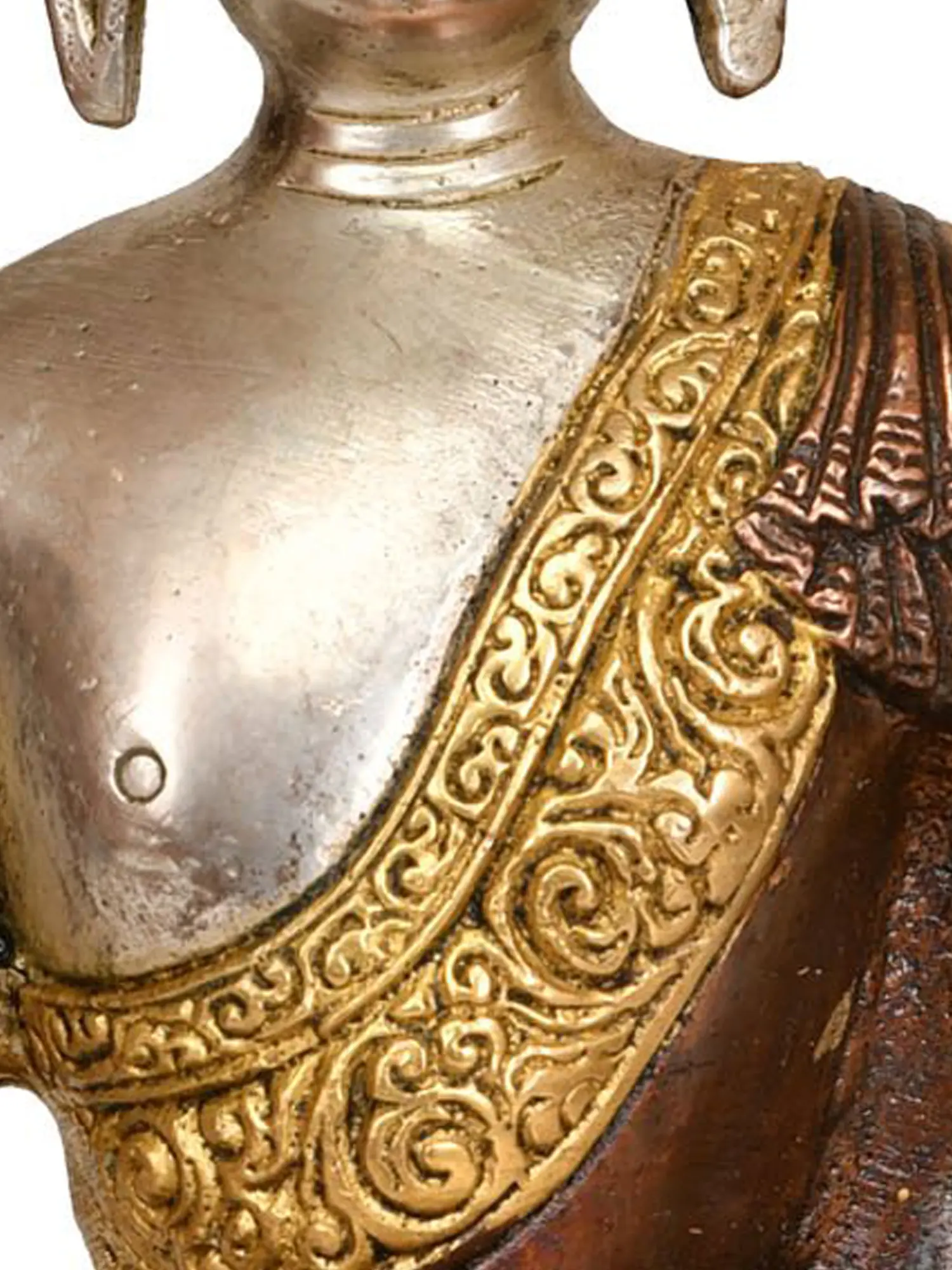 Crafted with meticulous attention to detail in India, this statue is a testament to the enduring tradition of Buddhist iconography and Indian metalwork. The sculptor has masterfully rendered the serene countenance of the Buddha, his eyes gently closed in deep meditation, conveying a sense of inner peace and profound wisdom. The flowing robes are adorned with intricate, hand-chased patterns in a rich gold finish, providing a striking contrast to the lustrous silver patina of the Buddha's form. The base, also richly decorated, provides a stable and ornate pedestal for this sacred representation. The use of brass, a metal associated with durability and auspiciousness, further enhances the statue's spiritual and aesthetic appeal.