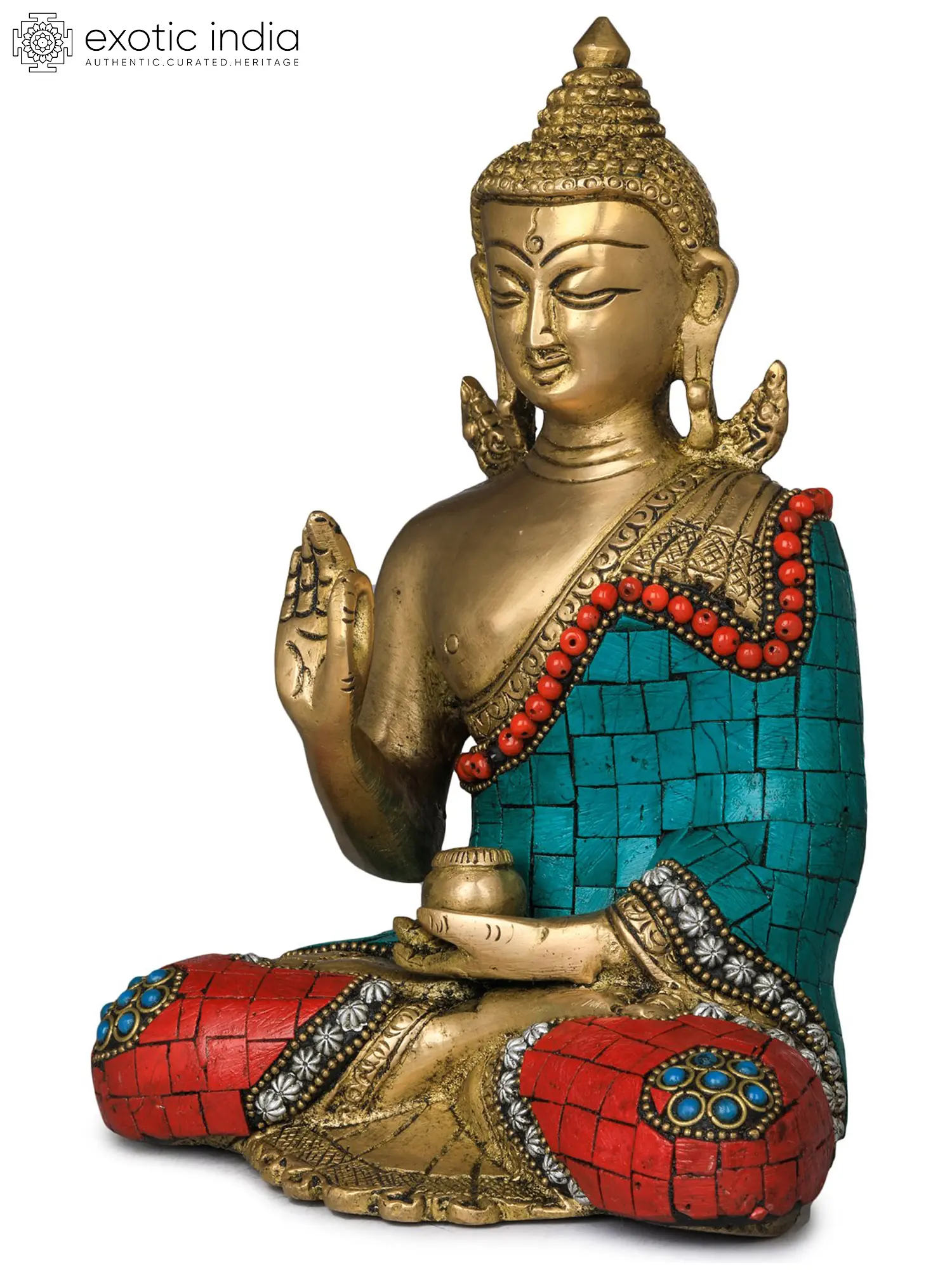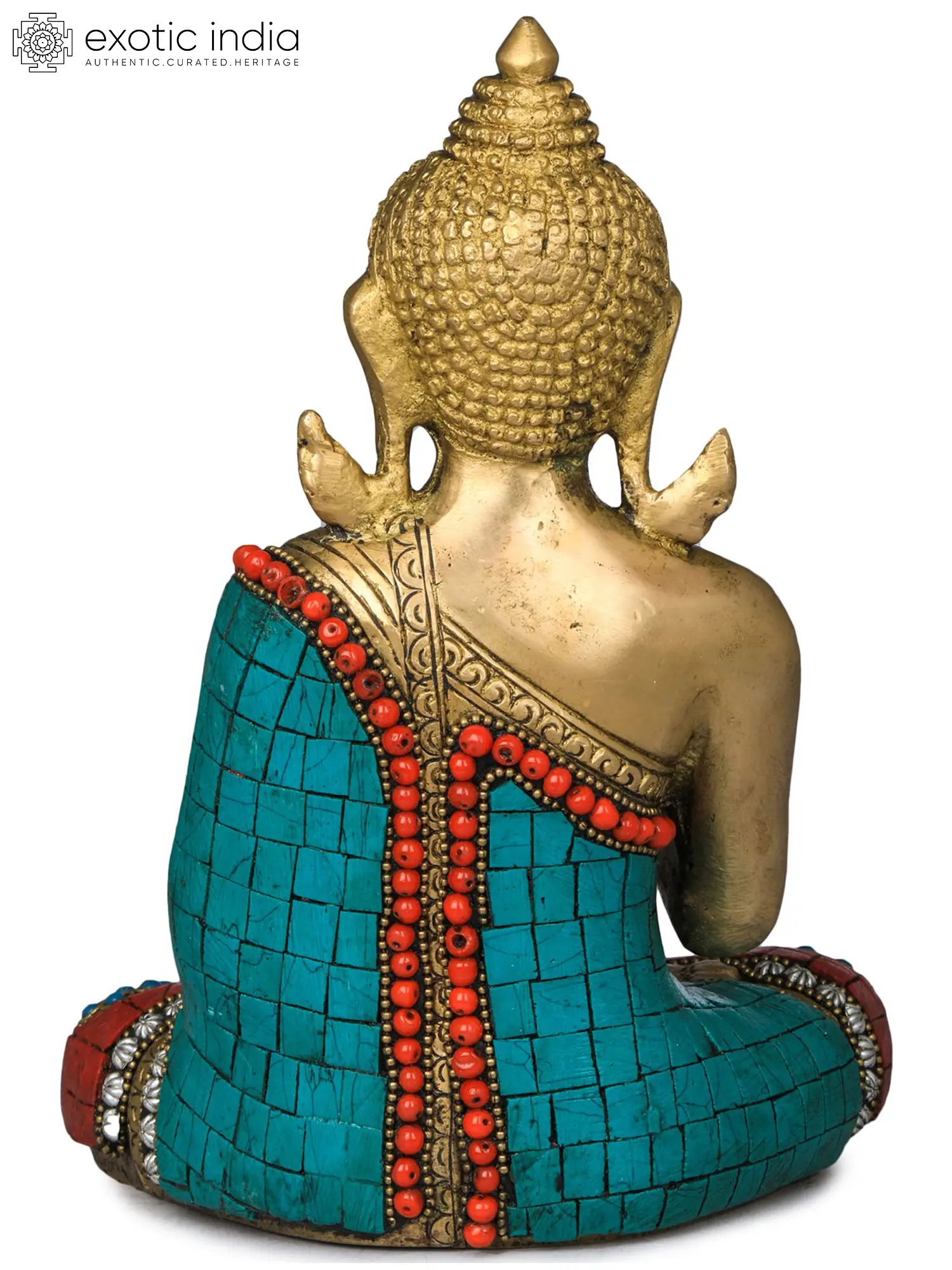 This exquisite brass statue captures the serene and wise demeanor of the Buddha in the Vitark Mudra. The Vitark Mudra, a gesture of discussion and transmission of teachings, is depicted by the right hand raised with the thumb and index finger touching, signifying the flow of wisdom and knowledge. This sacred posture is reminiscent of Buddha's life story, particularly his first sermon at Sarnath, where he expounded the Four Noble Truths, setting in motion the Wheel of Dharma. The delicate inlay work, featuring vibrant turquoise-like stones and striking red accents, adds a regal and ornate touch to the traditional representation. These colorful inlays are not merely decorative; they can be seen as symbolizing the richness and diversity of Buddhist teachings, or perhaps the precious jewels of wisdom being offered. ––––––––––
