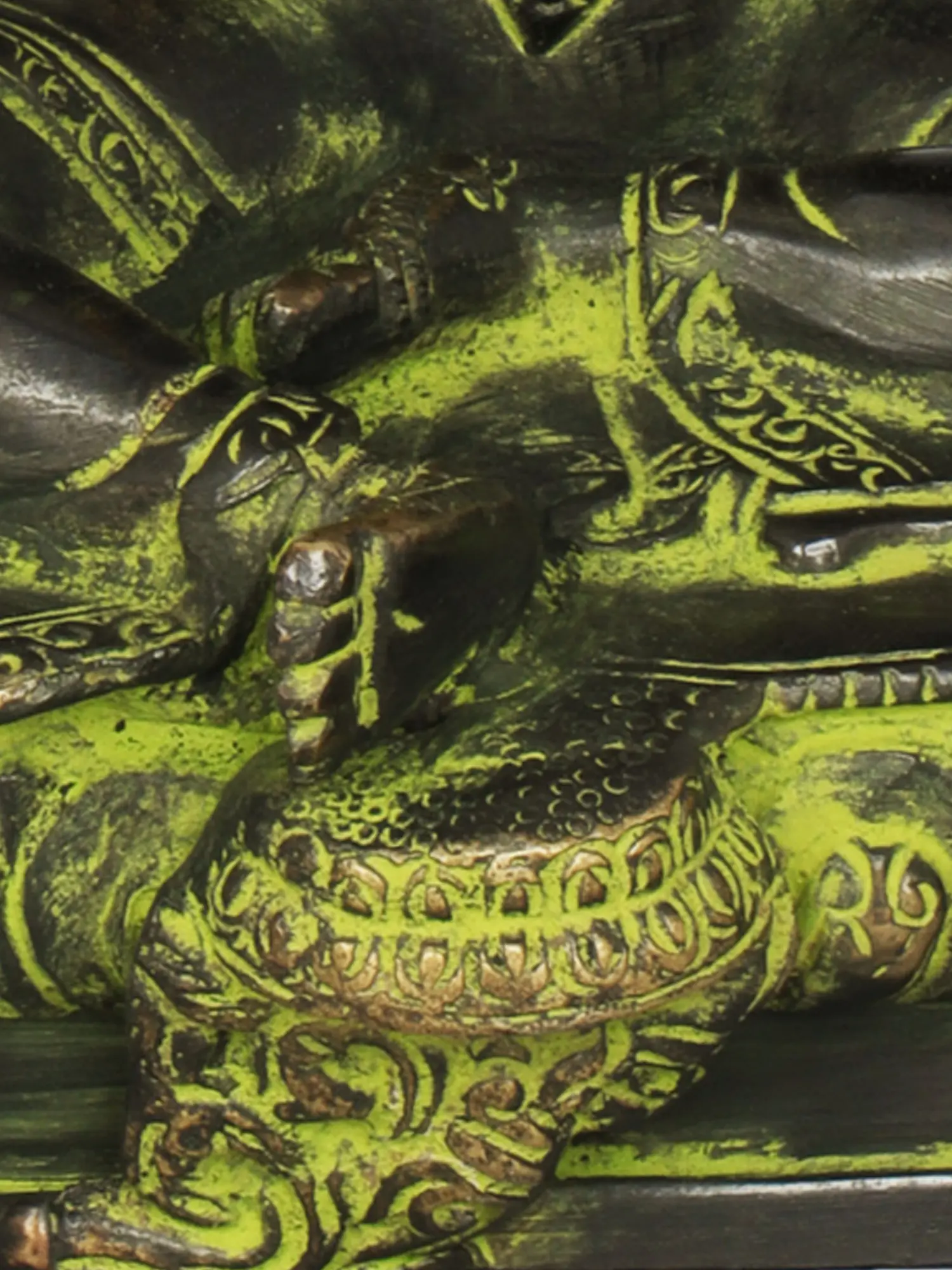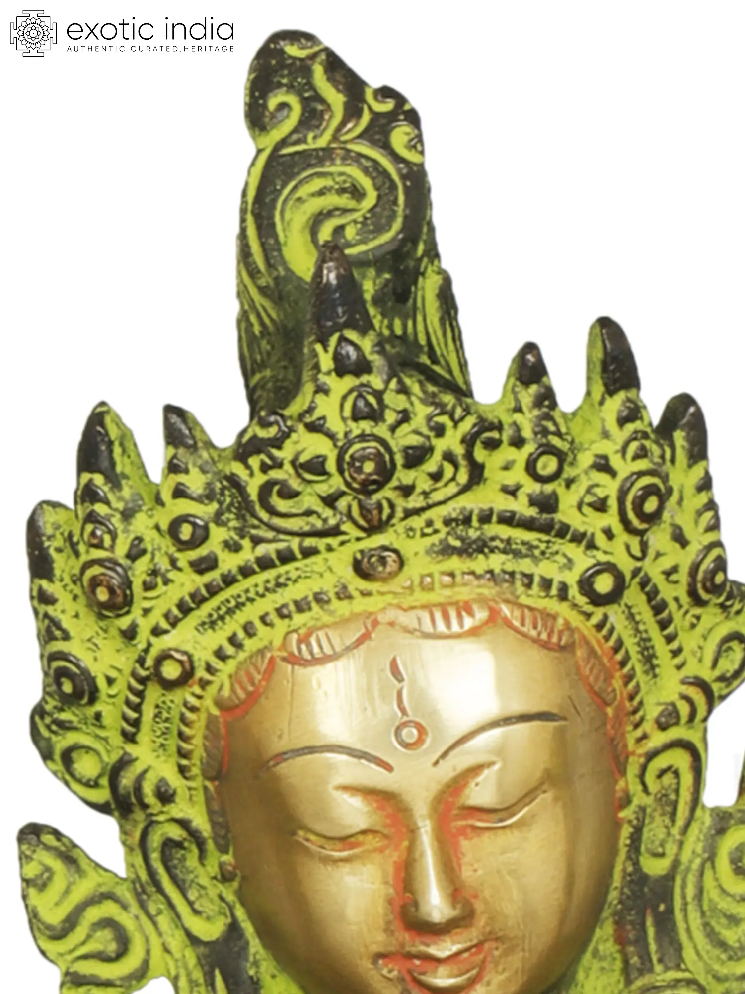 The brass embodiment of Green Tara, the Tibetan Buddhist deity who bestows salvation, is a captivating work of art. Painted with an antique black and silver finish, it exudes timeless elegance. Green Tara, with her compassionate gaze, is adorned with grace. She holds delicate lotus buds, symbols of purity and enlightenment. Her serene countenance and gentle demeanor offer solace and protection to those who seek her aid. This exquisite statue not only represents the divine feminine in Tibetan Buddhism but also serves as a visual testament to hope, compassion, and the ever-present possibility of liberation.