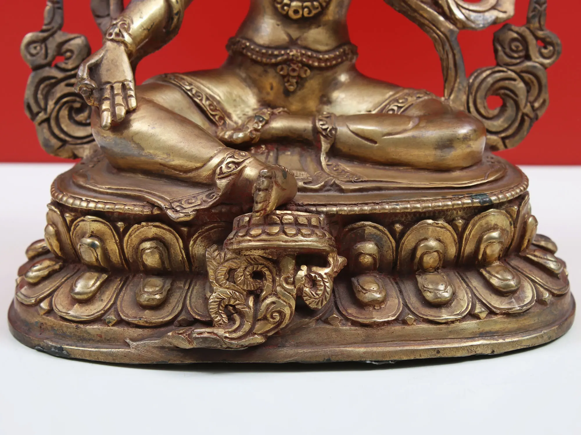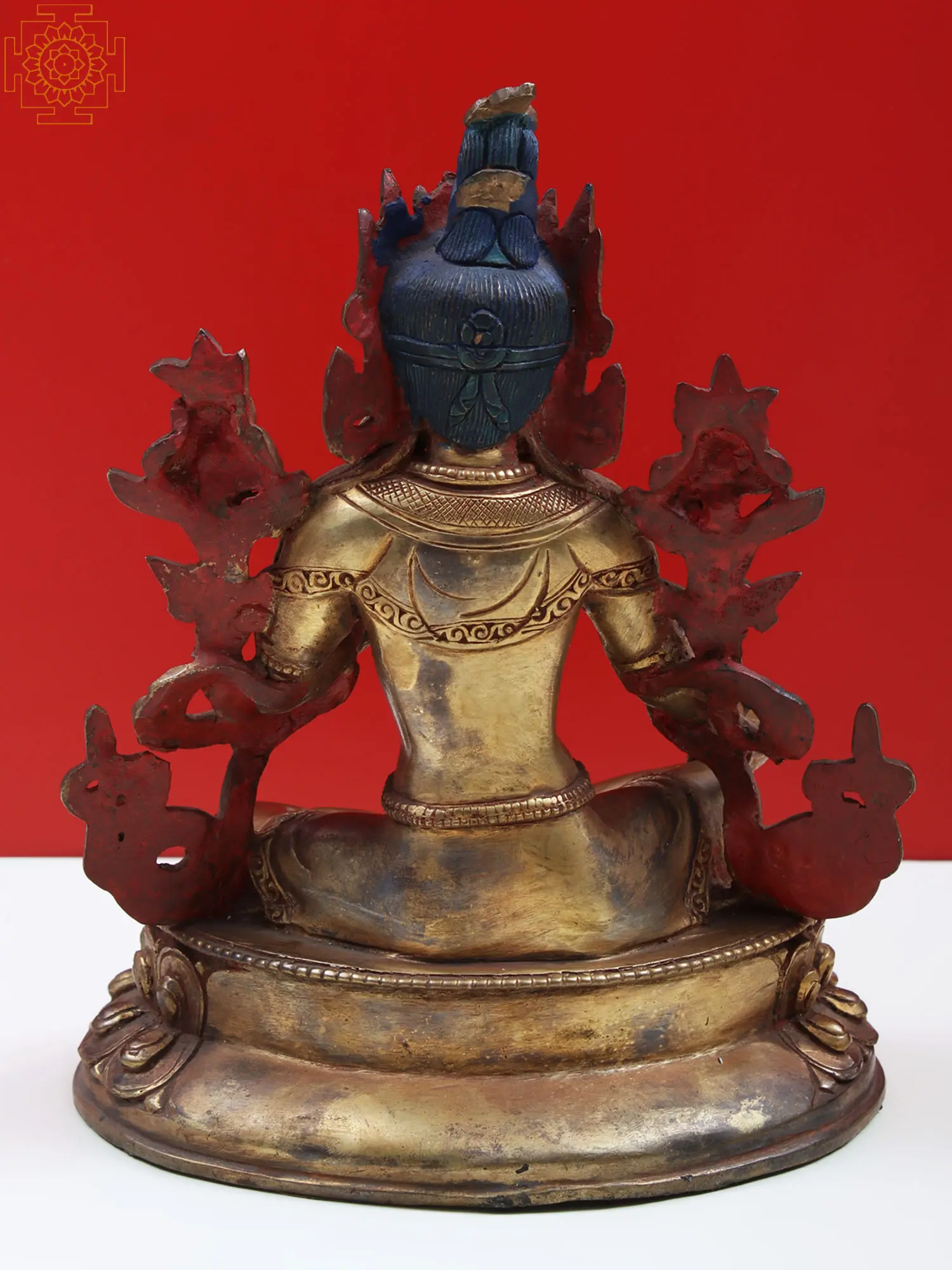 Most people are aware of the legend that Green Tara was born from Bodhisattva Avalokiteshwara's tear, embodying his compassion for humans. In a different interpretation, Tara—the saviouress—was originally a princess known as the "Moon of Knowledge" who developed her meditation skills to the point where she could save souls as a Bodhisattva. The Nepalese Green Tara statue is made of copper and exalts Tara's kindness by depicting her in an alluring way. Tara exudes a divine aura as she sits on a lotus seat appearing as a celestial queen mother.