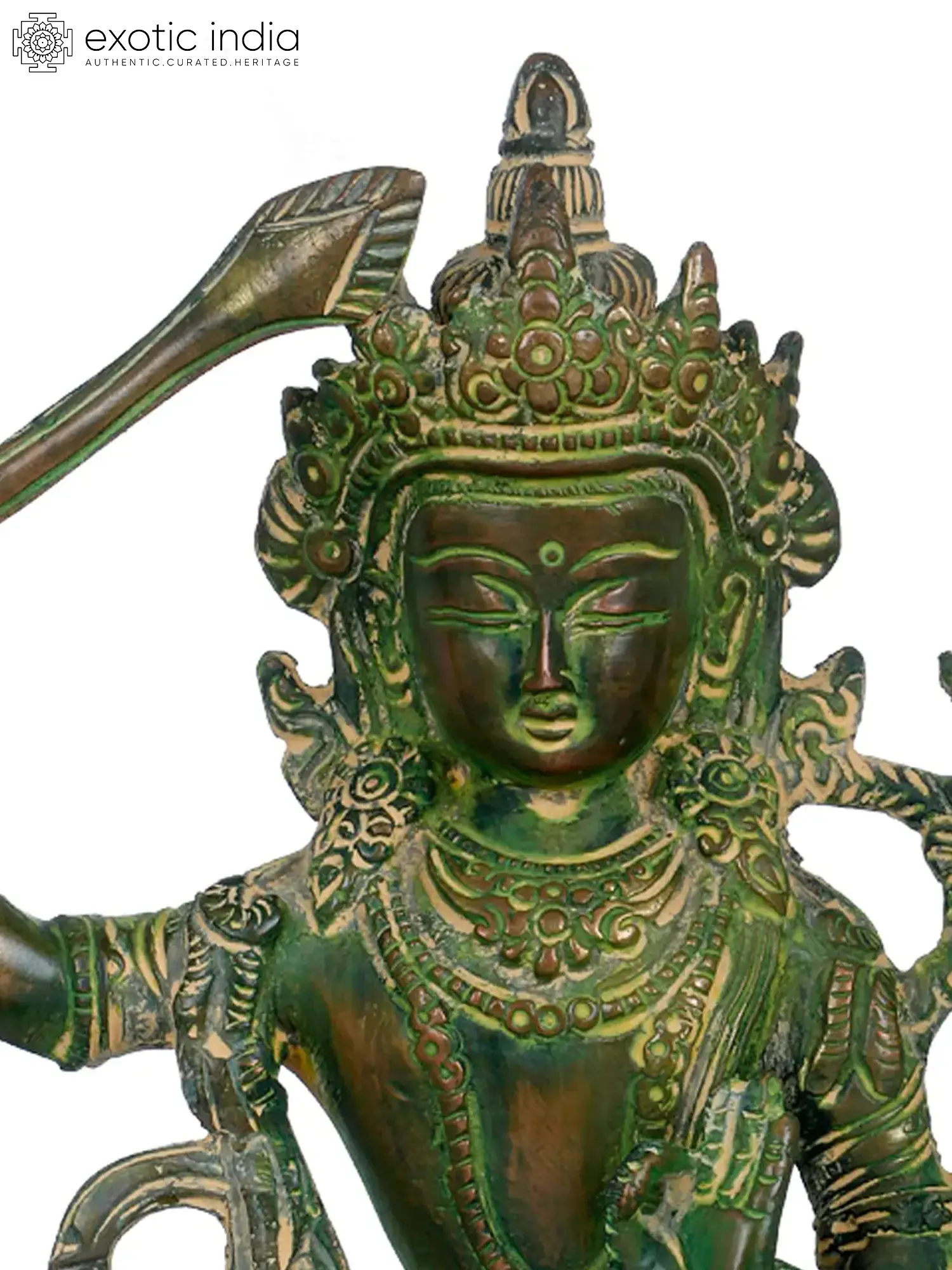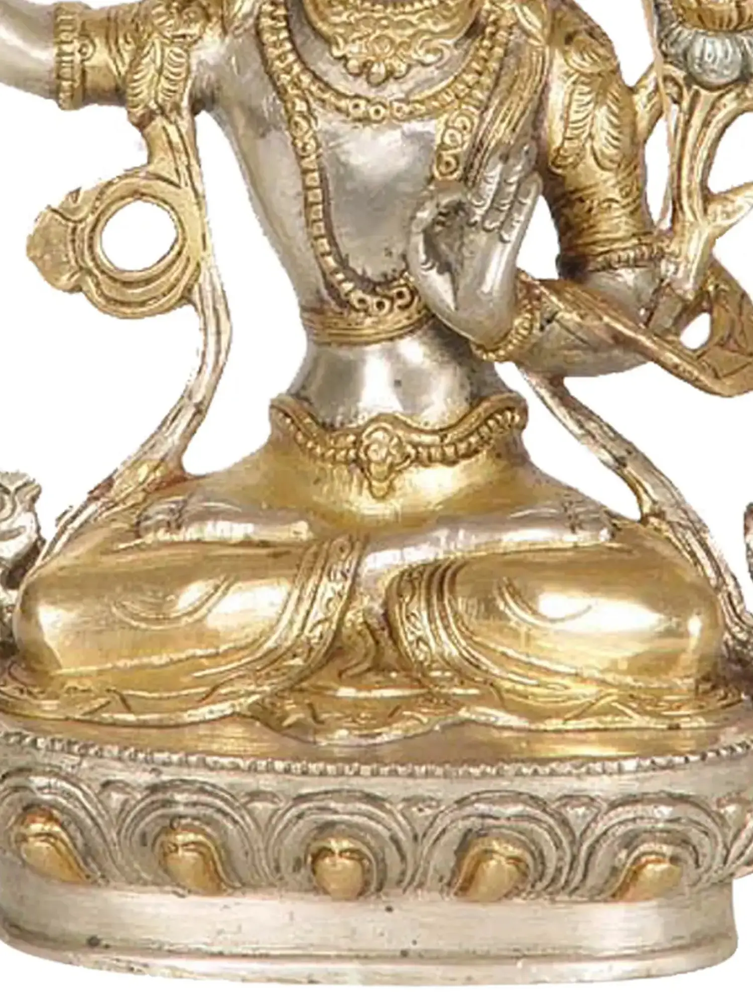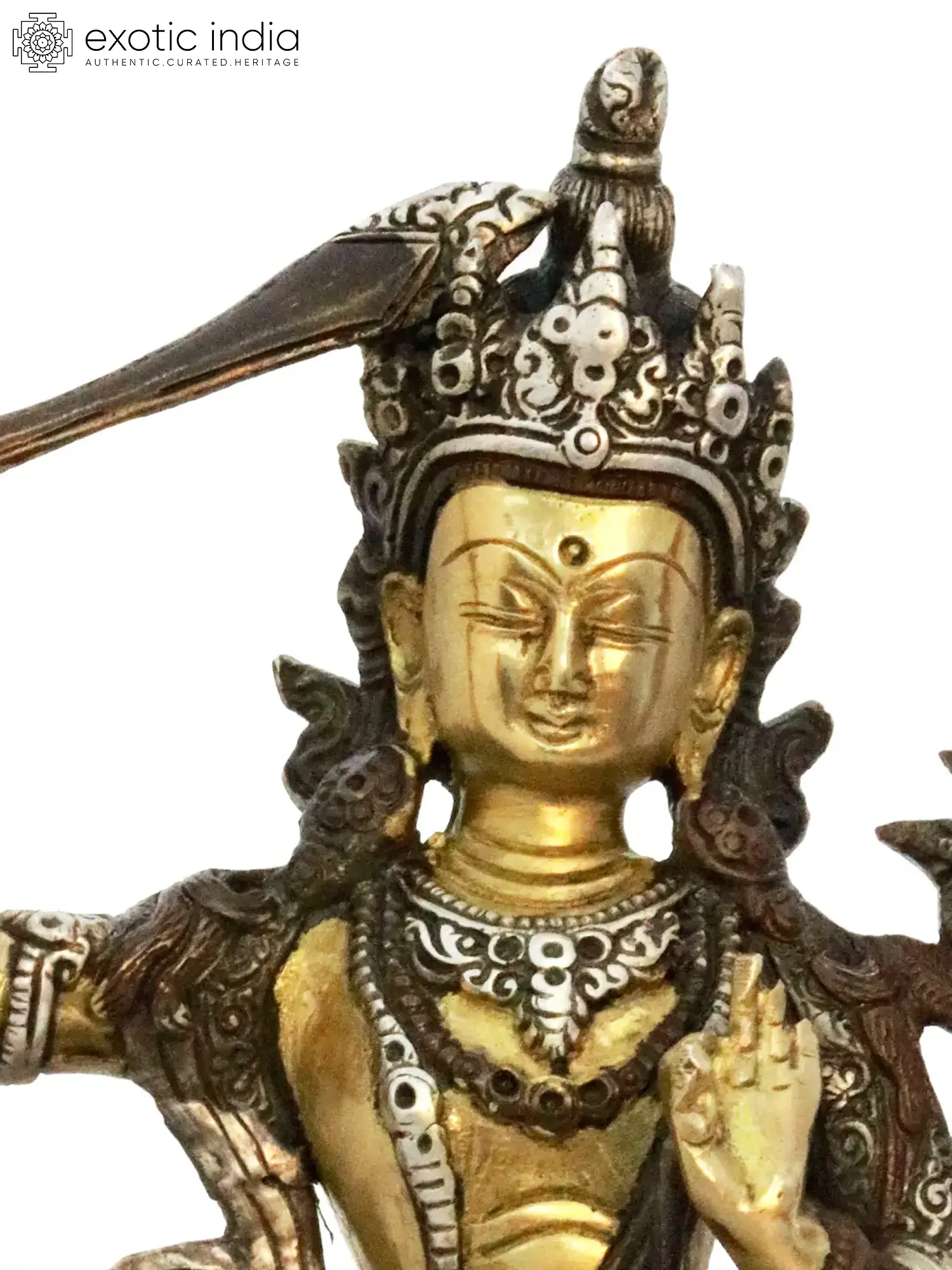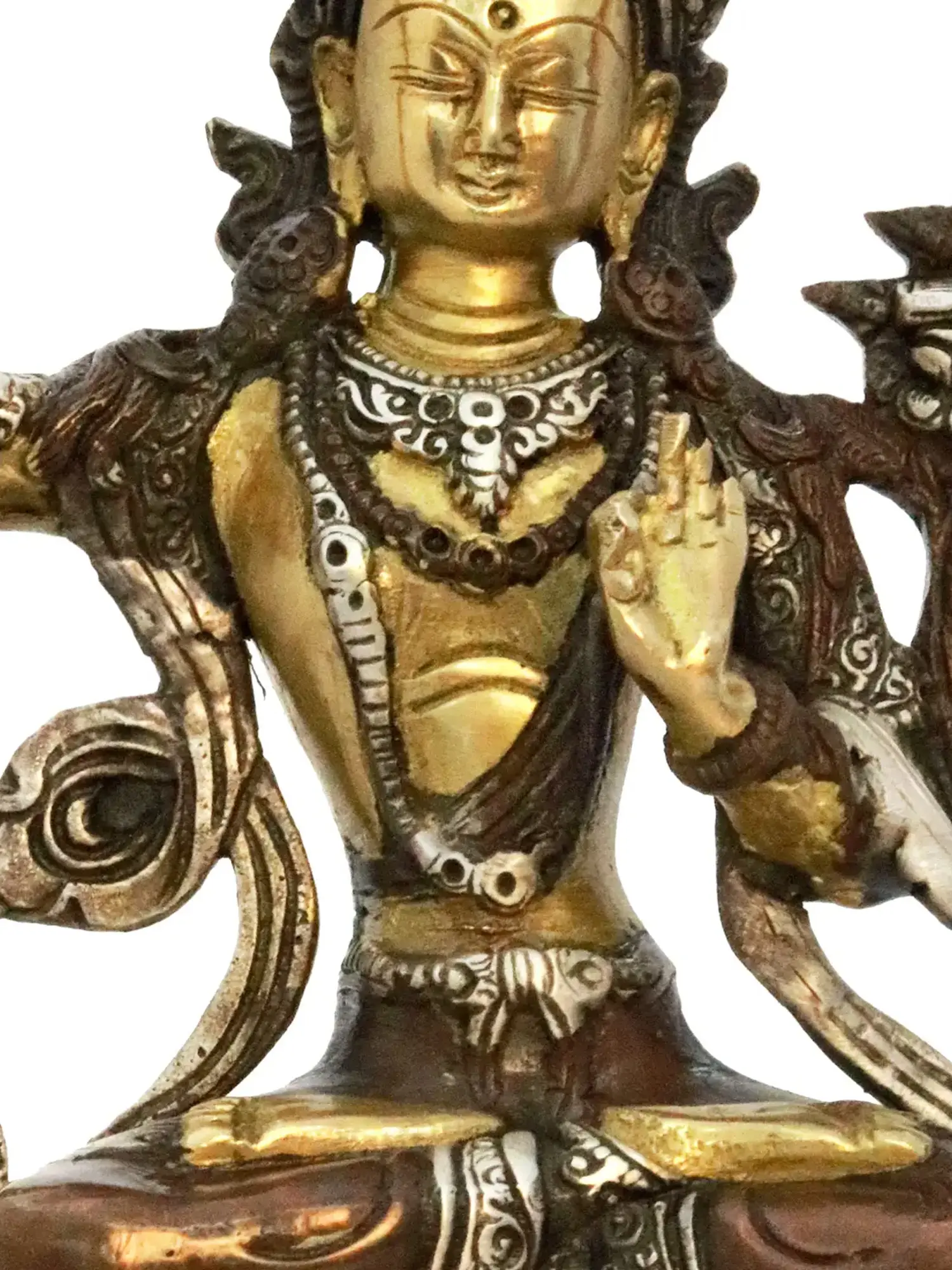 Manjushri, a prominent Tibetan Buddhist deity, embodies the Bodhisattva of Wisdom, signifying the pinnacle of enlightened intellect. Typically portrayed as a youthful figure, he wields a sword in his right hand, symbolizing the power to cut through ignorance, and a lotus in his left, representing compassion. Devotion to Manjushri revolves around the pursuit of wisdom, insight, and a heightened understanding. Practitioners engage in mantra recitations and meditative practices to refine their intellect and inner clarity. Manjushri's importance lies in his role as a spiritual guide, aiding individuals on their journey to enlightenment through the cultivation of wisdom. Tibetan Buddhists hold him in high esteem as a source of inspiration, guiding them in conquering ignorance and reaching profound levels of wisdom and insight on their spiritual path.