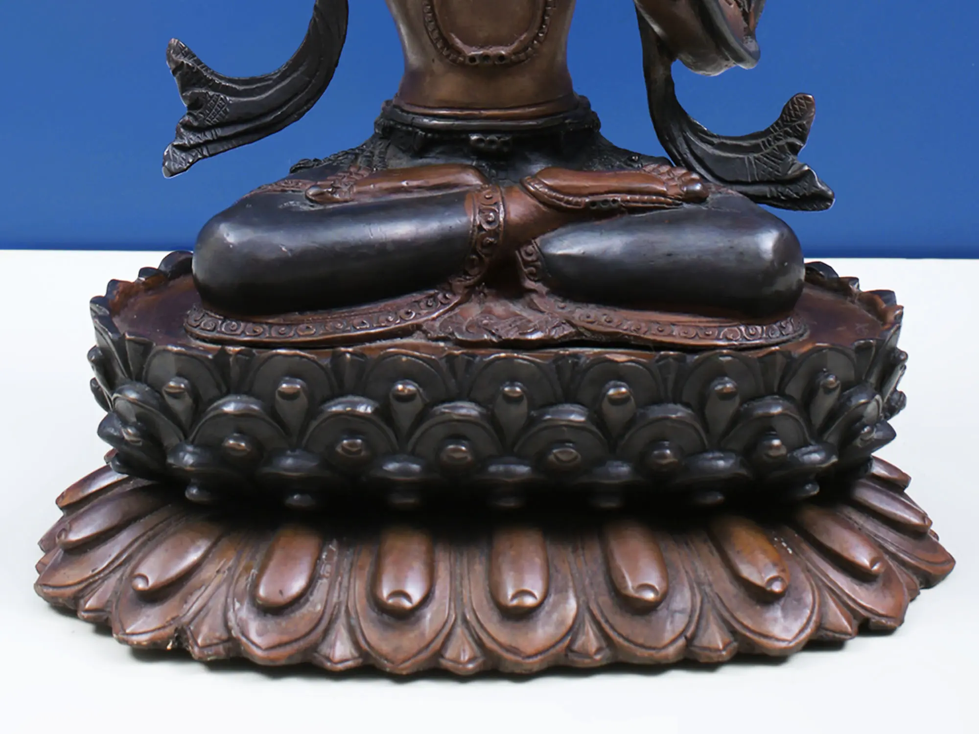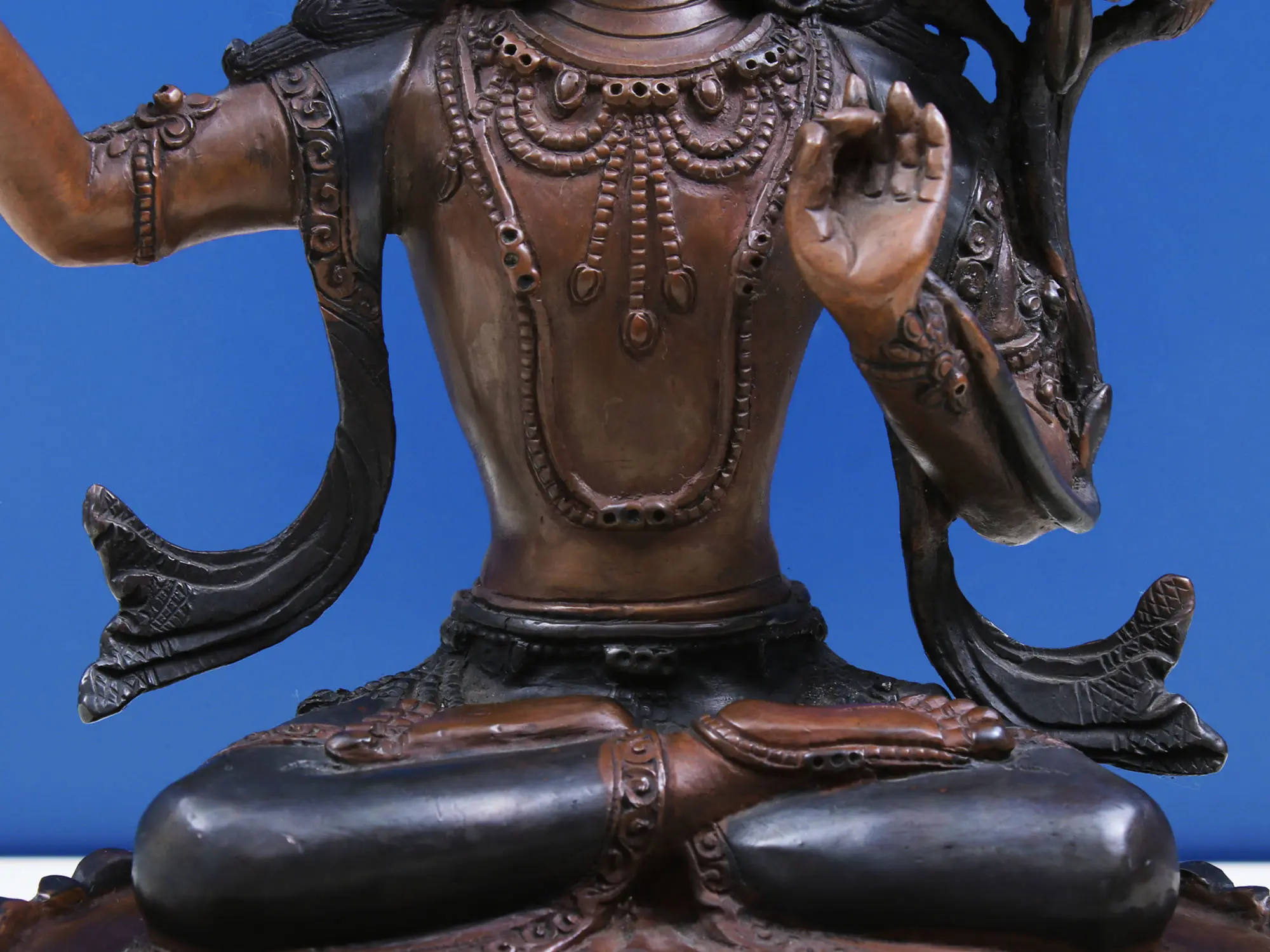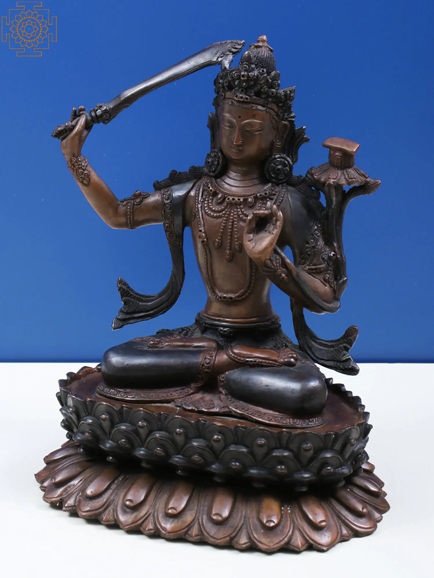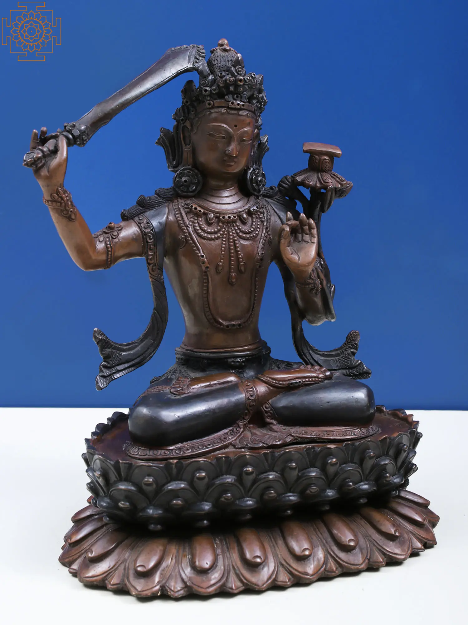 When Buddha asked Manjushri about his wish for enlightenment, he replied that he seeks complete and full enlightenment. He continued by saying that since he perceives no distinction between genuine wisdom and himself, he is not fervently adhering to Enlightenment. With this response, Buddha was extremely happy. Manjushri is seen in Tibetan iconography sitting cross-legged with a sword in his hand that appears to be in motion. He is regarded as having the ability to sever pride and any related ignorance. A similar depiction may be seen on this copper idol, which has Manjushri wearing a crown and exquisite ornaments that enhance his splendor. The Bodhisattva sits unperturbed and concentrated on his mission of purging the world of evil, radiating a cosmic serenity all around.