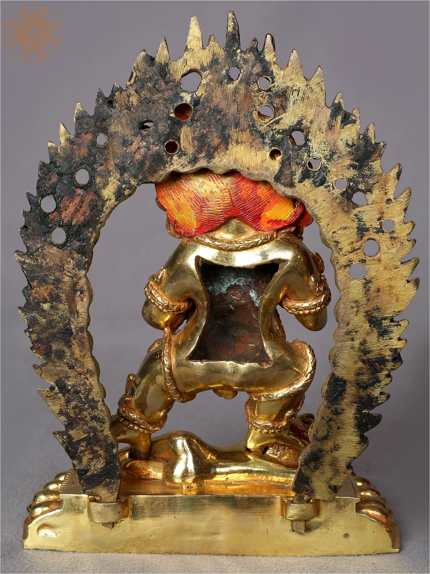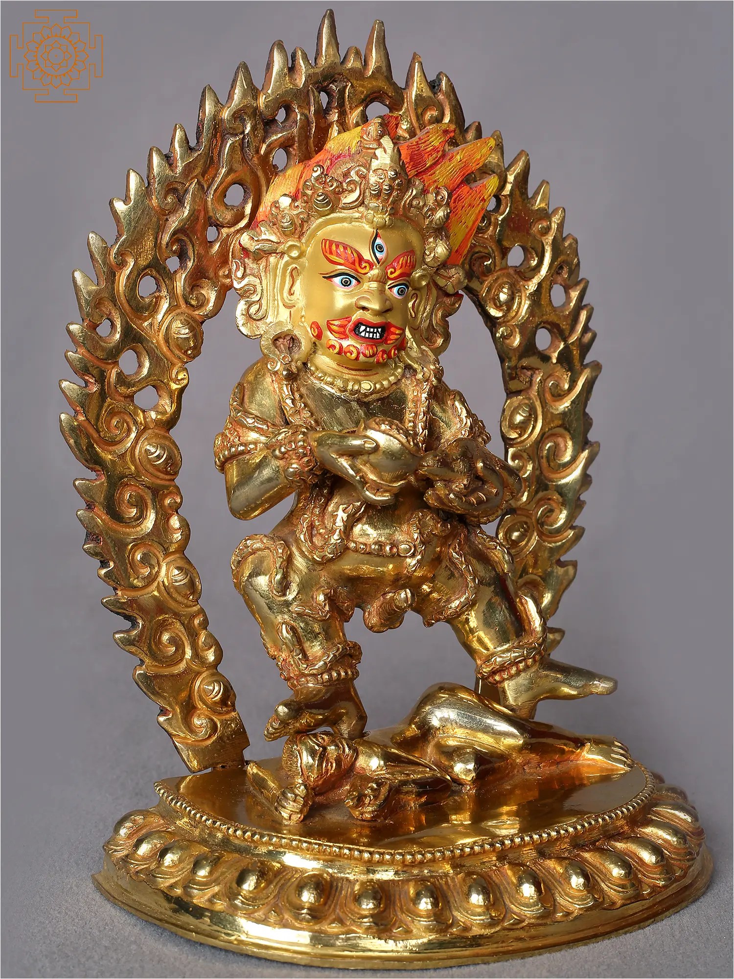 This gilded copper Nepalese statue depicts Vajrapani, the Buddhist vision of Indra, holding the Vajra, a symbol of enlightenment, and the noose, a sign of wisdom's control over the mind, in a dynamic pose. Vajrapani's flaming aureole has been exquisitely presented, and the vibrant red and orange colors used on his flaming hair perfectly convey the light of wisdom that it stands for. Quelling the enemies of Dhamma under his feet and gazing unwaveringly at the devotee, Vajrapani in this form enchants the mind away from the ceaseless movement of the Samsara.